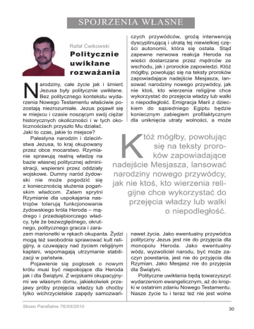 SPOJRZENIA WŁASNE Rafał Ćwikowski N Politycznie uwikłane rozważania arodziny, całe życie jak i śmierć Jezusa były politycznie uwikłane. Bez politycznego kontekstu wydarzenia Nowego Testamentu właściwie pozostają niezrozumiałe. Jezus pojawił się w miejscu i czasie noszącym swój ciężar historycznych okoliczności i w tych okolicznościach przyszło Mu działać. Jaki to czas, jakie to miejsce? Palestyna narodzin i dzieciństwa Jezusa, to kraj okupowany przez obce mocarstwo. Rzymianie sprawują realną władzę na bazie własnej politycznej administracji, wspierani przez oddziały wojskowe. Dumny naród żydowski nie może pogodzić się z koniecznością służenia pogańskim władcom. Zatem sprytni Rzymianie dla uspokajania nastrojów tolerują funkcjonowanie żydowskiego króla Heroda – mądrego i przedsiębiorczego władcy, tyle że bezwzględnego, okrutnego, politycznego gracza i zarazem marionetki w rękach okupanta. Żydzi mogą też swobodnie sprawować kult religijny, a czuwający nad życiem religijnym kapłani, wspomagają utrzymanie stabilizacji w państwie. Pojawienie się pogłosek o nowym królu musi być niepokojące dla Heroda jak i dla Świątyni. Z wojskami okupacyjnymi we własnym domu, jakiekolwiek przejawy próby przejęcia władzy lub choćby tylko wichrzycielskie zapędy samozwańSłowo Parafialne 76/XII/2010 czych przywódców, grożą interwencją dyscyplinującą i utratą tej niewielkiej części autonomii, która się ostała. Stąd zapewne nerwowa reakcja Heroda na wieści dostarczane przez mędrców ze wschodu, jak i prorockie zapowiedzi. Któż mógłby, powołując się na teksty proroków zapowiadające nadejście Mesjasza, lansować narodziny nowego przywódcy, jak nie ktoś, kto wierzenia religijne chce wykorzystać do przejęcia władzy lub walki o niepodległość. Emigracja Marii z dzieckiem do sąsiedniego Egiptu będzie koniecznym zabiegiem profilaktycznym dla uniknięcia utraty wolności, a może nawet życia. Jako ewentualny przywódca polityczny Jezus jest nie do przyjęcia dla monopolu Heroda. Jako ewentualny wódz, wyzwoliciel narodu, być może zaczyn powstania, jest nie do przyjęcia dla Rzymian. Jako Mesjasz nie do przyjęcia dla Świątyni. Polityczne uwikłania będą towarzyszyć wydarzeniom ewangelicznym, aż do kropki w ostatnim zdaniu Nowego Testamentu. Nasze życie tu i teraz też nie jest wolne 30 Spojrzenia własne od polityki. Choć często wydarzenia polityczne budzą naszą niechęć, to nie możemy być obojętni na to, co dzieje się w orbicie naszego funkcjonowania. Czy w tej dziedzinie życia można liczyć na jakiś etyczny niepisany kodeks postępowania, który tę dziedzinę życia okiełzna? Czy może raczej liczy się sukces osiągnięty na dowolnie moralnej drodze, byle prowadzącej do zwycięstwa? Polityczne uwikłania współcześnie K wiekiem dzieci. Wmawiają nam, że świat jest nasz albo ich, że są na świecie media jedynie słuszne, że prawdziwi dziennikarze to ci, których wyrzucono z telewizji lub ci, którzy pracują w jedynie słusznej telewizji. Dramat polityki polega na tym, że opozycjonista, w dziwnym uporze traktowania wyborców jak niespełna rozumu, musi w każdym oddechu rządzących z zasady wyczuć podstęp i kłamstwo, a nam szarym ludziom próbuje wmówić, że dziwnym zrządzeniem losu wszyscy zbawcy narodu, mędrcy i posiadacze cudownych recept skupili się w opozycji i tylko tam. iedy obserwuję rządzących i opozycję, odnoszę wrażenie, że dorośli Politycznie i inteligentni ludzie traktują mnie jak naiwne dziecko. Otóż, zdaniem polityków uwikłany kościół opozycji, mam uwierzyć, że całe zło tego świata pochodzi od władzy aktualnie nam odobnie się mają sprawy z członkapanującej. Natomiast całe dobro i mąmi kościoła rzymskokatolickiego. drość stworzenia skupiło się jakimś Otóż obserwuję zadziwiający brak cudem w osobach opozycji, którym nie samodzielnego krytycznego myślenia dano szansy na zbawienie ludzkości. Ten u ludzi naprawdę myślących. Analizując kto rządzi z zasady jest w błędzie. Ten kto literaturę i prasę katolicką zastanawiam chce rządzić to gladiator w dobrej spra- się, czy w ogóle ktoś zadaje sobie trud wie, który prędzej umrze niż przyzna, że analizy wypowiedzi swoich duchowych polityczny przeciwnik ma choćby cień pasterzy. racji w tym, co robi. Kiedy Jan Paweł II ekskomunikował Wydawałoby się, że świat jest czarno skrajnych katolickich konserwatystów, biały w oczach ludzi z wykzgodnie komentowano, że ształceniem podstawowym, nie mógł uczynić inaczej. z małych miasteczek lub wsi, Owi konserwatyści zgodnie w wieku, w którym nosi się ze swoim sumieniem oraz ciepłe berety. Otóż ludzie w poczuciu misji ratowania w sile wieku, z wykształcekatolicyzmu przed proteniem wyższym (a nawet tytustantyzmem sami wyłączyli łem profesorskim), z dużym się z kościoła, wyświęcając metropolii, skądinąd wybitni biskupów bez zgody Rzyspecjaliści swoich zawodomu. Ale kiedy Benedykt XVI wych dziedzin, nagle w teprzywrócił ich do łączności macie polityka, zachowują z kościołem, te same katosię jak naiwne swym młodym lickie media tłumaczyły, że Herod Wielki Słowo Parafialne 76/XII/2010 P 31 Narodzenie Pańskie 2010 wywiadem. A jednak moto piękny ojcowski gest żna być bardziej papieprzygarnięcia zagubioskim niż sam papież. nych owieczek (choć jedMożna podać wiele na z tych owieczek w ranprzykładów braku krydze biskupa do dziś potycznej refleksji u ludzi, pełnia kłamstwo oświęktórzy za wszelką cenę cimskie). muszą przed samym soKiedy zarzucano kośbą i światem uzasadnić, ciołowi rzymskiemu proże ich autorytet religijny blem pedofilii wśród księi duchowy nigdy się nie ży, okrzyknięto takie „inmyli, podać można wiele. synuacje” próbą dyskreCzęsto ludzie zadają dytowania dobrego imieWizualizacja Świątyni Opatrzności pytanie jak zostałby p