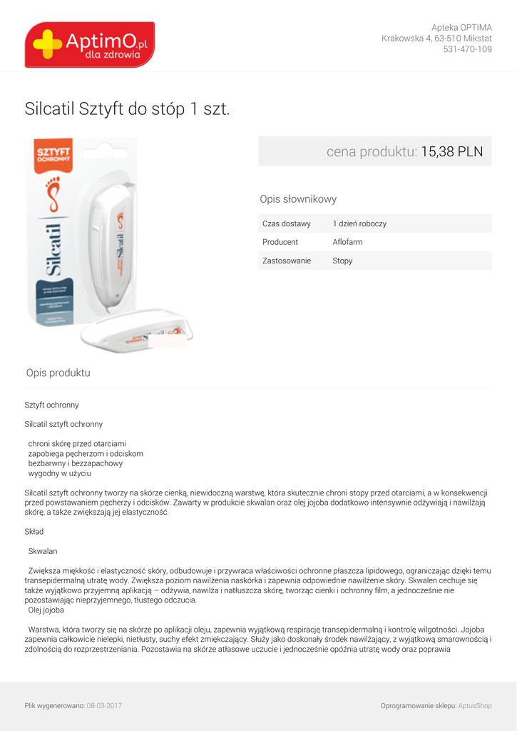 Apteka OPTIMA Krakowska 4, 63-510 Mikstat 531-470-109 Silcatil Sztyft do stóp 1 szt. cena produktu: 15,38 PLN Opis słownikowy Czas dostawy 1 dzień roboczy Producent Aflofarm Zastosowanie Stopy Opis produktu Sztyft ochronny Silcatil sztyft ochronny chroni skórę przed otarciami zapobiega pęcherzom i odciskom bezbarwny i bezzapachowy wygodny w użyciu Silcatil sztyft ochronny tworzy na skórze cienką, niewidoczną warstwę, która skutecznie chroni stopy przed otarciami, a w konsekwencji przed powstawaniem pęcherzy i odcisków. Zawarty w produkcie skwalan oraz olej jojoba dodatkowo intensywnie odżywiają i nawilżają skórę, a także zwiększają jej elastyczność. Skład Skwalan Zwiększa miękkość i elastyczność skóry, odbudowuje i przywraca właściwości ochronne płaszcza lipidowego, ograniczając dzięki temu transepidermalną utratę wody. Zwiększa poziom nawilżenia naskórka i zapewnia odpowiednie nawilżenie skóry. Skwalen cechuje się także wyjątkowo przyjemną aplikacją – odżywia, nawilża i natłuszcza skórę, tworząc cienki i ochronny film, a jednocześnie nie pozostawiając nieprzyjemnego, tłustego odczucia. Olej jojoba Warstwa, która tworzy się na skórze po aplikacji oleju, zapewnia wyjątkową respirację transepidermalną i kontrolę wilgotności. Jojoba zapewnia całkowicie nielepki, nietłusty, suchy efekt zmiękczający. Służy jako doskonały środek nawilżający, z wyjątkową smarownością i zdolnością do rozprzestrzeniania. Pozostawia na skórze atłasowe uczucie i jednocześnie opóźnia utratę wody oraz poprawia Plik wygenerowano: 08-03-2017 Oprogramowanie sklepu: AptusShop Apteka OPTIMA Krakowska 4, 63-510 Mikstat 531-470-109 elastyczność skóry. Plik wygenerowano: 08-03-2017 Powered by TCPDF (www.tcpdf.org) Oprogramowanie sklepu: AptusShop