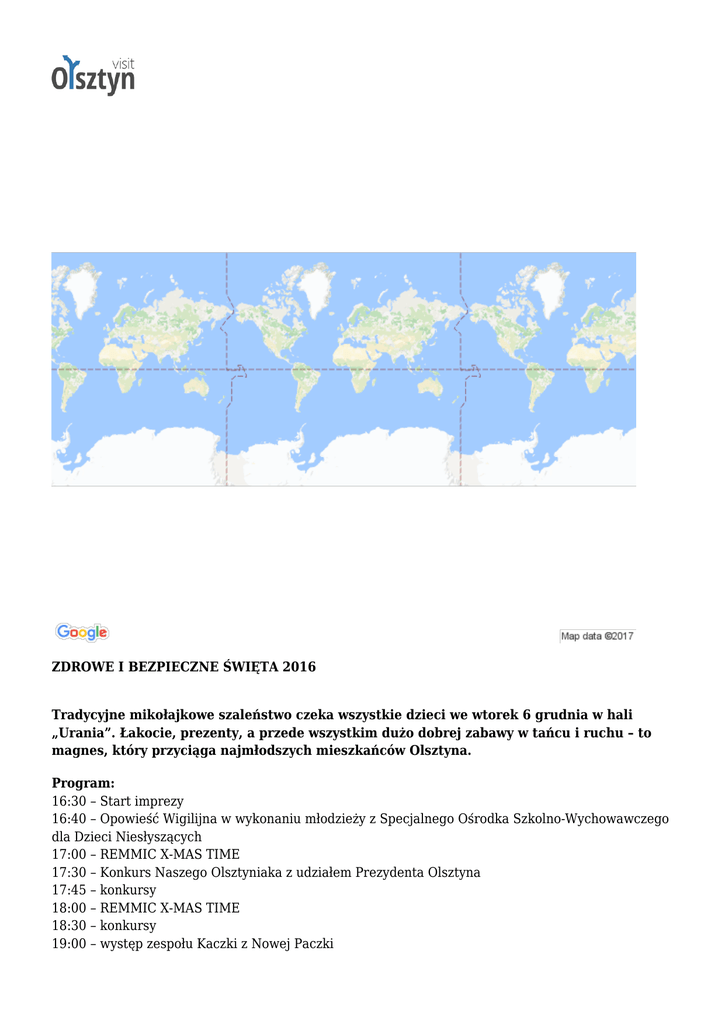 ZDROWE I BEZPIECZNE ŚWIĘTA 2016 Tradycyjne mikołajkowe szaleństwo czeka wszystkie dzieci we wtorek 6 grudnia w hali „Urania”. Łakocie, prezenty, a przede wszystkim dużo dobrej zabawy w tańcu i ruchu – to magnes, który przyciąga najmłodszych mieszkańców Olsztyna. Program: 16:30 – Start imprezy 16:40 – Opowieść Wigilijna w wykonaniu młodzieży z Specjalnego Ośrodka Szkolno-Wychowawczego dla Dzieci Niesłyszących 17:00 – REMMIC X-MAS TIME 17:30 – Konkurs Naszego Olsztyniaka z udziałem Prezydenta Olsztyna 17:45 – konkursy 18:00 – REMMIC X-MAS TIME 18:30 – konkursy 19:00 – występ zespołu Kaczki z Nowej Paczki 19:30 – Zakończenie imprezy W przerwach odbędą się konkursy Miejskiego Zespołu Profilaktyki i Terapii Uzależnień, Wydziału Zarządzania Kryzysowego i Ochrony Ludności UM Olsztyna oraz Policji i Straży Miejskiej. Wszystkie atrakcje dla dzieci gratis: nielimitowana wata cukrowa i popcorn, park rozrywki, spotkanie ze św. Mikołajem. Imprezę organizuje Miejski Zespół Profilaktyki i Uzależnień, Wydział Zarządzania Kryzysowego i Ochrony Ludności Urzędu Miasta Olsztyna oraz policja. Wstęp wolny!!! 1)Hala Widowiskowo-Sportowa URANIA, (2016-12-06 16:30-2016-12-06 19:30) www.visit.olsztyn.eu