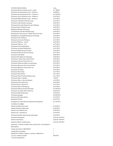 CENNIK MECHANIKA: Cena: Wymiana klocków hamulcowych - przód od 30PLN Wymiana Szczęk hamulcowych - Osobowe od 80PLN Wymiana Szczęk hamulcowych - Ciężarowe od 100 PLN Wymiana Tarczy Hamulcowych - Osobowe od 25 PLN Wymiana Bębna Hamulcowego - Osobowe od 20 PLN Wymiana Cylinderka Hamulcowego od 20 PLN Wymiana Linki hamulca ręcznego od 80 PLN Wymiana Przewodu Hamulcowego Giętkiego od 25 PLN Wymiana Płynu Hamulcowego od 40 PLN Regulacja Hamulca Ręcznego od 28 PLN Uruchomienie Zacisku Hamulcowego od 40 PLN Sprawdzenie Zawieszenia i Układu Kierowniczego od 30 PLN Kompleksowy Przegląd Pojazdu po Przebiegu od 50 PLN Wymiana Tulei Wahacza od 35 PLN Wymiana Sworzenia Wahacza od 35 PLN Wymiana Wahacza - Przód od 40 PLN Wymiana Wahacza - Tył od 70 PLN Wymiana Gumy Stabilizatora od 25 PLN Wymiana Łącznika Stabilizatora od 25 PLN Wymiana Drążka Kierowniczego od 40 PLN Wymiana Końcówki Kierowniczego od 25 PLN Wymiana Tulei Belki od 80 PLN Wymiana Przegubu Zewnętrznego od 60 PLN Wymiana Łożyska Piasty Koła Przód od 80 PLN Wymiana Łożyska Piasty Koła Tył od 45 PLN Wymiana Osłony przegubu zewnętrznego od 50 PLN Wymiana Sprężyny Zawieszenia Przód od 70 PLN Wymiana Sprężyny Zawieszenia Tył od 50 PLN Wymiana Zwrotnicy od 50 PLN Wymiana Filtra Oleju od 10 PLN Wymiana Filtra Paliwa od 15 PLN Wymiana Filtra Powietrza/Kabinowego od 15 PLN Wymiana Oleju w Silniku 30 PLN Wymiana Oleju w Skrzyni Biegów od 30 PLN Wymiana Świec Iskrowych od 20 PLN Wymiana Świec Żarowych od 15 PLN Wymiana Płynu Chłodzącego od 30 PLN Wymiana Paska/Łańcucha Rozrządu od 180 PLN Wymiana Uszczelki Miski Olejowej od 80 PLN Wymiana Paska Klinowego od 20 PLN Wymiana Sprzęgła od 200 PLN Wymiana Zbiornika Paliwa od 70 PLN Regulacja Świateł od 20 PLN Kompleksowe Sprawdzenie Pojazdu Przed Kupnem od 120 PLN CENNIK TŁUMIKI: Montaż tłumika końcowego od 30 PLN Montaż tłumika środkowego od 40 PLN Montaż rury kolektorowej od 40 PLN Montaż rury wydechowej od 30 PLN Wymiana łącznika elastycznego spawanego od 60 PLN Wymiana katalizatora od 40 do 150 PLN Montaż strumienicy od 40 do 100 PLN Naprawa układu wydechowego od 20 do 100 PLN (spawanie, wstawka kawałka rurki, prostowanie, uszczelnianie) PONADTO: Usługi spawalnicze MIGOMAT * Usługi klejenia plastiku * Blacharstwo (drobne naprawy, remonty, nadbudowy) * wyceny, ustalenia usterek GRATIS *ceny do uzgodnienia