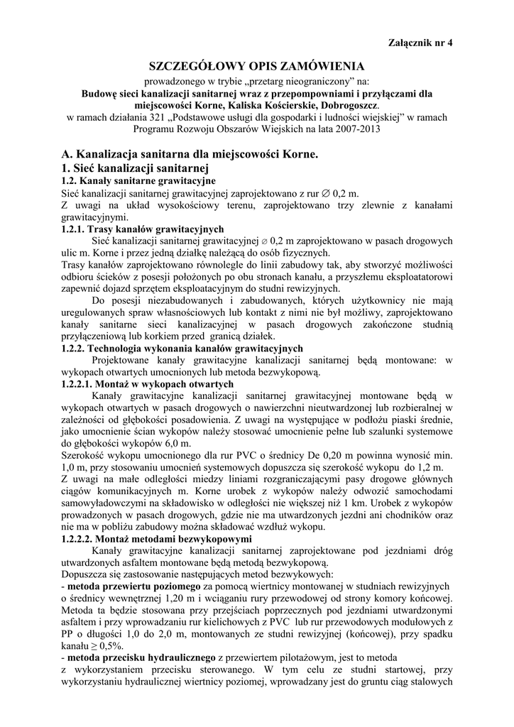 Załącznik nr 4 SZCZEGÓŁOWY OPIS ZAMÓWIENIA prowadzonego w trybie „przetarg nieograniczony” na: Budowę sieci kanalizacji sanitarnej wraz z przepompowniami i przyłączami dla miejscowości Korne, Kaliska Kościerskie, Dobrogoszcz. w ramach działania 321 „Podstawowe usługi dla gospodarki i ludności wiejskiej” w ramach Programu Rozwoju Obszarów Wiejskich na lata 2007-2013 A. Kanalizacja sanitarna dla miejscowości Korne. 1. Sieć kanalizacji sanitarnej 1.2. Kanały sanitarne grawitacyjne Sieć kanalizacji sanitarnej grawitacyjnej zaprojektowano z rur ∅ 0,2 m. Z uwagi na układ wysokościowy terenu, zaprojektowano trzy zlewnie z kanałami grawitacyjnymi. 1.2.1. Trasy kanałów grawitacyjnych Sieć kanalizacji sanitarnej grawitacyjnej ∅ 0,2 m zaprojektowano w pasach drogowych ulic m. Korne i przez jedną działkę naleŜącą do osób fizycznych. Trasy kanałów zaprojektowano równolegle do linii zabudowy tak, aby stworzyć moŜliwości odbioru ścieków z posesji połoŜonych po obu stronach kanału, a przyszłemu eksploatatorowi zapewnić dojazd sprzętem eksploatacyjnym do studni rewizyjnych. Do posesji niezabudowanych i zabudowanych, których uŜytkownicy nie mają uregulowanych spraw własnościowych lub kontakt z nimi nie był moŜliwy, zaprojektowano kanały sanitarne sieci kanalizacyjnej w pasach drogowych zakończone studnią przyłączeniową lub korkiem przed granicą działek. 1.2.2. Technologia wykonania kanałów grawitacyjnych Projektowane kanały grawitacyjne kanalizacji sanitarnej będą montowane: w wykopach otwartych umocnionych lub metoda bezwykopową. 1.2.2.1. MontaŜ w wykopach otwartych Kanały grawitacyjne kanalizacji sanitarnej grawitacyjnej montowane będą w wykopach otwartych w pasach drogowych o nawierzchni nieutwardzonej lub rozbieralnej w zaleŜności od głębokości posadowienia. Z uwagi na występujące w podłoŜu piaski średnie, jako umocnienie ścian wykopów naleŜy stosować umocnienie pełne lub szalunki systemowe do głębokości wykopów 6,0 m. Szerokość wykopu umocnionego dla rur PVC o średnicy De 0,20 m powinna wynosić min. 1,0 m, przy stosowaniu umocnień systemowych dopuszcza się szerokość wykopu do 1,2 m. Z uwagi na małe odległości miedzy liniami rozgraniczającymi pasy drogowe głównych ciągów komunikacyjnych m. Korne urobek z wykopów naleŜy odwozić samochodami samowyładowczymi na składowisko w odległości nie większej niŜ 1 km. Urobek z wykopów prowadzonych w pasach drogowych, gdzie nie ma utwardzonych jezdni ani chodników oraz nie ma w pobliŜu zabudowy moŜna składować wzdłuŜ wykopu. 1.2.2.2. MontaŜ metodami bezwykopowymi Kanały grawitacyjne kanalizacji sanitarnej zaprojektowane pod jezdniami dróg utwardzonych asfaltem montowane będą metodą bezwykopową. Dopuszcza się zastosowanie następujących metod bezwykowych: - metoda przewiertu poziomego za pomocą wiertnicy montowanej w studniach rewizyjnych o średnicy wewnętrznej 1,20 m i wciąganiu rury przewodowej od strony komory końcowej. Metoda ta będzie stosowana przy przejściach poprzecznych pod jezdniami utwardzonymi asfaltem i przy wprowadzaniu rur kielichowych z PVC lub rur przewodowych modułowych z PP o długości 1,0 do 2,0 m, montowanych ze studni rewizyjnej (końcowej), przy spadku kanału ≥ 0,5%. - metoda przecisku hydraulicznego z przewiertem pilotaŜowym, jest to metoda z wykorzystaniem przecisku sterowanego. W tym celu ze studni startowej, przy wykorzystaniu hydraulicznej wiertnicy poziomej, wprowadzany jest do gruntu ciąg stalowych Ŝerdzi pilotowanych, są to rury stalowe o długości 1 m i średnicy wewnętrznej ok. 10 cm. Sterowanie przecisku odbywa się za pomocą elektrooptycznego systemu nawigacji. Po osiągnięciu przez głowice pilotową wykopu docelowego, ostatni element Ŝerdzi (w komorze startowej) łączony jest ze stalową rurą roboczą. Gdy rury stalowe robocze, których średnica zewnętrzna jest taka sama jak przeciskowych rur kamionkowych, osiągną docelowy wykop lub studnię, rozpoczyna się przecisk rur kamionkowych (przewodowych), które poprzez odpowiedni element przejściowy – za ostatnią wprowadzoną rurą stalową, sukcesywnie przeciskają rury stalowe robocze do studni końcowej, gdzie są demontowane. Na komory robocze wykorzystane będą studnie rewizyjne o średnicy wewnętrznej 2,0m zamontowane w poboczach (chodnikach) na załamaniach trasy kanału grawitacyjnego. Z uwagi na długość przewiertu, która wynosi do 70 mb, przyjęto spadki podłuŜne kanałów ≥ 1,0%. Rury przewodowe modułowe przeciskowe z kamionki o średnicy Dn 0,20 m i długości l =1,0 m 1.2.3. Materiał i uzbrojenie. Rury Kanały główne ściekowe grawitacyjne układane w wykopach otwartych zaprojektowano z rur kanalizacyjnych PVC-U ze ścianką litą, o średnicy Dy 0,2 m, grubość ścianki e=5,9 mm, klasy S (SDR 41; SN8), łączonych na kielichy z uszczelką gumową, ( PNEN 1401:1999). Kanały boczne ściekowe grawitacyjne układane w wykopach otwartych zaprojektowano z rur kanalizacyjnych PVC-U ze ścianką litą, o średnicy Dy 0,16 m, grubość ścianki e=4,7 mm, klasy S (SDR 41; SN8), łączonych na kielichy z uszczelką gumową, ( PN-EN 1401:1999). Do przewiertu poziomego, gdzie rury przewodowe wciągane będą od strony komory końcowej (wykopu otwartego) o długości do 6,0 m naleŜy zastosować rury PVC-U Dy 0,2 i 0,16 m jak dla kanałów układanych w wykopach otwartych, natomiast dla przewiertów dłuŜszych od 6,0 m naleŜy zastosować: - rury modułowe z PP Dn/da 200/225 SDR 26 z uszczelkami o długościach 1,0 m w przypadku montaŜu ze studni końcowej Dn 1,20 m lub 2,0 (AT/2005-02-1522) w przypadku montaŜu z wykopu otwartego – dopuszcza się stosowanie rur z PE SDR26 PN 6 De 200x7,7 mm w odcinkach do 12 mb. - rury modułowe z PP Dn 160x9,1 SDR 26 z uszczelkami o długościach 1,0 m w przypadku montaŜu ze studni końcowej Dn 1,20 m lub 2,0 (AT/2005-02-1522) w przypadku montaŜu z wykopu ot