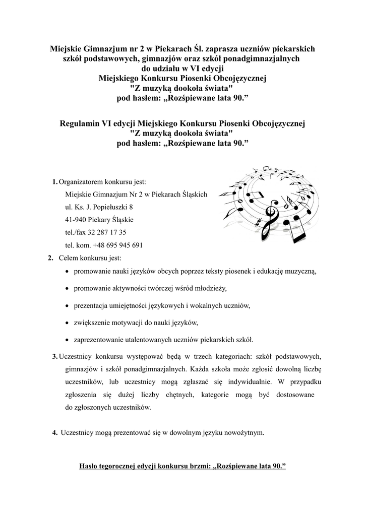 Miejskie Gimnazjum nr 2 w Piekarach Śl. zaprasza uczniów piekarskich szkół podstawowych, gimnazjów oraz szkół ponadgimnazjalnych do udziału w VI edycji Miejskiego Konkursu Piosenki Obcojęzycznej "Z muzyką dookoła świata" pod hasłem: „Rozśpiewane lata 90.” Regulamin VI edycji Miejskiego Konkursu Piosenki Obcojęzycznej "Z muzyką dookoła świata" pod hasłem: „Rozśpiewane lata 90.” 1. Organizatorem konkursu jest: Miejskie Gimnazjum Nr 2 w Piekarach Śląskich ul. Ks. J. Popiełuszki 8 41-940 Piekary Śląskie tel./fax 32 287 17 35 tel. kom. +48 695 945 691 2. Celem konkursu jest: promowanie nauki języków obcych poprzez teksty piosenek i edukację muzyczną, promowanie aktywności twórczej wśród młodzieży, prezentacja umiejętności językowych i wokalnych uczniów, zwiększenie motywacji do nauki języków, zaprezentowanie utalentowanych uczniów piekarskich szkół. 3. Uczestnicy konkursu występować będą w trzech kategoriach: szkół podstawowych, gimnazjów i szkół ponadgimnazjalnych. Każda szkoła może zgłosić dowolną liczbę uczestników, lub uczestnicy mogą zgłaszać się indywidualnie. W przypadku zgłoszenia się dużej liczby chętnych, kategorie mogą być dostosowane do zgłoszonych uczestników. 4. Uczestnicy mogą prezentować się w dowolnym języku nowożytnym. Hasło tegorocznej edycji konkursu brzmi: „Rozśpiewane lata 90.” Opiekunowie uczestników, nauczyciele lub rodzice, zobowiązani są dostarczyć drogą mailową [email protected] lub [email protected] na minimum tydzień przed planowanym konkursem prawidłowo wypełnioną kartę zgłoszenia (załącznik do regulaminu). 5. W razie korzystania z podkładu muzycznego uczestnik jest zobowiązany najpóźniej na dzień przed konkursem dostarczyć opisaną płytę (imię nazwisko, szkoła, nr utworu na płycie CD). Płyta powinna być wcześniej sprawdzona pod względem jakości i sprawności. W razie wystąpienia problemów z jej odtwarzaniem organizator nie ponosi odpowiedzialności. 6. Podkładem muzycznym może być akompaniament bądź nagranie (wyłącznie instrumentalne) na płycie CD. Niedopuszczalne są nagrane partie wokalne drugiego głosu oraz chórków. 7. Jury będzie oceniało ogólny wyraz artystyczny, sposób wykonania, walory głosowe, dobór repertuaru i poprawność językową. 8. Wszelkich informacji o konkursie udzielają nauczyciele Miejskiego Gimnazjum Nr 2: Aleksandra Pryk, Ewa Rzepus oraz Magdalena Skorwider. 9. Konkurs odbędzie się w Miejskim Gimnazjum Nr 2 w Piekarach Śląskich dnia 15 grudnia 2016 r. o godzinie 16:30. 10. Zgłoszenie na konkurs, jest jednoznaczne z wyrażeniem zgody na opublikowanie nagrań i zdjęć z konkursu na stronie internetowej. O wynikach konkursu uczestnicy zostaną powiadomieni po zakończeniu konkursu. 11. W konkursie zostaną przyznane nagrody za zdobycie 1, 2, i 3 miejsca. Jury zastrzega sobie prawo zmiany zasad przyznawania nagrody w danej kategorii, gdy poziom prezentacji nie będzie spełniał wymogów regulaminu oraz kryteriów ustalonych przez organizatora. Istnieje także możliwość przyznania nagród pozaregulaminowych. 12. Organizatorzy przyznają 1 nagrodę rzeczową bez względu na liczbę wykonawców. 13. Organizatorzy zapewniają: sprzęt nagłaśniający, odtwarzacz płyt CD, mikrofony. 14. Organizatorzy zastrzegają możliwość wycofania z konkursu utworu, który zawiera treści obraźliwe lub wulgarne. Piosenki prezentowane w poprzednich edycjach tego konkursu będą dyskwalifikowane. Zapraszamyi… Dozobaczenia! Karta zgłoszenia uczestnika 1. Nazwa szkoły _____________________________________________________________________ 2. Telefon kontaktowy _____________________________________________________________________ 3. Adres e-mail szkoły lub opiekuna _____________________________________________________________________ 4. Imię i nazwisko uczestnika _____________________________________________________________________ 5. Tytuł utworu i wykonawca _____________________________________________________________________ 6. Język wykonania _____________________________________________________________________ 7. Imię i nazwisko opiekuna _____________________________________________________________________ 8. Muzyka (płyta, instrument akompaniujący) _____________________________________________________________________ 9. Uwagi _____________________________________________________________________ _____________________________________________________________________ _____________________________________________________________________