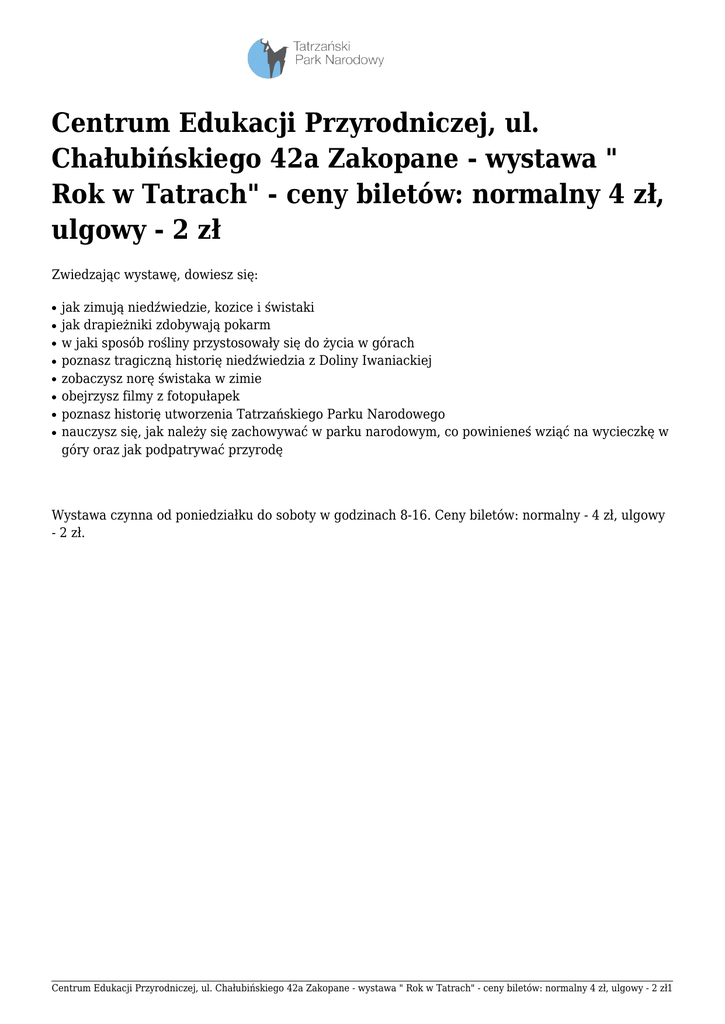 Centrum Edukacji Przyrodniczej, ul. Chałubińskiego 42a Zakopane - wystawa " Rok w Tatrach" - ceny biletów: normalny 4 zł, ulgowy - 2 zł Zwiedzając wystawę, dowiesz się: ● ● ● ● ● ● ● ● jak zimują niedźwiedzie, kozice i świstaki jak drapieżniki zdobywają pokarm w jaki sposób rośliny przystosowały się do życia w górach poznasz tragiczną historię niedźwiedzia z Doliny Iwaniackiej zobaczysz norę świstaka w zimie obejrzysz filmy z fotopułapek poznasz historię utworzenia Tatrzańskiego Parku Narodowego nauczysz się, jak należy się zachowywać w parku narodowym, co powinieneś wziąć na wycieczkę w góry oraz jak podpatrywać przyrodę Wystawa czynna od poniedziałku do soboty w godzinach 8-16. Ceny biletów: normalny - 4 zł, ulgowy - 2 zł. Centrum Edukacji Przyrodniczej, ul. Chałubińskiego 42a Zakopane - wystawa " Rok w Tatrach" - ceny biletów: normalny 4 zł, ulgowy - 2 zł1