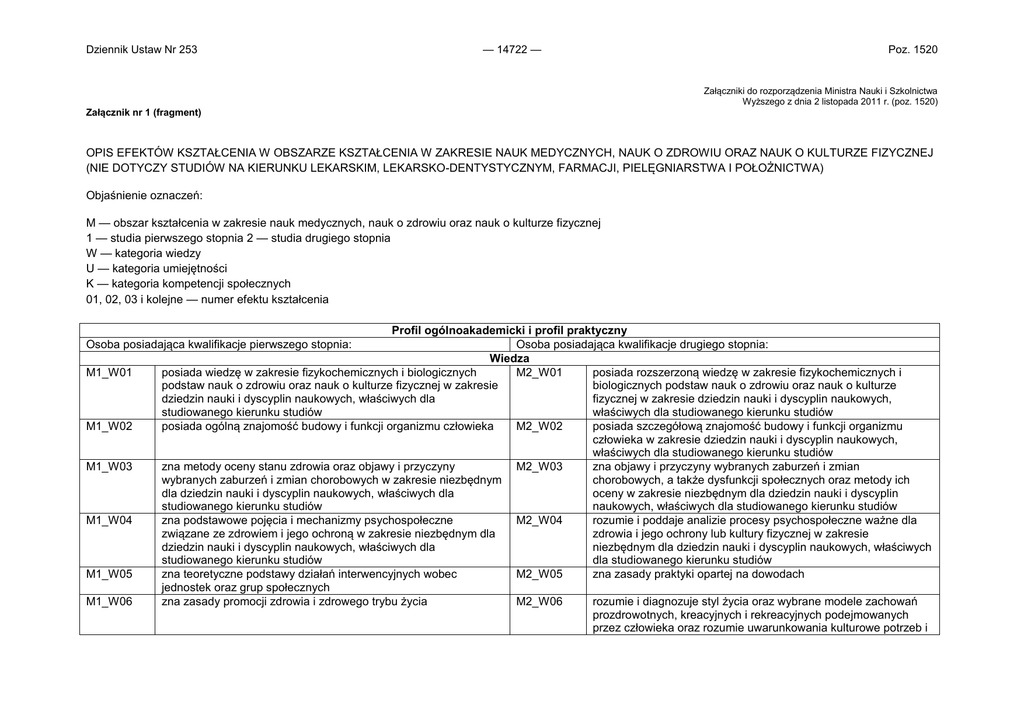 Dziennik Ustaw Nr 253 — 14722 — Poz. 1520 Załączniki do rozporządzenia Ministra Nauki i Szkolnictwa Wyższego z dnia 2 listopada 2011 r. (poz. 1520) Załącznik nr 1 (fragment) OPIS EFEKTÓW KSZTAŁCENIA W OBSZARZE KSZTAŁCENIA W ZAKRESIE NAUK MEDYCZNYCH, NAUK O ZDROWIU ORAZ NAUK O KULTURZE FIZYCZNEJ (NIE DOTYCZY STUDIÓW NA KIERUNKU LEKARSKIM, LEKARSKO-DENTYSTYCZNYM, FARMACJI, PIELĘGNIARSTWA I POŁOŻNICTWA) Objaśnienie oznaczeń: M — obszar kształcenia w zakresie nauk medycznych, nauk o zdrowiu oraz nauk o kulturze fizycznej 1 — studia pierwszego stopnia 2 — studia drugiego stopnia W — kategoria wiedzy U — kategoria umiejętności K — kategoria kompetencji społecznych 01, 02, 03 i kolejne — numer efektu kształcenia Profil ogólnoakademicki i profil praktyczny Osoba posiadająca kwalifikacje drugiego stopnia: Wiedza posiada wiedzę w zakresie fizykochemicznych i biologicznych M2_W01 posiada rozszerzoną wiedzę w zakresie fizykochemicznych i podstaw nauk o zdrowiu oraz nauk o kulturze fizycznej w zakresie biologicznych podstaw nauk o zdrowiu oraz nauk o kulturze dziedzin nauki i dyscyplin naukowych, właściwych dla fizycznej w zakresie dziedzin nauki i dyscyplin naukowych, studiowanego kierunku studiów właściwych dla studiowanego kierunku studiów posiada ogólną znajomość budowy i funkcji organizmu człowieka M2_W02 posiada szczegółową znajomość budowy i funkcji organizmu człowieka w zakresie dziedzin nauki i dyscyplin naukowych, właściwych dla studiowanego kierunku studiów zna metody oceny stanu zdrowia oraz objawy i przyczyny M2_W03 zna objawy i przyczyny wybranych zaburzeń i zmian wybranych zaburzeń i zmian chorobowych w zakresie niezbędnym chorobowych, a także dysfunkcji społecznych oraz metody ich dla dziedzin nauki i dyscyplin naukowych, właściwych dla oceny w zakresie niezbędnym dla dziedzin nauki i dyscyplin studiowanego kierunku studiów naukowych, właściwych dla studiowanego kierunku studiów zna podstawowe pojęcia i mechanizmy psychospołeczne M2_W04 rozumie i poddaje analizie procesy psychospołeczne ważne dla związane ze zdrowiem i jego ochroną w zakresie niezbędnym dla zdrowia i jego ochrony lub kultury fizycznej w zakresie dziedzin nauki i dyscyplin naukowych, właściwych dla niezbędnym dla dziedzin nauki i dyscyplin naukowych, właściwych studiowanego kierunku studiów dla studiowanego kierunku studiów zna teoretyczne podstawy działań interwencyjnych wobec M2_W05 zna zasady praktyki opartej na dowodach jednostek oraz grup społecznych zna zasady promocji zdrowia i zdrowego trybu życia M2_W06 rozumie i diagnozuje styl życia oraz wybrane modele zachowań prozdrowotnych, kreacyjnych i rekreacyjnych podejmowanych przez człowieka oraz rozumie uwarunkowania kulturowe potrzeb i Osoba posiadająca kwalifikacje pierwszego stopnia: M1_W01 M1_W02 M1_W03 M1_W04 M1_W05 M1_W06 Dziennik Ustaw Nr 253 M1_W07 M1_W08 M1_W09 M1_W10 M1_W11 M1_W12 M1_U01 M1_U02 M1_U03 M1_U04 M1_U05 M1_U06 — 14722 — zna mechanizm działania i skutki uboczne zabiegów fizycznych i aktywności ruchowych stosowanych w zakresie dziedzin nauki i dyscyplin naukowych, właściwych dla studiowanego kierunku studiów zna prawne, organizacyjne i etyczne uwarunkowania wykonywania działalności zawodowej w ramach studiowanego kierunku studiów zna miejsce dziedzin nauki i dyscyplin naukowych, właściwych dla studiowanego kierunku studiów, w ramach organizacji systemu ochrony zdrowia na poziomie krajowym ma podstawową wiedzę i zna terminologię nauk o zdrowiu oraz nauk o kulturze fizycznej w zakresie niezbędnym dla dziedzin nauki i dyscyplin naukowych, właściwych dla studiowanego kierunku studiów zna i rozumie podstawowe pojęcia i zasady z zakresu ochrony własności przemysłowej i prawa autorskiego M2_W07 problemów jednostek oraz grup społecznych rozumie zasady funkcjonowania sprzętu i aparatury stosowanych w zakresie dziedzin nauki i dyscyplin naukowych, właściwych dla studiowanego kierunku studiów M2_W08 zna i rozumie społeczne i ekonomiczno-gospodarcze uwarunkowania wybranego obszaru działalności zawodowej M2_W09 ma pogłębioną wiedzę z zakresu nauk o zdrowiu oraz nauk o kulturze fizycznej oraz ich miejscu i znaczeniu w systemie nauk M2_W10 ma wiedzę i zna terminologię nauk o zdrowiu oraz nauk o kulturze fizycznej w zakresie niezbędnym dla dziedzin nauki i dyscyplin naukowych, właściwych dla studiowanego kierunku studiów M2_W11 zna i rozumie podstawowe pojęcia i zasady z zakresu ochrony własności przemysłowej i prawa autorskiego oraz konieczność zarządzania zasobami własności intelektualnej zna ogólne zasady tworzenia i rozwoju form indywidualnej przedsiębiorczości, wykorzystującej wiedzę z zakresu dziedzin nauki i dyscyplin naukowych, właściwych dla studiowanego kierunku studiów zna ogólne zasady tworzenia i rozwoju form indywidualnej M2_W12 przedsiębiorczości, wykorzystującej wiedzę z zakresu dziedzin nauki i dyscyplin naukowych, właściwych dla studiowanego kierunku studiów Umiejętności posiada umiejętności techniczne, manualne i ruchowe związane M2_U01 ze studiowanym kierunkiem studiów potrafi posługiwać się podstawowym sprzętem i aparaturą M2_U02 stosowanymi w zakresie dziedzin nauki i dyscyplin naukowych, właściwych dla studiowanego kierunku studiów potrafi komunikować się z jednostką oraz grupą społeczną w M2_U03 zakresie związanym ze studiowanym kierunkiem studiów potrafi identyfikować problemy pacjenta, klienta oraz grupy społecznej potrafi podjąć działania diagnostyczne, profilaktyczne, pielęgnacyjne, terapeutyczne i edukacyjne odpowiadające potrzebom jednostki oraz grupy społecznej właściwe dla studiowanego kierunku studiów potrafi korzystać z technik informacyjnych w celu pozyskiwania i przechowywania danych Poz. 1520 M2_U04 M2_U05 M2_U06 posiada pogłębioną umiejętność stosowania technik efektywnego komunikowania się i negocjacji potrafi posług