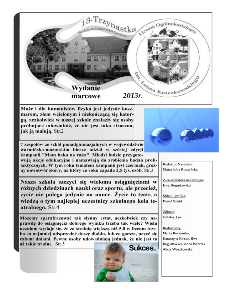 Wydanie marcowe 2013r. Może i dla humanistów fizyka jest jedynie koszmarem, złem wcielonym i niekończącą się katorgą, aczkolwiek w naszej szkole znalazły się osoby próbujące udowodnić, że nie jest taka straszna, jak ją malują. Str.2 7 zespołów ze szkół ponadgimnazjalnych w województwie warmińsko-mazurskim bierze udział w szóstej edycji kampanii "Mam haka na raka". Młodzi ludzie przygotowują akcje edukacyjne i namawiają do zrobienia badań profilaktycznych. W tym roku tematem kampanii jest czerniak, groźny nowotwór skóry, na który co roku zapada 2,5 tys. osób. Str.3 Redaktor Naczelny: Marta Julia Ruczyńska Nasza szkoła szczyci się wieloma osiągnięciami w różnych dziedzinach nauki oraz sportu, ale przecież, życie nie polega jedynie na nauce. Życie to teatr, a wiedzą o tym najlepiej uczestnicy szkolnego koła teatralnego. Str.4 Z-ca redaktora naczelnego: Możemy sparafrazować tak słynny cytat, aczkolwiek czy naprawdę do osiągnięcia dobrego wyniku trzeba tak wiele? Wielu uczniom wydaje się, że za średnią większą niż 5.0 w liceum trzeba co najmniej odsprzedać duszę diabłu, lub co gorsza, uczyć się całymi dniami. Pewne osoby udowadniają jednak, że nie jest to aż takie trudne. Str.5 Natalia Łoś Ewa Bogusławska Skład i grafika: Paweł Szulik Zdjęcia: Redaktorzy: Marta Ruczyńska, Katarzyna Kirsun, Ewa Bogusławska, Anna Pietrzak, Alicja Wyszkowska Nie taka fizyka straszna, jak ją malują Może i dla humanistów fizyka jest jedynie koszmarem, złem wcielonym i niekończącą się katorgą, aczkolwiek w naszej szkole znalazły się osoby próbujące udowodnić, że nie jest taka straszna, jak ją malują. Co więcej, sprawiają oni wrażenie, jakby naprawdę coś z niej rozumieli. A nawet potrafią zdobyć II miejsce w konkursie „Koło Naukowe Twórcą Filmu Interaktywnego”, będącym częścią projektu „Wirtualna fizyka – wiedza prawdziwa”. było stworzenie warunków do nauki poprzez działanie; zamiana podręcznika pełnego zawiłych pojęć i skomplikowanych, niezrozumiałych praw na samodzielną pracę ze sprzętem laboratoryjnym. Innowacyjnym rozwiązaniem były też poradniki użytkowania narzędzi projektu dla nauczyciela oraz ucznia, które zawierały informacje na temat odpowiedniego wykorzystania dostępnych materiałów. Do grona laureatów zaliczają się Sara Chodorowicz, Kamil Krzyżewski, Zuzanna Kowalik, Natalia Tersa oraz Marta Romanowska, wszyscy oczywiście z II a. Choć projekt miał na celu krzewienie fizyki wśród osób mniej ogarniętych w tej dziedzinie poprzez wykonywanie doświadczeń ciekawych, a zarazem tak prostych, by zrozumieć je mogli nawet humaniści, spowodował on również coś pożytecznego. Mianowicie, nasza szkoła otrzymała telewizor full HD, full 50 cali i ogólnie full wypas. Nasza szkoła doczekała się realizacji projektu na wyjątkowo wysokim poziomie. Filmy w porządnej rozdzielczości, zróżnicowany poziom trudności gier, szczegółowa analiza zjawisk poprzez przedstawienie ich w zwolnionym tempie (kamera szybkościowa pozwala uchwycić w kilkudziesięciu tysiącach klatek zjawiska trwające ułamki sekund), dzięki czemu dostrzegamy procesy, o których nawet nie mieliśmy pojęcia, że mogą zachodzić. Wszystko to, by suchą teorię zastąpić praktyką – z sukcesem. Czy jesteśmy gotowi na sprawdzenie swojej wieProjekt obejmował bezmiar interaktywnych dzy? filmów i gier edukacyjnych służących wyjaśnieniu i utrwaleniu zagadnień z poszczególnych działów fizyki. Ci, którzy wiecznie naEwa Bogusławska i Marta Ruczyńska rzekają na nudę, brak eksplodujących probówek, ciekłego azotu czy zastosowania kwasu siarkowego (VI) w praktyce (nie polecamy), w końcu się ich doczekali. Myślą przewodnią STR. 2 GAZETKA TRZYNASTKA NASZE LICEUM MA HAKA NA RAKA! 7 zespołów ze szkół ponadgimnazjalnych w województwie warmińskomazurskim bierze udział w szóstej edycji kampanii "Mam haka na raka". Młodzi ludzie przygotowują akcje edukacyjne i namawiają do zrobienia badań profilaktycznych. W tym roku tematem kampanii jest czerniak, groźny nowotwór skóry, na który co roku zapada 2,5 tys. osób. Także nasza szkoła została zarejestrowana do kampanii. Dzięki programowi Liceum Ogólnokształcące im. Leona Kruczkowskiego rywalizowało z powodzeniem na równym poziomie z miejscowościami takimi jak Elbląg, Ostróda, czy Olsztyn. Rywalizacja była wyrównana, razem ze współpracą moich koleżanek realizowałyśmy większość z naszych zamierzonych celów. Nasza szkoła wspirała nasze działania projektowe, ponieważ niewielkie doświadczenie i brak stuprocentowej wiedzy na temat przeprowadzania „happeningów” spowodowało, że nie wszystko odbywało się tak, jak powinno. Lecz dzięki pomocy Dyrekcji oraz zainteresowanych w nasz program osób, udało nam się osiągnąć satysfakcjonujące rezultaty. Tutaj pragnę wyszczególnić pracowników sekretariatu, bez których nie poradziłybyśmy sobie. Dziękujemy! Chciałabym wyróżnić naszą szkołę także pod jednym względem. Cała nasza grupa mogła obserwować zmagania każdej szkoły podczas trwania kampanii. Ze wszystkich dostarczanych na bieżąco informacji można wywnioskować, że Nasze Liceum walczy z Elblągiem o zajęcie pierwszego miejsca w województwie. To doskonałe wyróżnienie. Serdecznie dziękujemy także za możliwość udziału w projekcie, ponieważ nie wzięłybyśmy w nim udziału, gdyby nie GAZETKA TRZYNASTKA coroczny udział naszego liceum. Współpraca z rówieśnikami, spotkania z ludźmi zainteresowanymi naszymi celami, szerzenie informacji o profilaktyce czerniaka – było to dla nas wszystkich nowe i przyjemne doświadczenie. Lekcja zachęcająca do profilaktyki czerniaka odbyła się m.in. w klasie I C. Alicja Wyszkowska STR. 3 Teatralne serca Nasza szkoła szczyci się wieloma osiągnięciami w różnych dziedzinach nauki oraz sportu, ale przecież, życie nie p