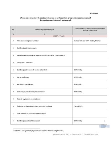 Z7-PBDO Wykaz zbiorów danych osobowych wraz ze wskazaniem programów zastosowanych do przetwarzania danych osobowych Lp. Zbiór danych osobowych Zastosowany program do przetwarzania danych osobowych 1 2 3 KADRY / PŁACE 1 1 Akta osobowe pracowników 2 Ewidencja akt osobowych 3 Ewidencja pracowników należących do Związków Zawodowych 4 Orzeczenia lekarskie 5 Ewidencja okresowych badań lekarskich R2 Płatnik; 6 Karty zasiłkowe R2 Płatnik; 7 Kartoteka zarobkowa R2 Płatnik; 8 Deklaracje podatkowe pracowników R2 Płatnik; 9 Rejestr wydanych zaświadczeń 10 Deklaracje ubezpieczeniowe ubezpieczeniowa 11 Dokumentacja awansów zawodowych 12 Ewidencja zwolnień lekarskich 1 ZSZWO Obszar ERP –kadry/finanse Płatnik ZUS; R2 Płatnik; ZSZWO – Zintegrowany System Zarządzania Wrocławską Oświatą Gimnazjum Nr 34 | ul. Zemska 16 E 54-438 Wrocław 1 13 Karty czasu pracy 14 Ewidencja legitymacji nauczycielskich 15 Ewidencja złożonych aplikacji kandydatów do pracy 16 Ewidencja wyjść w godzinach służbowych 17 Listy płac R2 Płatnik; 18 Deklaracje i kartoteki ZUS pracowników Płatnik ZUS 19 Rejestr pełnomocnictw / upoważnień 20 Ewidencja osób zatrudnionych przy przetwarzaniu danych osobowych 21 Listy obecności pracowników niepedagogicznych 22 Listy obecności pedagogów, psychologów, bibliotekarza SEKRETARIAT 23 Rejestr skarg i wniosków 24 Zbiór notatek służbowych 25 Rejestr delegacji służbowych 26 Rejestr wypożyczeni Urban Card 27 Księga uczniów 28 Arkusze ocen ZSZWO , Synergia sekretariat, Synergia dziennik elektroniczny 2 Gimnazjum Nr 34 | ul. Zemska 16 E 54-438 Wrocław 29 Karty zgłoszeń uczniów, podania o przyjęcie do szkoły 30 Ewidencja decyzji dot. zwolnienia z wychowania fizycznego 31 Ewidencja decyzji dot. zwolnienia z religii lub etyki 32 Dokumentacja z przebiegu realizacji obowiązek szkolny 33 Księga druków ścisłego zarachowania – świadectwa szkolne 34 Rejestr wydanych legitymacji szkolnych 35 Rejestr wydanych świadectw ukończenia Gimnazjum 36 Rejestr wydanych zaświadczeń o Egzaminie Gimnazjalnym 37 Ewidencja uczniów przystępujących do egzaminu gimnazjalnego HERMES / Platforma Dyrektora Szkoły OKE 38 Dokumentacja związana z egzaminem gimnazjalnym Platforma Dyrektora Szkoły OKE 39 Archiwum szkolne 40 Protokoły z rad pedagogicznych, księga uchwał, rejestr zarządzeń 41 Lista obecności na Radach Pedagogicznych 42 Dokumentacja wycieczek szkolnych 43 Dokumentacja związana ze sprawdzianami do klas dwujęzycznych ZSZWO ZSZWO 3 44 Rejestr wydanych zaświadczeń dot. uczniów Gimnazjum Nr 34 | ul. Zemska 16 E 54-438 Wrocław 45 Dokumentacja ubezpieczeniowa uczniów 46 Książka korespondencyjna 47 Rejestr pobranych kluczy 48 Ewidencja uczestników jednorazowego konkursu (zbiór doraźny) PIELĘGNIARKA 49 Karta zdrowia ucznia PEDAGOG / PSYCHOLOG 50 Zaświadczenia z poradni psychologiczno-pedagogicznej 51 Orzeczenia o niepełnosprawności 52 Orzeczenia o potrzebie kształcenia specjalnego 53 Pomoc społeczna 54 Dziennik elektroniczny Pedagoga/Psychologia 55 Ewidencja protokołów zespołu wychowawczego Synergia dziennik elektroniczny KSIĘGOWOŚĆ 56 Dokumentacja dotycząca ZFŚS 57 Księga druków ścisłego zarachowania – czeki 58 Ewidencja uczniów korzystających z dożywiania RESET2 PABS 4 59 Dokumentacja księgowa System bankowy, RESET2 FK; Gimnazjum Nr 34 | ul. Zemska 16 E 54-438 Wrocław 60 Inwentaryzacja majątku KIEROWNIK GOSPODARCZY / BHP 61 Rejestr zamówień publicznych 62 Rejestr zamówień publicznych do 30 000 euro 63 Rejestr zawartych umów najmu, użyczenia, dzierżawy 64 Ewidencja faktur wystawionych 65 Ewidencja faktur przychodzących 66 Ewidencja raportów kasowych 67 Rejestr szyldów, autoreklam 68 Harmonogramy pracy pracowników niepedagogicznych 69 Książka obiektu budowlanego wraz z protokołami 70 Karty przekazania odpadu 71 Umowy służące funkcjonowaniu szkoły 72 Rejestr umów dotyczących powierzenia przetwarzania danych osobowych 73 Ewidencja wydanych kluczy do szafek w pokoju nauczycielskim 74 Rejestr wypadków pracowników GUS 75 Rejestr wypadków uczniowskich ZSWO, SIO Vulcan faktury ZSWO Gimnazjum Nr 34 | ul. Zemska 16 E 54-438 Wrocław 5 76 Rejestr zachorowań na choroby zawodowy i podejrzeń o takie choroby 77 Rejestr wydanych zaświadczeń o odbyciu szkoleń ogólnych BHP wstępnych i stanowiskowych 78 Rejestr szkoleń BHP wstępnych, stanowiskowych i okresowych 79 Karty ewidencji przydziału odzieży i obuwia roboczą 80 Karty ewidencyjne przydziału środków ochrony indywidualnej 81 Ewidencja przydziału materiałów niezbędnych do wykonywania czynności wchodzących w zakres obowiązków nauczyciela BIBLIOTEKA 82 Ewidencja wypożyczeni PROLIB 83 Ewidencja książek PROLIB, VULCAN MOL WOŹNE 84 Rejestr wydanych kluczy do szafek uczniowskich WICEDYREKTOR 85 Ewidencja zastępstw nauczycieli VULCAN zastępstwa, Synergia dziennik 86 Dziennik lekcyjny Synergia dziennik elektroniczny; 87 Rejestr osób z dostępem do dziennika elektronicznego DYREKTOR 88 Arkusz organizacyjny placówki ZSZWO, VULCAN Arkusz Organizacyjny, PABS 89 Ewidencja zarejestrowanych użytkowników na stronie internetowej szkoły Zaplecze witryny internetowej Gimnazjum Nr 34 | ul. Zemska 16 E 54-438 Wrocław 6 90 Ewidencja osób, którym przyznano służbowy adres mailowy Panel Administracyjny serwera poczty OGICOM 91 Monitoring wizyjny (osoby, których wizerunek utrwalono za pomocą monitoringu wizyjnego) PRO SURVEILLANCE SYSTEM 92 Ewidencja zasobów SIO SIO 93 Plan lekcji VULCAN 94 ASC plan lekcji Librus synergia ZSZWO – Zintegrowany System Zarządzania Wrocławską Oświatą 7 Gimnazjum Nr 34 | ul. Zemska 16 E 54-438 Wrocław