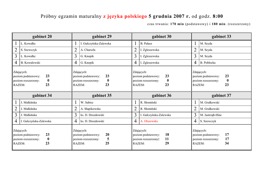 Próbny egzamin maturalny z języka polskiego 5 grudnia 2007 r. od godz. 8:00 czas trwania: 170 min (podstawowy) i 180 min. (rozszerzony) gabinet 20 1 2 3 4 1 2 3 4 L. Kowalke S. Szewczyk L. Kowalke B. Kowalewski Zdających: poziom podstawowy: poziom rozszerzony: RAZEM: gabinet 29 23 0 23 J. Małkińska J. Małkińska J. Małkińska I. Gulczyńska-Zalewska Zdających: poziom podstawowy: poziom rozszerzony: RAZEM: 23 0 23 A. Charszla G. Knopik G. Knopik Zdających: poziom podstawowy: poziom rozszerzony: RAZEM: gabinet 34 1 2 3 4 I. Gulczyńska-Zalewska 23 0 23 gabinet 30 1 2 3 4 gabinet 35 1 2 3 4 A. Słupikowska ks. D. Drozdowski ks. D. Drozdowski Zdających: poziom podstawowy: poziom rozszerzony: RAZEM: 20 5 25 I. Zgleszewska I. Zgleszewska I. Zgleszewska 23 0 23 R. Słomiński R. Słomiński I. Gulczyńska-Zalewska A. Olszewska Zdających: poziom podstawowy: poziom rozszerzony: RAZEM: 18 11 29 M. Seyda M. Seyda M. Seyda B. Pobłocka Zdających: poziom podstawowy: poziom rozszerzony: RAZEM: gabinet 36 1 2 3 4 W. Sabisz 1 2 3 4 B. Pałasz Zdających: poziom podstawowy: poziom rozszerzony: RAZEM: gabinet 33 23 0 23 gabinet 37 1 2 3 4 M. Grulkowski M. Grulkowski M. Jastrząb-Hinc S. Szewczyk Zdających: poziom podstawowy: poziom rozszerzony: RAZEM: 17 17 34 Próbny egzamin maturalny z języka niemieckiego 6 grudnia 2007 r. od godz. 8:00 czas trwania: 120 min (podstawowy) i 120 + 70 min. (rozszerzony) gabinet 35 Uwaga: Zdający poziom rozszerzony mają przerwę w godz. 10:05 – 10:20. 1 2 3 4 1 2 3 4 M. Grulkowski M. Grulkowski M. Seyda U. Kalińska Zdających: poziom podstawowy: poziom rozszerzony: RAZEM: gabinet 36 0 8 8 1 2 3 4 B. Pobłocka J. Małkińska K. Małkiński Zdających: poziom podstawowy: poziom rozszerzony: RAZEM: gabinet 37 13 0 13 I. Kosznik B. Pałasz B. Pałasz Zdających: poziom podstawowy: poziom rozszerzony: RAZEM: 14 0 14 Próbny egzamin maturalny z języka angielskiego 6 grudnia 2007 r. od godz. 12:00 czas trwania: 120 min (podstawowy) i 120 + 70 min. (rozszerzony) poziom podstawowy gabinet 20 5 6 7 J. Bartkowska J. Bartkowska A. Słupikowska Zdających: 16 gabinet 29 5 6 7 I. Zgleszewska I. Zgleszewska ks. M. Wawrzynkowski gabinet 34 5 6 7 I. Gulczyńska- Zalewska J. Kin I. Gulczyńska- Zalewska Zdających: 16 16 Zdających: gabinet 30 5 6 7 K. Małkiński K. Małkiński K. Małkiński gabinet 35 5 6 7 G. Knopik B Kowalewski B. Pałasz Zdających: 15 16 Zdających: gabinet 33 5 6 7 I. Kosznik I. Kosznik I. Kosznik Zdających: gabinet 36 5 6 7 W. Sabisz J. Małkińska J. Małkińska Zdających: 14 16 gabinet 37 5 6 7 L. Kowalke B. Pobłocka B. Pobłocka Zdających: 15 Próbny egzamin maturalny z języka angielskiego 6 grudnia 2007 r. od godz. 12:00 czas trwania: 120 min (podstawowy) i 120 + 70 min. (rozszerzony) poziom rozszerzony sala gimnastyczna Zespołu Szkół Publicznych nr 2 w Kościerzynie ul. Szkolna Uwaga: Zdający poziom rozszerzony mają przerwę w godz. 14:10 – 14:20 5 6 7 8 R. Słomiński U. Kalińska R. Słomiński U. Kalińska R. Słomiński R. Słomiński Zdających: 44 Próbny egzamin maturalny z wybranego przez zdających przedmiotu obowiązkowego 7 grudnia 2007 r. od godz. 8:00 czas tr wania: 12 0 min (pod stawo wy) , 15 0 min (po zio m r ozszerzo ny z b io lo gii, chemii, fizyki i geo grafii) , 18 0 min. (p ozio m rozszer zo ny z histor ii, matematyki i wied zy o spo łeczeństwie) gabinet 29 1 2 3 4 gabinet 30 1 2 3 4 I. Zgleszewska L. Kowalke I. Zgleszewska L. Kowalke Zdających podst. rozszerz. gabinet 33 1 2 3 4 A. Charszla G. Knopik B. Kowalewski G. Knopik Zdających podst. rozszerz. gabinet 34 1 2 3 4 K. Małkiński K. Małkiński M. Jastrząb-Hinc K. Małkiński Zdających podst. rozszerz. M. Grulkowski Z. Rolbiecki Z. Rolbiecki J. Gralak Zdających podst. rozszerz. historia 5 4 historia 7 5 biologia 3 3 biologia 3 3 WOS 4 1 WOS 5 0 chemia 2 3 chemia 2 3 matematyka 7 7 matematyka 8 8 fizyka 1 1 fizyka 0 1 11 5 geografia RAZEM 28 RAZEM 33 RAZEM 10 5 geografia 28 RAZEM 27 Próbny egzamin maturalny z wybranego przez zdających przedmiotu obowiązkowego 7 grudnia 2007 r. od godz. 8:00 czas tr wania: 12 0 min (pod stawo wy) , 15 0 min (po zio m r ozszerzo ny z b io lo gii, chemii, fizyki i geo grafii) , 18 0 min. (p ozio m rozszer zo ny z histor ii, matematyki i wied zy o spo łeczeństwie) gabinet 35 1 2 3 4 gabinet 36 1 2 3 4 C. Zalewski C. Zalewski A. Olszewska C. Zalewski Zdających podst. rozszerz. gabinet 37 1 2 3 4 J. Bartkowska M. Witt ks. Z. Węsierski CR J. Bartkowska Zdających podst. rozszerz. R. Słomiński J. Małkińska M. Seyda M. Seyda Zdających podst. rozszerz. historia 5 5 biologia 3 3 biologia 3 3 WOS 5 0 chemia 1 3 chemia 1 4 matematyka 8 8 fizyka 0 2 fizyka 0 2 10 5 geografia RAZEM 31 RAZEM 10 5 geografia 27 RAZEM 3 28