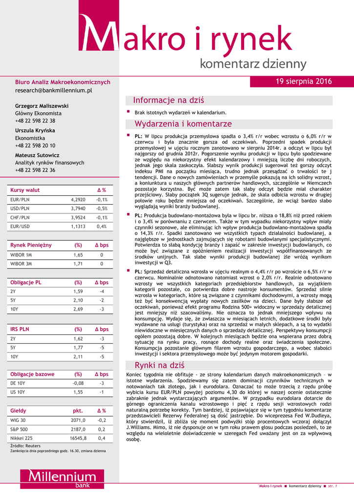 19 sierpnia 2016 Biuro Analiz Makroekonomicznych [email protected] Informacje na dziś Grzegorz Maliszewski Główny Ekonomista +48 22 598 22 38 Brak istotnych wydarzeń w kalendarium. Wydarzenia i komentarze Urszula Kryńska Ekonomistka +48 22 598 20 10 Mateusz Sutowicz Analityk rynków finansowych +48 22 598 22 36 Kursy walut Δ% EUR/PLN 4,2920 -0,1% USD/PLN 3,7940 -0,5% CHF/PLN 3,9524 -0,1% EUR/USD 1,1313 0,4% Rynek Pieniężny (%) Δ bps WIBOR 1M 1,65 0 WIBOR 3M 1,71 0 Obligacje PL (%) Δ bps 2Y 1,59 -4 5Y 2,10 -2 10Y 2,69 -3 IRS PLN (%) Δ bps 2Y 1,62 -3 5Y 1,77 -5 10Y 2,11 -5 PL: W lipcu produkcja przemysłowa spadła o 3,4% r/r wobec wzrostu o 6,0% r/r w czerwcu i była znacznie gorsza od oczekiwań. Poprzedni spadek produkcji przemysłowej w ujęciu rocznym zanotowano w sierpniu 2014r. a odczyt w lipcu był najgorszy od grudnia 2012r. Pogorszenie wyniku produkcji w lipcu było spodziewane ze względu na niekorzystny efekt kalendarzowy i mniejszą liczbę dni roboczych, jednak jego skala zaskoczyła. Słabszy wynik produkcji sugerował też gorszy odczyt indeksu PMI na początku miesiąca, trudno jednak przesądzać o trwałości te j tendencji. Dane o nowych zamówieniach w przemyśle pokazują na ich solidny wzrost, a koniunktura u naszych głównych partnerów handlowych, szczególnie w Niemczech pozostaje korzystna. Być może zatem tak słaby odczyt będzie miał charakter przejściowy. Słaby początek 3Q sugeruje jednak, że skala odbicia wzrostu w drugiej połowie roku będzie mniejsza od oczekiwań. Szczególnie, że wciąż bardzo słabo wyglądają wyniki branży budowlanej. PL: Produkcja budowlano-montażowa była w lipcu br. niższa o 18,8% niż przed rokiem i o 3,4% w porównaniu z czerwcem. Także w tym wypadku niekorzystny wpływ miały czynniki sezonowe, ale eliminując ich wpływ produkcja budowlano-montażowa spadła o 14,3% r/r. Spadki zanotowano we wszystkich typach działalności budowlanej, a najgłębsze w jednostkach zajmujących się robotami budowlanymi specjalistycznymi. Potwierdza to słabą kondycję branży i zapaść w zakresie inwestycji budowlanych, co może być związane z opóźnieniem realizacji inwestycji współfinansowanych ze środków unijnych. Tak słabe wyniki produkcji budowlanej źle wróżą wynikom inwestycji w Q3. PL: Sprzedaż detaliczna wzrosła w ujęciu realnym o 4,4% r/r po wzroście o 6,5% r/r w czerwcu. Nominalnie odnotowano natomiast wzrost o 2,0% r/r. Realnie odnotowano wzrosty we wszystkich kategoriach przedsiębiorstw handlowych, za wyjątkiem kategorii pozostałe, co potwierdza dobre nastroje konsumentów. Sprzedaż silnie wzrosła w kategoriach, które są związane z czynnikami dochodowymi, a wzrosty mogą też być konsekwencją wypłaty nowych zasiłków na dzieci. Dane były słabsze od oczekiwań, ponieważ efekt programu Rodzina 500+ widoczny w sprzedaży detalicznej jest mniejszy niż szacowaliśmy. Nie oznacza to jednak mniejszego wpływu na konsumpcję. Wydaje się, że zwłaszcza w miesiącach letnich, dodatkowe środki były wydawane na usługi (turystyka) oraz na sprzedaż w małych sklepach, a są to wydatki niewidoczne w miesięcznych danych o sprzedaży detalicznej. Perspektywy konsumpcji ogółem pozostają dobre. W kolejnych miesiącach będzie ona wspierana przez dobrą sytuację na rynku pracy, rosnące dochody realne oraz świadczenia społeczne. Konsumpcja pozostanie głównym filarem wzrostu gospodarczego, a wobec słabości inwestycji i sektora przemysłowego może być jedynym motorem gospodarki. Rynki na dziś Obligacje bazowe (%) Δ bps DE 10Y -0,08 -3 US 10Y 1,55 -1 Giełdy pkt. Δ% WIG 30 2071,0 -0,2 S&P 500 2187,0 0,2 Nikkei 225 16545,8 0,4 Koniec tygodnia nie obfituje - ze strony kalendarium danych makroekonomicznych – w istotne wydarzenia. Spodziewamy się zatem dominacji czynników technicznych w notowaniach tak złotego, jak i eurodolara. Oznaczać to może trzecią z rzędu próbę wybicia kursu EUR/PLN powyżej poziomu 4,30 do której w naszej ocenie ostatecznie zabraknie jednak wystarczających argumentów. W przypadku eurodolara dotarcie do górnego ograniczenia kanału wzrostowego i pięć z rzędu sesji wzrostowych rodzi naturalną potrzebę korekty. Tym bardziej, iż pojawiające się w tym tygodniu komentarze przedstawicieli Rezerwy Federalnej są dość jastrzębie. Do wiceprezesa Fed W.Dudleya, który stwierdził, iż zbliża się moment podwyżki stóp procentowych wczoraj dołączył J.Williams. Mimo, iż nie dysponuje on w tym roku prawem głosu podczas posiedzeń, to ze względu na wieloletnie doświadczenie w szeregach Fed uważany jest on za wpływową osobę. Źródło: Reuters Zamknięcia dnia poprzedniego godz. 16.30, zmiana dzienna `Makro i rynek komentarz dzienny str. 1 Rynek krajowy Kursy walutowe EUR/PLN i EUR/USD 4,50 1,14 4,45 4,40 1,12 4,35 1,10 4,30 4,25 1,08 EURPLN EURUSD /prawa skala/ Źródło: Reuters Rentowności polskich obligacji [%] 3,4 3,0 Złoty słabszy w czwartek przede wszystkim za sprawą czynników krajowych. Dane dotyczące sprzedaży detalicznej i produkcji przemysłowej zaskoczyły swoją negatywną wymową, ale największe przełożenie na wartość polskiej waluty miała wypowiedz J.Żyżyńskiego z Rady Polityki Pieniężnej, który być może zgłosi wniosek o obniżkę stóp procentowych. Kurs EUR/PLN nie zdołał jednak pokonać poziomu 4,30 i ostatecznie zakończył notowania grosz poniżej tej bariery. Wydarzeniem dnia na krajowym rynku długu – mimo publikacji danych z polskiej gospodarki – był przetarg, na którym Ministerstwo Finansów sprzedało obligacje łącznie za 7,949 mld PLN, co oznacza wypełnienie maksymalnej puli z ogłoszonego przedziału 5-8 mld PLN. Resort finansów sprzedał obligacje PS0721 za 3,84 mld PLN przy popycie 4,968 mld PLN i rentowności 2,114%, OK1018 za 1,947 mld PLN przy popycie 2,412 mld PLN i rentowności 1,666% oraz DS0726 za 2,159 mld PLN przy popycie 3,405 mld PLN i rentowności 2,704%. Reso