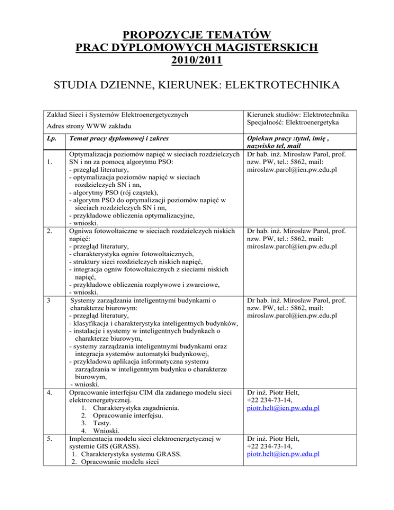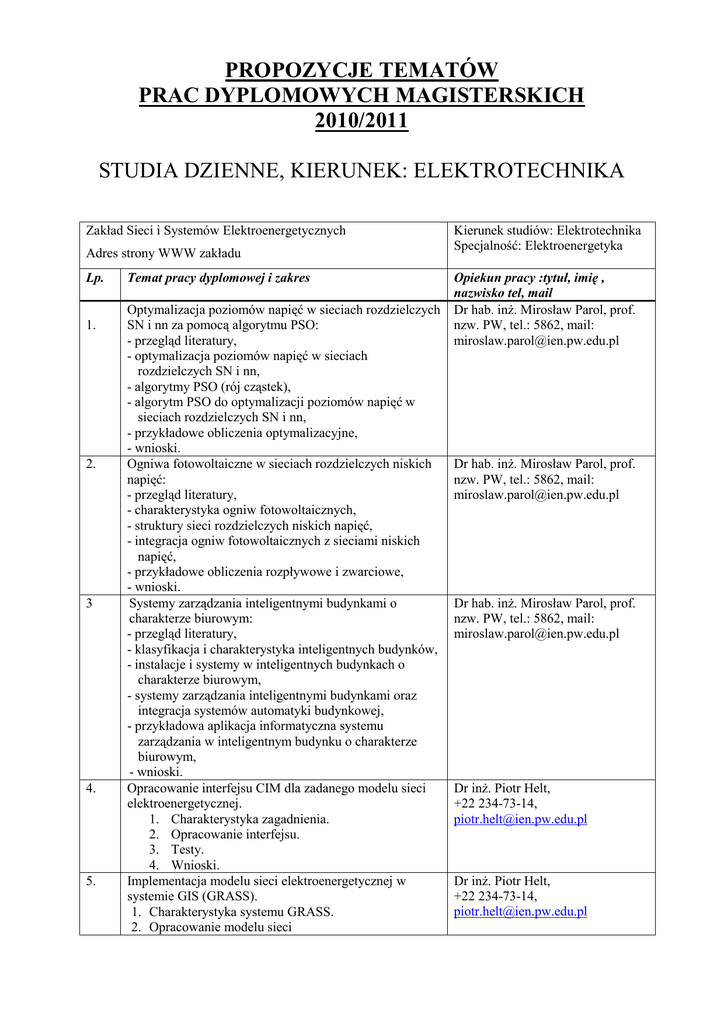 PROPOZYCJE TEMATÓW PRAC DYPLOMOWYCH MAGISTERSKICH 2010/2011 STUDIA DZIENNE, KIERUNEK: ELEKTROTECHNIKA Zakład Sieci i Systemów Elektroenergetycznych Adres strony WWW zakładu Lp. 1. 2. 3 4. 5. Temat pracy dyplomowej i zakres Optymalizacja poziomów napięć w sieciach rozdzielczych SN i nn za pomocą algorytmu PSO: - przegląd literatury, - optymalizacja poziomów napięć w sieciach rozdzielczych SN i nn, - algorytmy PSO (rój cząstek), - algorytm PSO do optymalizacji poziomów napięć w sieciach rozdzielczych SN i nn, - przykładowe obliczenia optymalizacyjne, - wnioski. Ogniwa fotowoltaiczne w sieciach rozdzielczych niskich napięć: - przegląd literatury, - charakterystyka ogniw fotowoltaicznych, - struktury sieci rozdzielczych niskich napięć, - integracja ogniw fotowoltaicznych z sieciami niskich napięć, - przykładowe obliczenia rozpływowe i zwarciowe, - wnioski. Systemy zarządzania inteligentnymi budynkami o charakterze biurowym: - przegląd literatury, - klasyfikacja i charakterystyka inteligentnych budynków, - instalacje i systemy w inteligentnych budynkach o charakterze biurowym, - systemy zarządzania inteligentnymi budynkami oraz integracja systemów automatyki budynkowej, - przykładowa aplikacja informatyczna systemu zarządzania w inteligentnym budynku o charakterze biurowym, - wnioski. Opracowanie interfejsu CIM dla zadanego modelu sieci elektroenergetycznej. 1. Charakterystyka zagadnienia. 2. Opracowanie interfejsu. 3. Testy. 4. Wnioski. Implementacja modelu sieci elektroenergetycznej w systemie GIS (GRASS). 1. Charakterystyka systemu GRASS. 2. Opracowanie modelu sieci Kierunek studiów: Elektrotechnika Specjalność: Elektroenergetyka Opiekun pracy :tytuł, imię , nazwisko tel, mail Dr hab. inŜ. Mirosław Parol, prof. nzw. PW, tel.: 5862, mail: [email protected] Dr hab. inŜ. Mirosław Parol, prof. nzw. PW, tel.: 5862, mail: [email protected] Dr hab. inŜ. Mirosław Parol, prof. nzw. PW, tel.: 5862, mail: [email protected] Dr inŜ. Piotr Helt, +22 234-73-14, [email protected] Dr inŜ. Piotr Helt, +22 234-73-14, [email protected] 6. 7. 8. 9. 10. 11. 12. Elektroenergetycznej. 1. Implementacja opracowanego modelu. 2. Wnioski. Opracowanie programu do wyznaczania optymalnych rozcięć w sieciach SN/nn z wykorzystaniem systemu GIS. 1. Charakterystyka zagadnienia. 2. Wybór algorytmu. 3. Implementacja wybranego algorytmu w systemie GIS (GRASS lub MapWindow). 4. Testowanie. 5. Wnioski. Perspektywy rozwoju wykorzystania źródeł energii odnawialnej. 1. Charakterystyka źródeł energii odnawialnej. 2. Charakterystyka dokumentów polskich i unijnych związanych z zagadnieniem. 3. Określenie perspektyw rozwoju źródeł energii odnawialnej. 4. Wnioski. Opracowanie ekspertowego systemu do projektowania instalacji w zakładach przemysłowych 1. Charakterystyka zagadnienia 2. Wybór metod do implementacji 3. Opracowanie systemu 4. Testy 5. Wnioski Analiza metod wyznaczania rozpływu mocy dla sieci rozdzielczych z przyłączoną generacją. 1. Przegląd literatury i programów słuŜących do obliczeń. 2. Analiza potrzeb obliczeniowych i specyfiki modeli sieci rozdzielczej. 3. Zbudowanie przykładów obliczeniowych. 4. Przeprowadzenie obliczeń. 5. Analiza wyników i sformułowanie wniosków. Bilans ekonomiczny zmiany napięcia miejskiej sieci rozdzielczej SN. 1. Przegląd literatury. 2. Przeprowadzenie obliczeń i symulacji elektroenergetycznych. 3. Przeprowadzenie obliczeń ekonomicznych. 4. Analiza wyników. 5. Sformułowanie wniosków. Zarządzanie popytem w spółkach dystrybucyjnych. 1. Przegląd literatury. 2. Analiza rozwiązań stosowanych w spółkach dystrybucyjnych w Polsce i na świecie. 3. Przeprowadzenie obliczeń i symulacji. 4. Analiza wyników i sformułowanie wniosków. Analiza skutków rozdzielenia instytucjonalnego operatorów systemów dystrybucyjnych i spółek obrotu energią elektryczną. 1. Przegląd rozwiązań stosowanych na świecie. 2. Zebranie i przegląd danych dotyczących spółek dystrybucyjnych przed i po podziale. 3. Analiza danych. Dr inŜ. Piotr Helt, +22 234-73-14, [email protected] Dr inŜ. Piotr Helt, +22 234-73-14, [email protected] Dr inŜ. Piotr Helt, +22 234-73-14, [email protected] Dr inŜ. Dariusz Baczyński, +22 234-73-14, [email protected] Dr inŜ. Dariusz Baczyński, +22 234-73-14, [email protected] Dr inŜ. Dariusz Baczyński, +22 234-73-14, [email protected] Dr inŜ. Dariusz Baczyński, +22 234-73-14, [email protected] 13. 14. 15. 16. 17. 18. 4. Wskazanie na pozytywne i negatywne aspekty procesu, sformułowanie zagroŜeń na podstawie doświadczeń światowych. 5. Sformułowanie wniosków. MoŜliwości zabezpieczania terenowych sieci rozdzielczych przed długotrwałymi awariami. 1. Przegląd rozwiązań technicznych stosowanych na świecie. 2. Przegląd typowych długotrwałych awarii w sieciach rozdzielczych. 3. Analiza moŜliwości zastosowania rozwiązań technicznych w warunkach polskich. 4. Analiza kosztów i poprawy niezawodności sieci rozdzielczych. 5. Sformułowanie wniosków. Koncepcja zabezpieczania przeciwporaŜeniowego instalacji elektrycznych budynków jednorodzinnych wyposaŜonych w źródła odnawialne. 1. Przegląd unormowania dot. zabezpieczania przeciwporaŜeniowego instalacji elektrycznych. 2. Analiza stanu pracy wyspowej pojedynczego budynku. 3. Analiza zagroŜeń poraŜeniowych. 4. Analiza aparatury p. poraŜeniowej. 5. Projekt modelowego układu instalacji. 6. Sformułowanie wniosków. Dr inŜ. Dariusz Baczyński, +22 234-73-14, [email protected] Dr inŜ. Dariusz Baczyński, +22 234-73-14, [email protected] Temat: Wykorzystanie pakietu Sphinx oraz Statistica do prognoz elektroenergetycznych wybranymi metodami statystycznymi oraz sieciami neuronowymi. Zakres: metodyka prognoz, wykonanie prognoz zapotrzebowania na energię elektryczną w środowisku pakietu Sphinx oraz Statistica metodami statystycznymi oraz sieciami neuronowymi Temat: Analiza statystyczna danych historycznych do prognoz energet