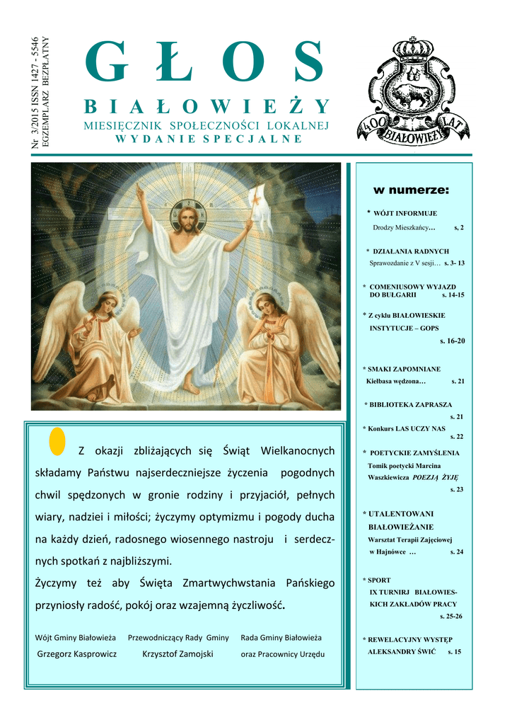 EGZEMPLARZ BEZPŁATNY Nr 3/2015 ISSN 1427 - 5546 G Ł O S B I A Ł O W I E Ż Y MIESIĘCZNIK SPOŁECZNOŚCI LOKALNEJ WYDANIE SPECJALNE w numerze: * WÓJT INFORMUJE Drodzy Mieszkańcy… s, 2 * DZIAŁANIA RADNYCH Sprawozdanie z V sesji… s. 3- 13 * COMENIUSOWY WYJAZD DO BUŁGARII s. 14-15 * Z cyklu BIAŁOWIESKIE INSTYTUCJE – GOPS s. 16-20 * SMAKI ZAPOMNIANE Kiełbasa wędzona… s. 21 * BIBLIOTEKA ZAPRASZA s. 21 * Konkurs LAS UCZY NAS s. 22 Z okazji zbliżających się Świąt Wielkanocnych * GŁOSIK PRZEDSZKOLA składamy Państwu najserdeczniejsze życzenia pogodnych * POETYCKIE ZAMYŚLENIA Tomik poetycki Marcina Waszkiewicza POEZJĄ ŻYJĘ s. 23 chwil spędzonych w gronie rodziny i przyjaciół, pełnych wiary, nadziei i miłości; życzymy optymizmu i pogody ducha na każdy dzień, radosnego wiosennego nastroju i serdecz- * UTALENTOWANI BIAŁOWIEŻANIE Warsztat Terapii Zajęciowej w Hajnówce … nych spotkań z najbliższymi. Życzymy też aby Święta Zmartwychwstania Pańskiego przyniosły radość, pokój oraz wzajemną życzliwość. s. 24 * SPORT IX TURNIRJ BIAŁOWIESKICH ZAKŁADÓW PRACY s. 25-26 Wójt Gminy Białowieża Przewodniczący Rady Gminy Rada Gminy Białowieża Grzegorz Kasprowicz Krzysztof Zamojski oraz Pracownicy Urzędu * REWELACYJNY WYSTĘP ALEKSANDRY ŚWIĆ s. 15 28.03.2015r. Lokalna Organizacja Turystyczna w Białowieży we współpracy z Gminą Białowieża dokonała symbolicznego otwarcia przystani kajakowej. Usytuowane zostały pomosty przy moście Towarowej oraz Szkole. Ze względu na deszczowy dzień spływ został przełożony w czasie. O dacie spływu poinformujemy na naszej stronie internetowej. LOT jest w trakcie opracowania zasad korzystania z kajaków oraz przystani. Po stworzeniu dokumentu mieszkańcy Białowieży będą mogli skorzystać z nowej atrakcji w Białowieży. WÓJT INFORMUJE Szanowni Mieszkańcy, po wyborze Wójta i radnych przyszedł czas na zmiany Sołtysów. Na 8 sołectw, aż w 5 wybrano nowego Sołtysa: Budy - Krystyna Dobrzyńska, CzerlonkaJacek Kajak, Grudki- Jan Micun, StoczekGrzegorz Orzechowski, Teremiski- Elżbieta Poleszuk. Gmina Białowieża jest na ukończeniu projektu remontu sceny na parkingu. Efekt prac jest zdecydowanie zauważalny. Kolejny raz Sołtysami zostali: Zgłosiliśmy do konkursu „Podwórko Nivea” naszą miejscowość. Konkurs będzie polegał na oddawaniu głosów przez Internet na powstanie placu zabaw przy szkole. Po ukazaniu się naszej miejscowości poinformujemy na stronie Gminy oraz Facebook o możliwości oddawania głosówbędziemy wdzięczni za liczne głosy. To od Państwa będzie zależało czy plac zabaw powstanie. Podolany- Walentyna Kozak, PogorzelcePiotr Szlachciuk, ZastawaAndrzej Siemieniuk. W dniach 27-28.02.2015r. rozegrany został IX Turniej Białowieskich Zakładów Pracy w piłce siatkowej o Puchar Wójta Gminy Białowieża. Zwycięzcą w kategorii amatorów został Instytut Biologii Ssaków PAN II detronizując tym samym Białowieski Park Narodowy I, który zajął II miejsce. III miejsce wywalczył zespół Technikum Leśnego. W związku z pytaniami dotyczącymi projektu wymiany oświetlenia oraz przeciwdziałania wykluczeniu cyfrowemu informuję, iż planowane zakończenie pierwszego projektu przewidziane jest do końca września 2015r, a drugi do końca 2015r. W grupie zaawansowanej I miejsce zajęła Straż Graniczna. Po zaciętych walkach II miejsce zdobyło Towarzystwo Sportowe „Żubr”, a III – Instytut Biologii Ssaków PAN I. Wójt Gminy Białowieża Serdecznie gratuluję osiągniętych wyników. Pozostałym uczestnikom, współorganizatorom i widzom serdecznie dziękuję. Grzegorz Kasprowicz 24.03.2015r. nastąpiła jednodniowa reaktywacja kina w BOK. Odwiedziło nas Kino Orange z usług których skorzystało około 300 mieszkańców. Z informacji jakie udało nam się uzyskać kolejna wizyta Kina Orange nastąpi w IV kwartale tego roku. 2 P R O T O K O Ł Nr V/15 z nadzwyczajnej V Sesji Rady Gminy Białowieża odbytej dnia 26 lutego 2015 roku. Nadzwyczajna V Sesja Rady Gminy Białowieża odbyła się w sali konferencyjnej Ochotniczej Straży Pożarnej przy ul. Sportowej 12. Ad.1 Przewodniczący Rady Gminy Krzysztof Zamojski rozpoczął sesję o godz. 14.05, następnie powitał wszystkich obecnych. Rada obradowała w składzie 14 radnych. Ad.2 Przewodniczący Rady Krzysztof Zamojski odczytał porządek obrad: Pani Sekretarz zaproponowała wprowadzenie do porządku obrad podjęcie uchwały w sprawie odbioru odpadów komunalnych od właścicieli nieruchomości na których nie zamieszkują mieszkańcy a powstają odpady komunalne jako pkt. 9. Powyższa uchwała regulowałaby odbiór odpadów od kwater agroturystycznych. Dalszych uwag nie wniesiono, wobec powyższego Przewodniczący poddał pod głosowanie porządek obrad wraz z wprowadzoną zmianą. Porządek obrad został przyjęty jednogłośnie i w związku z powyższym Rada obradowała według następującej kolejności: 1. Otwarcie obrad. 2. Przyjęcie porządku obrad. 3. Przyjęcie protokołu z IV Sesji Rady Gminy Białowieża. 4. Informacja Wójta Gminy z realizacji uchwał Rady Gminy i istotnych działań dotyczących Gminy w okresie międzysesyjnym. 5. Sprawozdanie Przewodniczącego Rady z pracy międzysesyjnej. 6. Sprawozdanie Przewodniczącego Komisji Rewizyjnej z pracy międzysesyjnej. 7. Sprawozdanie Przewodniczących Komisji z pracy międzysesyjnej. 8. Podjęcie uchwały w sprawie Regulaminu utrzymania czystości i porządku na terenie Gminy Białowieża. 9. Podjęcie uchwały w sprawie odbioru odpadów komunalnych od właścicieli nieruchomości, na których nie zamieszkują mieszkańcy a powstają odpady komunalne. 10. Podjęcie uchwały w sprawie określenia wzoru deklaracji o wysokości opłaty za gospodarowanie odpadami komunalnymi. 11. Podjęcie uchwały w sprawie wyboru metody opłaty za gospodarowanie odpadami komunalnymi, ustalenia wysokości stawki tej opłaty oraz stawki za pojemnik o określonej 