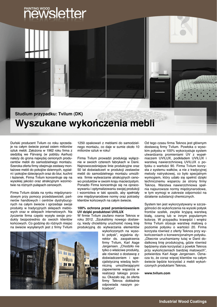 Studium przypadku: Tvilum (DK) Wyszukane wykończenia mebli Duński producent Tvilum co roku sprzedaje na całym świecie ponad osiem milionów sztuk mebli. Założona w 1962 roku firma z siedzibą we Fårvang (w pobliżu Aarhus) należy do grona najwyżej cenionych producentów mebli do samodzielnego montażu. Szeroka oferta firmy obejmuje zestawy montażowe mebli do pokojów dziennych, sypialni i pokojów dziecięcych oraz do biur, kuchni i łazienek. Firma Tvilum koncentruje się na wysokiej jakości oraz atrakcyjnym wzornictwie na różnych pułapach cenowych. Firma Tvilum działa na rynku międzynarodowym przy pomocy przedstawicieli, partnerów handlowych i centrów dystrybucyjnych na całym świecie i sprzedaje swoje produkty w tradycyjnych sklepach meblowych oraz w sklepach internetowych. Na życzenie firma często wysyła swoje produkty bezpośrednio do swoich klientów końcowych. Co godzinę do różnych miejsc na świecie wysyłanych jest z firmy Tvilum 1250 opakowań z meblami do samodzielnego montażu, co daje w sumie około 10 milionów sztuk w roku! Firma Tvilum prowadzi produkcję wyłącznie w swoich czterech fabrykach w Danii. Najnowocześniejsze linie produkcyjne oraz 50 lat doświadczeń w produkcji zestawów mebli do samodzielnego montażu umożliwia firmie wytwarzanie atrakcyjnych cenowo produktów w swoim kraju macierzystym. Ponadto Firma koncentruje się na opracowywaniu i optymalizowaniu swojej produkcji i wzornictwa w taki sposób, aby spełniały one międzynarodowe normy oraz potrzeby klientów końcowych na całym świecie. 100% ochrona przed promieniowaniem UV dzięki produktowi UVILUX W firmie Tvilum zaufano marce Teknos w roku 2012. „Szukaliśmy nowego dostawcy, kiedy chcieliśmy uruchomić nową linię produkcyjną do wytwarzania elementów wykończonych na wysoki połysk”, wyjaśnia dyrektor ds. zaopatrzenia firmy Tvilum, Karl Aage Jørgensen. „Chodziło nie tylko o właściwe produkty, ale również o dostawcę z doświadczeniem i specjalistyczną wiedzą techniczną umożliwiającymi zapewnienie wsparcia w realizacji takiego procesu. Okazało się, że oferta firmy Teknos dokładnie odpowiada naszym potrzebom”. Od tego czasu firma Teknos jest głównym dostawcą firmy Tvilum. Powłoka o wysokim połysku w 100% wykorzystuje system utwardzania promieniami UV z wypełniaczem UVILUX, podkładem UVILUX i warstwą nawierzchniową UVILUX o połysku o wartości 90. Firma Tvilum korzysta z systemu wałków, a nie z tradycyjnej metody natryskowej, co było specjalnym wymogiem, który udało się spełnić dzięki technicznemu wsparciu ze strony firmy Teknos. Warstwa nawierzchniowa spełnia najsurowsze normy międzynarodowe, w tym wymogi w zakresie odporności na działanie substancji chemicznych. System ten jest wykorzystywany w szczególności do wykończenia na wysoki połysk frontów szafek, zwykle kryjącą warstwą białą, czarną lub w innym popularnym kolorze. W przypadku krawędzi i wnętrz firma Tvilum stosuje warstwę matową o poziomie połysku o wartości 20. Firma korzysta również z oferty Teknos przy wykończeniach o konwencjonalnym połysku. „Obecnie uruchamiamy tutaj w Danii dodatkową linię produkcyjną, gdzie również będziemy stale korzystać z powłok Teknos przy wykończeniach bardziej matowych”, potwierdza Karl Aage Jørgensen. Oznacza to, że coraz więcej klientów na całym świecie będzie korzystać z mebli wykończonych produktami Teknos. www.tvilum.com Industrial Wood Coatings