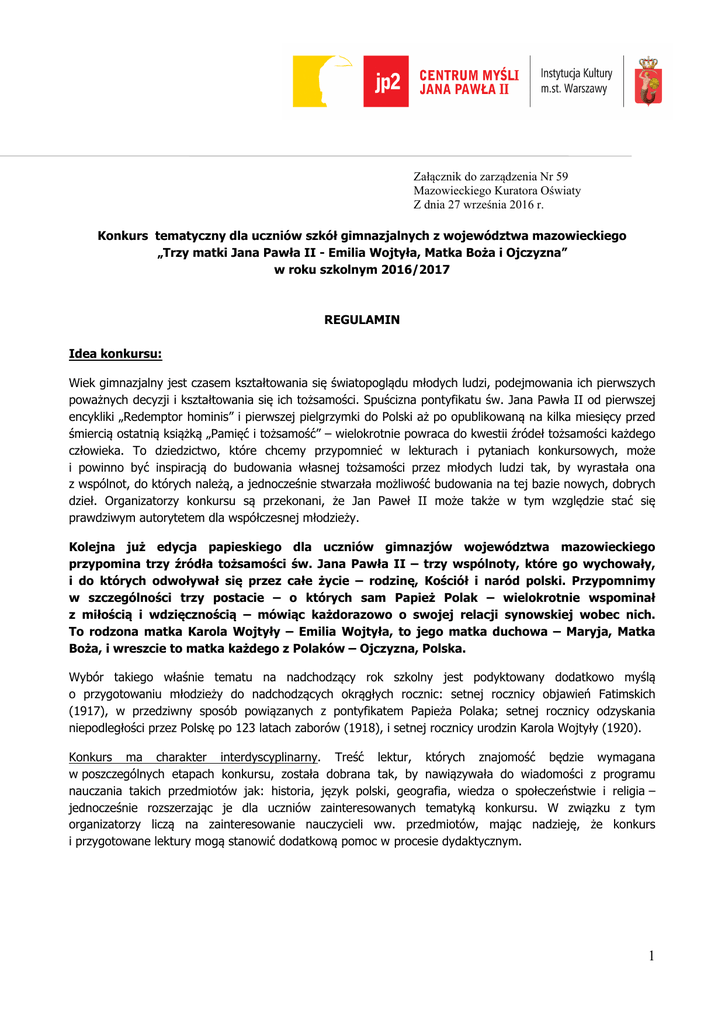 Załącznik do zarządzenia Nr 59 Mazowieckiego Kuratora Oświaty Z dnia 27 września 2016 r. Konkurs tematyczny dla uczniów szkół gimnazjalnych z województwa mazowieckiego „Trzy matki Jana Pawła II - Emilia Wojtyła, Matka Boża i Ojczyzna” w roku szkolnym 2016/2017 REGULAMIN Idea konkursu: Wiek gimnazjalny jest czasem kształtowania się światopoglądu młodych ludzi, podejmowania ich pierwszych poważnych decyzji i kształtowania się ich tożsamości. Spuścizna pontyfikatu św. Jana Pawła II od pierwszej encykliki „Redemptor hominis” i pierwszej pielgrzymki do Polski aż po opublikowaną na kilka miesięcy przed śmiercią ostatnią książką „Pamięć i tożsamość” – wielokrotnie powraca do kwestii źródeł tożsamości każdego człowieka. To dziedzictwo, które chcemy przypomnieć w lekturach i pytaniach konkursowych, może i powinno być inspiracją do budowania własnej tożsamości przez młodych ludzi tak, by wyrastała ona z wspólnot, do których należą, a jednocześnie stwarzała możliwość budowania na tej bazie nowych, dobrych dzieł. Organizatorzy konkursu są przekonani, że Jan Paweł II może także w tym względzie stać się prawdziwym autorytetem dla współczesnej młodzieży. Kolejna już edycja papieskiego dla uczniów gimnazjów województwa mazowieckiego przypomina trzy źródła tożsamości św. Jana Pawła II – trzy wspólnoty, które go wychowały, i do których odwoływał się przez całe życie – rodzinę, Kościół i naród polski. Przypomnimy w szczególności trzy postacie – o których sam Papież Polak – wielokrotnie wspominał z miłością i wdzięcznością – mówiąc każdorazowo o swojej relacji synowskiej wobec nich. To rodzona matka Karola Wojtyły – Emilia Wojtyła, to jego matka duchowa – Maryja, Matka Boża, i wreszcie to matka każdego z Polaków – Ojczyzna, Polska. Wybór takiego właśnie tematu na nadchodzący rok szkolny jest podyktowany dodatkowo myślą o przygotowaniu młodzieży do nadchodzących okrągłych rocznic: setnej rocznicy objawień Fatimskich (1917), w przedziwny sposób powiązanych z pontyfikatem Papieża Polaka; setnej rocznicy odzyskania niepodległości przez Polskę po 123 latach zaborów (1918), i setnej rocznicy urodzin Karola Wojtyły (1920). Konkurs ma charakter interdyscyplinarny. Treść lektur, których znajomość będzie wymagana w poszczególnych etapach konkursu, została dobrana tak, by nawiązywała do wiadomości z programu nauczania takich przedmiotów jak: historia, język polski, geografia, wiedza o społeczeństwie i religia – jednocześnie rozszerzając je dla uczniów zainteresowanych tematyką konkursu. W związku z tym organizatorzy liczą na zainteresowanie nauczycieli ww. przedmiotów, mając nadzieję, że konkurs i przygotowane lektury mogą stanowić dodatkową pomoc w procesie dydaktycznym. 1 Organizator: Centrum Myśli Jana Pawła II na zlecenie Mazowieckiego Kuratorium Oświaty. Uczestnicy Uczestnictwo w konkursie jest dobrowolne oraz dostępne dla każdego ucznia gimnazjów na terenie województwa mazowieckiego. Cele konkursu 1. Poznanie wspólnot kluczowych dla kształtowania się tożsamości młodego Karola Wojtyły – rodziny, Kościoła i Ojczyzny – a także relacji Jana Pawła II z nimi – na podstawie wybranych fragmentów jego nauczania. Ukazanie związków między tymi wspólnotami. 2. Przypomnienie życiorysu i głównych wątków dziedzictwa Jana Pawła II, ze szczególnym uwzględnieniem jego młodości, rodziny z której pochodził, w tym relacji z matką – Emilią Wojtyłą. 3. Wskazanie maryjności jako jednej z kluczowych podstaw duchowości św. Jana Pawła II oraz jego antropologii. Przypomnienie wydarzeń, słów i gestów z życia św. Jana Pawła II, związanych z Matką Bożą, a także miejsc Maryjnych w Polsce i zagranicą (m.in. Jasna Góra, Ostra Brama, Fatima, Lourdes, Nazaret) w kontekście pielgrzymek Jana Pawła II. 4. Przedstawienie nauczania św. Jana Pawła II nt. Ojczyzny i patriotyzmu. 5. Przypomnienie – w kontekście wybranych fragmentów tekstów autorstwa Papieża Polaka – losów Polski i polskiego Kościoła zarówno w ostatnim stuleciu (m.in. wojna polsko-bolszewicka 1920 roku, II wojna światowa, obchody Millenium, Sierpień 1980, rok 1989), jak i wcześniej (z nawiązaniem do mijającej w bieżącym roku 1050. rocznicy Chrztu Polski). Przypomnienie wybranych faktów społecznych, geograficznych i religijnych ważnych w kontekście. 6. Wskazanie Jana Pawła II jako wzorca osobowego i zachęta do czerpania z jego nauczania jako duszpasterza młodych całego świata, a także do naśladowania innych wzorców osobowych obecnych w tym kontekście. Tematyka ogólna konkursu w edycji 2016/17 „Trzy matki Jan Paweł II – Emilia Wojtyła, Matka Boża i Ojczyzna” Zakres wiedzy: fakty dotyczące biografii Karola Wojtyły-Jana Pawła II, zwłaszcza z okresu jego młodości i jego korzeni rodzinnych. Patriotyzm Jana Pawła II – fakty z życiorysu (zarówno z czasów przedpontyfikalnych, jak i papieskich) i nauczanie nt. Ojczyzny, dziedzictwa polskiej kultury i historii. Maryjność Jana Pawła II - fakty z życiorysu i wybrane wątki jego nauczania nt. Matki Bożej. 2 Strona internetowa konkursu Wszystkie informacje o konkursie będzie można odnaleźć na stronie internetowej konkursu: http://www.centrumjp2.pl/konkurs2016/ HARMONOGRAM KONKURSU Koniec września 2016 r. – ogłoszenie regulaminu konkursu na stronie internetowej konkursu www.centrumjp2.pl/konkurs2016 oraz na stronie internetowej Mazowieckiego Kuratora Oświaty 7 listopada 2016 r.- ostateczny termin zgłoszeń szkół do konkursu Zgłoszenie uczestnictwa jest równoznaczne z akceptacją regulaminu konkursu. forma zgłoszenia: na druku zgłoszeniowym (zał. Nr 1) na adres [email protected] z dopiskiem KONKURS PAPIESKI 2016. 14 listopada 2016 r.- Wojewódzka Komisja Konkursowa zamieszcza na stronie internetowej formalną listę