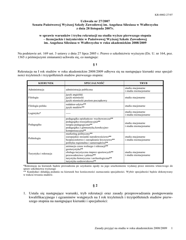 KR-0002-27/07 Uchwała nr 27/2007 Senatu Państwowej WyŜszej Szkoły Zawodowej im. Angelusa Silesiusa w Wałbrzychu z dnia 28 listopada 2007r. w sprawie warunków i trybu rekrutacji na studia wyŜsze pierwszego stopnia – licencjackie i inŜynierskie w Państwowej WyŜszej Szkole Zawodowej im. Angelusa Silesiusa w Wałbrzychu w roku akademickim 2008/2009 Na podstawie art. 169 ust. 3 ustawy z dnia 27 lipca 2005 r. Prawo o szkolnictwie wyŜszym (Dz. U. nr 164, poz. 1365 z późniejszymi zmianami) uchwala się, co następuje: §1 Rekrutacja na I rok studiów w roku akademickim 2008/2009 odbywa się na następujące kierunki oraz specjalności trzyletnich i trzyipółletnich studiów pierwszego stopnia: KIERUNEK Administracja Filologia Filologia polska Logistyka* Pedagogika Politologia Turystyka i rekreacja SPECJALNOŚĆ TRYB studia stacjonarne i studia niestacjonarne administracja publiczna język angielski język niemiecki język niemiecki poziom początkowy redaktor-edytor** język mediów** studia stacjonarne studia stacjonarne studia stacjonarne i studia niestacjonarne ----pedagogika opiekuńczo–wychowawcza** pedagogika resocjalizacyjna** terapia pedagogiczna** pedagogika z gimnastyką korekcyjnokompensacyjną** marketing polityczny** europejskie stosunki narodowościowe** bezpieczeństwo i zarządzanie kryzysowe** polityka regionalna i samorządowa** animacja czasu wolnego i rekreacji** geoturystyka** obsługa turystyczna imprez sportowych** przewodnictwo i pilotaŜ** turystyka historyczna i archeologiczna** turystyka uzdrowiskowa** studia stacjonarne i studia niestacjonarne studia stacjonarne i studia niestacjonarne studia stacjonarne i studia niestacjonarne *Rekrutacja na kierunek będzie prowadzona po uzyskaniu zgody na jego uruchomienie wydanej przez ministra właściwego do spraw szkolnictwa wyŜszego ** Kandydaci składają podania na kierunek bez konieczności zaznaczania specjalności. Wybór specjalności będzie dokonywany w trakcie trwania studiów. §2 1. Ustala się następujące warunki, tryb rekrutacji oraz zasady przeprowadzania postępowania kwalifikacyjnego i egzaminów wstępnych na I rok trzyletnich i trzyipółletnich studiów pierwszego stopnia na następujące kierunki i specjalności: Zasady przyjęć na studia w roku akademickim 2008/2009 1 1) Kierunek: ADMINISTRACJA, specjalność: ADMINISTRACJA PUBLICZNA Minimalna liczba osób do uruchomienia specjalności wynosi 25 osób. Kandydaci legitymujący się tzw. starą maturą Kandydaci legitymujący się tzw. nową maturą Studia stacjonarne i niestacjonarne Postępowanie kwalifikacyjne w formie konkursu świadectw. Komisja bierze pod uwagę ocenę z języka obcego, najwyŜsza ocena z egzaminu maturalnego z części pisemnej lub ustnej oraz wynik z jednego przedmiotu spośród: historii, wiedzy o społeczeństwie, geografii – najwyŜsza ocena z egzaminu maturalnego z części pisemnej lub ustnej. Jeśli kandydat nie zdawał egzaminu maturalnego z w/w przedmiotów komisja bierze pod uwagę ocenę końcową na świadectwie ukończenia szkoły średniej. Studia stacjonarne i niestacjonarne: Komisja bierze pod uwagę wyniki pisemnego egzaminu maturalnego z języka obcego oraz najkorzystniejszy wynik pisemnego egzaminu maturalnego z jednego przedmiotu spośród: historii, wiedzy o społeczeństwie, geografii na poziomie podstawowym lub rozszerzonym lub zdawanego jako przedmiot dodatkowy. Zasady punktacji: Maksymalnie kandydat moŜe uzyskać 210 pkt. Za zdany egzamin maturalny na poziomie podstawowym z Zasady punktacji : Maksymalnie kandydat moŜe uzyskać 210 pkt. języka obcego kandydat otrzymuje punkty według zasady: W tym za ocenę z języka obcego kandydat moŜe otrzymać 1% = 0,5 pkt. rekrutacyjny maksymalnie 80 punktów według zasady: Za zdany egzamin maturalny na poziomie rozszerzonym z celujący –80 pkt, języka obcego kandydat otrzymuje 30 pkt. oraz punkty bardzo dobry – 60 pkt, dodatkowe według zasady: dobry – 45 pkt, 1% = 1pkt. rekrutacyjny dostateczny – 30 pkt, dopuszczający – 15 pkt Za zdany egzamin maturalny na poziomie podstawowym z Za ocenę z jednego przedmiotu spośród: historii, wiedzy o jednego przedmiotu spośród: historii, wiedzy o społeczeńspołeczeństwie, geografii kandydat moŜe otrzymać mak- stwie, geografii kandydat otrzymuje punkty według zasady: symalnie 130 pkt według zasady 1% = 1 pkt. rekrutacyjny. celujący – 130 pkt, bardzo dobry – 100 pkt, dobry – 70 pkt, Za zdany egzamin maturalny na poziomie rozszerzonym z dostateczny – 50 pkt, jednego przedmiotu spośród: historii, wiedzy o społeczeńdopuszczający – 30 pkt stwie, geografii kandydat otrzymuje 30 pkt. oraz punkty dodatkowe według zasady: 1% = 1 pkt. rekrutacyjny. Na studia stacjonarne i niestacjonarne przyjęci zostaną kandydaci, którzy uzyskali największą liczbę punktów w W przypadku przedmiotu dodatkowego, jednego z wymieramach ustalonego limitu miejsc. Osobom, które nie zosta- nionych wyŜej punkty przeliczane są wg zasady: ną przyjęte na studia stacjonarne komisja moŜe zapropo- 1% = 1 pkt. rekrutacyjny. nować podjęcie studiów w trybie niestacjonarnym. Punkty zostaną naliczone tylko w przypadku zdania przez kandydata przedmiotu dodatkowego na minimum 30%. Na studia stacjonarne i niestacjonarne przyjęci zostaną kandydaci, którzy uzyskali największą liczbę punktów w ramach ustalonego limitu miejsc. Osobom, które nie zostaną przyjęte na studia stacjonarne komisja moŜe zaproponować podjęcie studiów w trybie niestacjonarnym. Zasady przyjęć na studia w roku akademickim 2008/2009 2 2) Kierunek: FILOLOGIA, specjalności: JĘZYK ANGIELSKI, JĘZYK NIEMIECKI Minimalna liczba osób do uruchomienia specjalności wynosi 25 osób. Kandydaci legitymujący się tzw. starą maturą Studia stacjonarne: Konkurs świadectw Komisja bierze pod uwagę wyniki pisemnego i ustnego egzaminu dojrzałości z języka kierunkowego. Zasady punktacji: Kandydat moŜe uzyskać maksymalnie 200 p