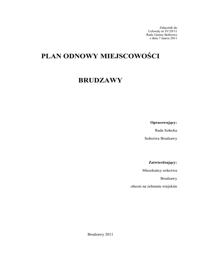 Załącznik do Uchwały nr IV/29/11 Rady Gminy Bobrowo z dnia 7 marca 2011 PLAN ODNOWY MIEJSCOWOŚCI BRUDZAWY Opracowujący: Rada Sołecka Sołectwa Brudzawy Zatwierdzający: Mieszkańcy sołectwa Brudzawy obecni na zebraniu wiejskim Brudzawy 2011 1. Charakterystyka miejscowości Miejscowość Brudzawy położona jest w gminie Bobrowo, powiecie brodnickim, województwie kujawsko- pomorskim. Zamieszkuje tu 308 mieszkańców, w tym 139 kobiet i 169 mężczyzn. W wieku od 0-18 jest 71 osób. Przeważającą część stanowią emeryci i renciści. Sołectwo obejmuje obszar 10 km2. Jest to 1020 ha, co stanowi 6,85% powierzchni gminy Bobrowo. Brudzawy to spokojna, mała wieś. Od kiedy zamknięto szkołę i klubokawiarnię, mieszkańcy twierdzą, że „zamarło życie wiejskie”. Dlatego postanowiliśmy opracować plan odnowy wsi, aby nasza wieś mogła realizować zadania, które będą integrować mieszkańców i służyć wspólnemu dobru. 2. Inwentaryzacja zasobów miejscowości W części północnej znajduje się strefa czołowo- morenowa pagórków, a w południowej podmokła równina o podłożu gliniastym. Najwcześniejsza wzmianka o osadzie pochodzi z 1414 roku, kiedy to sporządzono rejestr szkód, spowodowanych wojną polsko- krzyżacką (1410r.), w którym jest mowa o opustoszałej i spalonej wsi o nazwie Brusaw. Sołectwo Brudzawy położone jest na granicy powiatu brodnickiego i wąbrzeskiego, dlatego wielu mieszkańców dojeżdża do pracy lub do szkół do Brodnicy i Wąbrzeźna. Wieś jest zelektryzowana i ztelefonizowana, a także posiada sieć wodociągową. W centrum wsi wybudowano chodniki, chociaż ich ilość jest niewystarczająca. Każde gospodarstwo posiada pojemniki segregujące śmieci. Mieszkańcy starają się, aby w ich obejściu panował ład i porządek. Niektórzy z nich biorą udział w konkursie „Piękna zagroda”. Centralne miejsce sołectwa zajmuje zabytkowy kościół. Został zbudowany w I połowie XIV wieku z kamienia i polnej cegły. Kryty jest dwuspadowym dachem, wieża zaś dachem ostrosłupowym. W kościele znajdują się cenne zabytki: barokowy ołtarz, drewniany chór muzyczny, średniowieczne kropielnice granitowe, ludowa rzeźba Chrystusa Zmartwychwstałego, dwa krucyfiksy oraz neorokokowe organy. Nasza wieś posiada zabytek rzadko spotykany w Polsce. Są to dwa średniowieczne groby skrzyniowe. Mieszkańcy są dumni, że to właśnie u nas są zabytki, które „pamiętają” XIV wiek. Na terenie sołectwa od lat prężnie działa Koło Gospodyń Wiejskich, które często udziela się społecznie podczas organizowanych imprez gminnych. Panie z koła Gospodyń pozyskują wysokie miejsca w konkursach na wieńce i ozdoby dożynkowe. Jedna z członkiń jest przewodniczącą Gminnej Rady Kobiet. 3. Ocena mocnych i słabych stron miejscowości Mocne strony : - wzorowo prowadzone gospodarstwa rolne, - punkt skupu trzody chlewnej i bydła, - sklep spożywczy, w którym można zaopatrzyć się w podstawowe produkty spożywcze i przemysłowe. - Kościół, - dbałość mieszkańców o porządek w obejściach, - zwodociągowanie i ztelefonizowanie wsi, - widoczna działalność KGW. Słabe strony: - zwiększające się bezrobocie, - emigracja młodzieży, - zbyt małe angażowanie się mieszkańców w prace na rzecz środowiska. Szanse: - wspólne działanie za rzecz rozwoju wsi, - pozyskiwanie środków pochodzących z funduszy strukturalnych Unii Europejskiej na rozwój rolnictwa i przedsiębiorczości, - integracja mieszkańców. Zagrożenia: - brak organizacji młodzieżowych, ochotniczej Straży Pożarnej, - ucieczka młodych do miasta, - brak dostępu do teatru, kina, biblioteki, Internetu. 4. Opis planowanych zadań inwestycyjnych Mieszkańcy sołectwa chcieliby stworzyć lepszą przyszłość sobie, swoim dzieciom i wnukom. W najbliższym czasie chcieliby wykonać: - plac zabaw dla dzieci. W dalszej kolejności: - zbudować drogę asfaltową Brudzawy- Brudzawki - zbudować drogę asfaltową Brudzawy- Nieżywięć ( do gospodarstwa państwa Gredeckich) - utwardzić kostką teren wokół świetlicy, -wybudować większą ilość chodników. Lp. 1. 2. 3. 4. 5. Zadanie Cel i przeznaczenie zadania Budowa placu Poprawa zabaw dla warunków dzieci spędzania wolnego czasu dla najmłodszych mieszkańców Modernizacja, Poprawa stałe remonty warunków dróg użytkowania gminnych na drogi, która terenie wymaga sołectwa ustawicznej naprawy Asfaltowanie Poprawa dróg bezpieczeństwa gminnych użytkowników (Brudzawy – dróg gminnych Nieżywięć i Brudzawy – Brudzawki) Wyłożenie Poprawa kostką terenu estetyki wokół wokół świetlicy świetlicy Budowa Ułatwić chodnika bezpieczne poruszanie się w centrum wsi Harmonogram Szacunkowy realizacji koszt Źródło pozyskiwania środków Gmina Bobrowo PROW 2010-2011 20.000 zł 2011-2017 Wg potrzeb Urząd Gminy Sołectwo Brudzawy 2013 - 2020 Wg potrzeb Urząd Gminy Sołectwo Brudzawy 2011-2015 20 000 Urząd gminy PROW 2012 Wg potrzeb Urząd Gminy Sołectwo Brudzawy 5. Opis i charakterystyka obszarów o szczególnym znaczeniu dla zaspokojenia potrzeb mieszkańców, sprzyjających nawiązywaniu kontaktów społecznych, ze względu na ich położenie oraz cechy funkcjonalno – przestrzenne, w szczególności poprzez odnawianie lub budowę placów parkingowych, chodników lub oświetlenia ulicznego. Miejscem o szczególnym znaczeniu dla mieszkańców wsi Brudzawy jest świetlica, ponieważ jest to miejsce spotkań, zebrań, imprez środowiskowych. Znaczącą rolę spełnia także boisko, gdzie odbywają się spotkania integracyjne mieszkańców, rozgrywki sportowe, dożynki gminne. Ogromną rolę spełnia też usytuowany w centrum wsi zabytkowy kościół. Tu gromadzą się mieszkańcy na wspólnej modlitwie. W pobliżu kościoła znajduje się sklep spożywczy, w którym można zaopatrzyć się w podstawowe produkty spożywcze i przemysłowe.