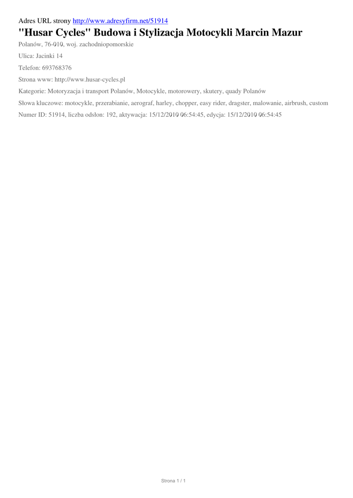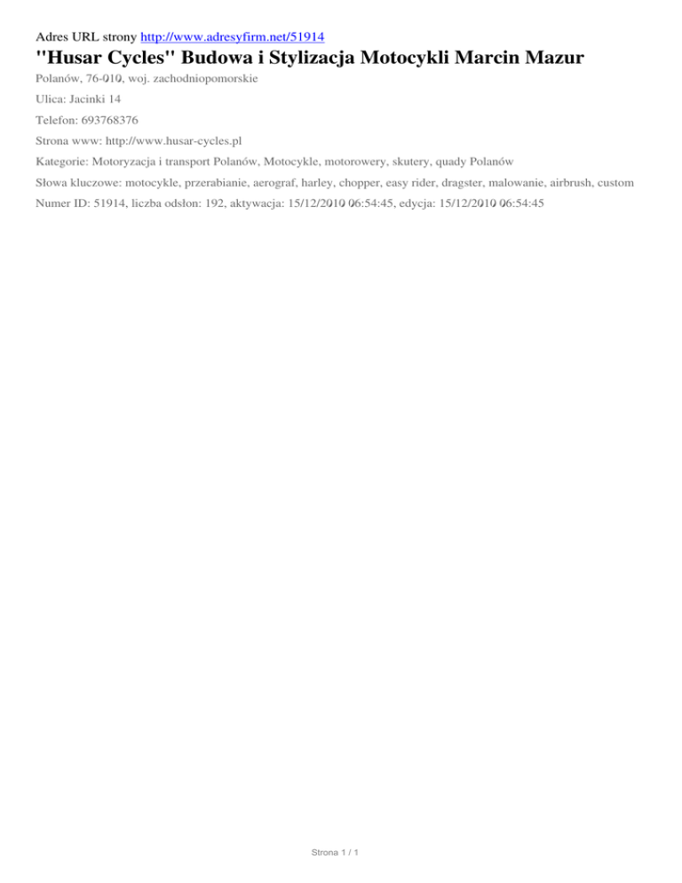 Adres URL strony http://www.adresyfirm.net/51914 "Husar Cycles" Budowa i Stylizacja Motocykli Marcin Mazur Polanów, 76-010, woj. zachodniopomorskie Ulica: Jacinki 14 Telefon: 693768376 Strona www: http://www.husar-cycles.pl Kategorie: Motoryzacja i transport Polanów, Motocykle, motorowery, skutery, quady Polanów Słowa kluczowe: motocykle, przerabianie, aerograf, harley, chopper, easy rider, dragster, malowanie, airbrush, custom Numer ID: 51914, liczba odsłon: 192, aktywacja: 15/12/2010 06:54:45, edycja: 15/12/2010 06:54:45 Strona 1 / 1