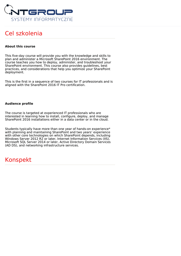 Cel szkolenia About this course This five-day course will provide you with the knowledge and skills to plan and administer a Microsoft SharePoint 2016 environment. The course teaches you how to deploy, administer, and troubleshoot your SharePoint environment. This course also provides guidelines, best practices, and considerations that help you optimize your SharePoint deployment. This is the first in a sequence of two courses for IT professionals and is aligned with the SharePoint 2016 IT Pro certification. Audience profile The course is targeted at experienced IT professionals who are interested in learning how to install, configure, deploy, and manage SharePoint 2016 installations either in a data center or in the cloud. Students typically have more than one year of hands-on experience* with planning and maintaining SharePoint and two years’ experience with other core technologies on which SharePoint depends, including Windows Server 2012 R2 or later, Internet Information Services (IIS), Microsoft SQL Server 2014 or later, Active Directory Domain Services (AD DS), and networking infrastructure services. Konspekt At course completion After completing this course, students will be able to: Describe the key features of SharePoint 2016. Design an information architecture for a SharePoint 2016 deployment. Design a logical architecture for a SharePoint 2016 deployment. Design the physical architecture for a SharePoint 2016 deployment. Install and configure SharePoint 2016. Create and configure web applications and site collections. Plan and configure service applications for a SharePoint 2016 deployment. Manage users and permissions, and secure content in a SharePoint 2016 deployment. Configure authentication in a SharePoint 2016 deployment. Configure platform and farm-level security in a SharePoint 2016 deployment. Manage information taxonomy in SharePoint web applications and site collections. Configure and manage user profiles and audiences. Configure and manage the search experience in SharePoint 2016. Monitor, maintain, and troubleshoot a SharePoint 2016 deployment. Nazwa: Czas trwania: 5 dni Ilość godzin: 40 Język: Dodatkowe informacje W cenę szkolenia wliczony jest: Szkolenie MS 20339-1A: Planning and Administering SharePoint 2016 Prowadzący: Autoryzowany trener Microsoft Lokalizacja: NT Group Łódź, siedziba klienta, lub dowolne miasto w Polsce Cena szkolenia: Cena do uzgodnienia. Prosimy o kontakt: 801 011 684 Dostępne terminy Certyfikat Microsoft Materiały szkoleniowe, notatnik, długopis Kontakt z trenerem po szkoleniu Kawa, herbata, słodki poczęstunek . Obiad NT GROUP Sp. z o.o. 90-418 Łódź, Al. T. Kościuszki 39 III piętro Firma posiada wpis w Urzędzie Miasta Łodzi jako placówka kształcenia ustawicznego. infolina 801 011 684 Tel.: +48 42 655-33-77; Fax: +48 42 630-15-63 e-mail: [email protected] NT Group Systemy Informatyczne Sp. z o.o. Krajowy Rejestr Sądowy Konto Bankowe 90-418 Łódź, Al. T. Kościuszki 39 III piętro KRS 0000214993 Kredyt Bank S.A. tel.: +42 6553377 Sąd Rejonowy dla Łodzi-Śródmieścia Rozliczenie Krajowe: tel. / fax. +42 6301563 w Łodzi, XX Wydział KRS 71 1500 1246 1215 4005 5991 0000 e-mail: [email protected] www.ntgroup.pl Rozliczenie Zagraniczne: Regon: 470557218 PL 71 1500 1246 1215 4005 5991 0000 NIP: 7251888624 KRDBPLPW