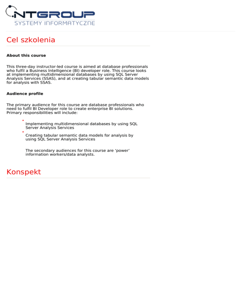 Cel szkolenia About this course This three-day instructor-led course is aimed at database professionals who fulfil a Business Intelligence (BI) developer role. This course looks at implementing multidimensional databases by using SQL Server Analysis Services (SSAS), and at creating tabular semantic data models for analysis with SSAS. Audience profile The primary audience for this course are database professionals who need to fulfil BI Developer role to create enterprise BI solutions. Primary responsibilities will include: Implementing multidimensional databases by using SQL Server Analysis Services Creating tabular semantic data models for analysis by using SQL Server Analysis Services The secondary audiences for this course are ‘power’ information workers/data analysts. Konspekt Module 1: Introduction to Business Intelligence and Data Modeling This module introduces key BI concepts and the Microsoft BI product suite. Lessons Introduction to Business Intelligence The Microsoft business intelligence platform Module 2: Creating Multidimensional Databases This module describes the steps required to create a multidimensional database with analysis services. Lessons Introduction to multidimensional analysis Creating data sources and data source views Creating a cube Overview of cube security Module 3: Working with Cubes and Dimensions This module describes how to implement dimensions in a cube. Lessons Configuring dimensions Define attribute hierarchies Sorting and grouping attributes Module 4: Working with Measures and Measure Groups This module describes how to implement measures and measure groups in a cube. Lessons Working with measures Working with measure groups Module 5: Introduction to MDX This module describes the MDX syntax and how to use MDX. Lessons MDX fundamentals Adding calculations to a cube Using MDX to query a cube Module 6: Customizing Cube Functionality This module describes how to customize a cube. Lessons Implementing key performance indicators Implementing actions Implementing perspectives Implementing translations Module 7: Implementing a Tabular Data Model by Using Analysis Services This module describes how to implement a tabular data model in PowerPivot. Lessons Introduction to tabular data models Creating a tabular data model Using an analysis services tabular model in an enterprise BI solution Module 8: Introduction to Data Analysis Expression (DAX) Nazwa: This module describes how to use DAX to create measures and calculated columns in a tabular data model. Szkolenie MS 20768A: Developing SQL Data Models Czas trwania: 3 dni Lessons DAX fundamentals Using DAX to create calculated columns and measures in a tabular data model Ilość godzin: 24 Język: Module 9: Performing Predictive Analysis with Data Mining This module describes how to use data mining for predictive analysis. Lessons Overview of data mining Using the data mining add-in for Excel Creating a custom data mining solution Validating a data mining model Connecting to and consuming a data mining model Prowadzący: Autoryzowany trener Microsoft Lokalizacja: NT Group Łódź, siedziba klienta, lub dowolne miasto w Polsce Cena szkolenia: 1900 PLN Dostępne terminy Dodatkowe informacje NT GROUP Sp. z o.o. 90-418 Łódź, Al. T. Kościuszki 39 III piętro W cenę szkolenia wliczony jest: Certyfikat Microsoft . Materiały szkoleniowe, notatnik, długopis Kontakt z trenerem po szkoleniu Kawa, herbata, słodki poczęstunek . Obiad infolina 801 011 684 Tel.: +48 42 655-33-77; Fax: +48 42 630-15-63 e-mail: [email protected] Firma posiada wpis w Urzędzie Miasta Łodzi jako placówka kształcenia ustawicznego. NT Group Systemy Informatyczne Sp. z o.o. Krajowy Rejestr Sądowy Konto Bankowe 90-418 Łódź, Al. T. Kościuszki 39 III piętro KRS 0000214993 Kredyt Bank S.A. tel.: +42 6553377 Sąd Rejonowy dla Łodzi-Śródmieścia Rozliczenie Krajowe: tel. / fax. +42 6301563 w Łodzi, XX Wydział KRS 71 1500 1246 1215 4005 5991 0000 e-mail: [email protected] www.ntgroup.pl Rozliczenie Zagraniczne: Regon: 470557218 PL 71 1500 1246 1215 4005 5991 0000 NIP: 7251888624 KRDBPLPW