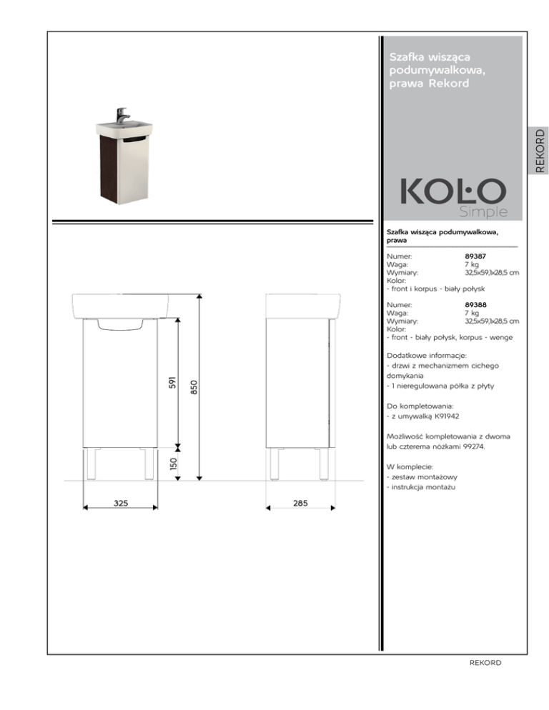 REKORD Szafka wisząca podumywalkowa, prawa Rekord Szafka wisząca podumywalkowa, prawa ________________________________ Numer: Waga: Wymiary: Kolor: - front i korpus - biały 89387 7 kg 32,5x59,1x28,5 cm połysk Numer: 89388 Waga: 7 kg Wymiary: 32,5x59,1x28,5 cm Kolor: - front - biały połysk, korpus - wenge Dodatkowe informacje: - drzwi z mechanizmem cichego domykania - 1 nieregulowana półka z płyty Do kompletowania: - z umywalką K91942 Możliwość kompletowania z dwoma lub czterema nóżkami 99274. W komplecie: - zestaw montażowy - instrukcja montażu REKORD