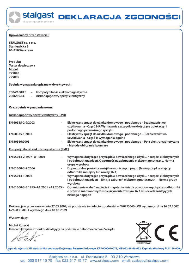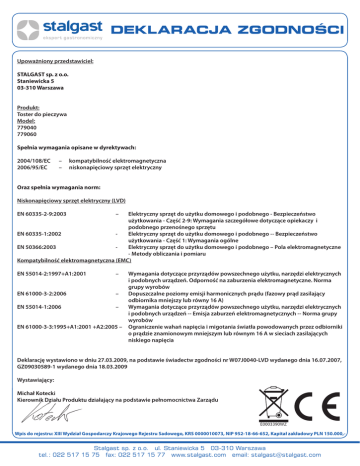 DEKLARACJA ZGODNOŚCI Upoważniony przedstawiciel: STALGAST sp. z o.o. Staniewicka 5 03-310 Warszawa Produkt: Toster do pieczywa Model: 779040 779060 Spełnia wymagania opisane w dyrektywach: 2004/108/EC 2006/95/EC – – kompatybilność elektromagnetyczna niskonapięciowy sprzęt elektryczny Oraz spełnia wymagania norm: Niskonapięciowy sprzęt elektryczny (LVD) EN 60335-2-9:2003 – Elektryczny sprzęt do użytku domowego i podobnego - Bezpieczeństwo użytkowania - Część 2-9: Wymagania szczegółowe dotyczące opiekaczy i podobnego przenośnego sprzętu EN 60335-1:2002 Elektryczny sprzęt do użytku domowego i podobnego -- Bezpieczeństwo użytkowania - Część 1: Wymagania ogólne EN 50366:2003 Elektryczny sprzęt do użytku domowego i podobnego – Pola elektromagnetyczne - Metody obliczania i pomiaru Kompatybilność elektromagnetyczna (EMC) EN 55014-2:1997+A1:2001 – EN 61000-3-2:2006 – EN 55014-1:2006 – EN 61000-3-3:1995+A1:2001 +A2:2005 – Wymagania dotyczące przyrządów powszechnego użytku, narzędzi elektrycznych i podobnych urządzeń. Odporność na zaburzenia elektromagnetyczne. Norma grupy wyrobów Dopuszczalne poziomy emisji harmonicznych prądu (fazowy prąd zasilający odbiornika mniejszy lub równy 16 A) Wymagania dotyczące przyrządów powszechnego użytku, narzędzi elektrycznych i podobnych urządzeń -- Emisja zaburzeń elektromagnetycznych -- Norma grupy wyrobów Ograniczenie wahań napięcia i migotania światła powodowanych przez odbiorniki o prądzie znamionowym mniejszym lub równym 16 A w sieciach zasilających niskiego napięcia Deklarację wystawiono w dniu 27.03.2009, na podstawie świadectw zgodności nr W07J0040-LVD wydanego dnia 16.07.2007, GZ09030589-1 wydanego dnia 18.03.2009 Wystawiający: Michał Kotecki Kierownik Działu Produktu działający na podstawie pełnomocnictwa Zarządu E0003390WZ Wpis do rejestru: XIII Wydział Gospodarczy Krajowego Rejestru Sadowego, KRS 0000010073, NIP 952-18-66-652, Kapitał zakładowy PLN 150.000,- Stalgast sp. z o.o. ul. Staniewicka 5 03-310 Warszawa tel.: 022 517 15 75 fax: 022 517 15 77 www.stalgast.com email: [email protected]