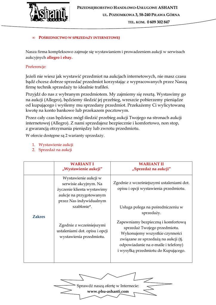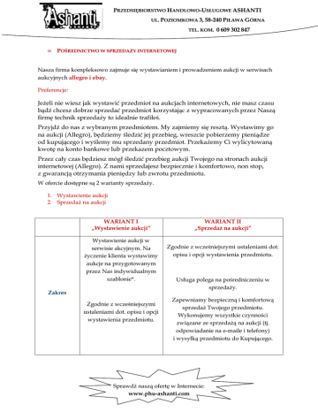 PRZEDSIĘBIORSTWO HANDLOWO-USŁUGOWE ASHANTI UL. POZIOMKOWA 3, 58-240 PIŁAWA GÓRNA TEL. KOM. • 0 609 302 847 POŚREDNICTWO W SPRZEDAśY INTERNETOWEJ Nasza firma kompleksowo zajmuje się wystawianiem i prowadzeniem aukcji w serwisach aukcyjnych allegro i ebay. Preferencje: JeŜeli nie wiesz jak wystawić przedmiot na aukcjach internetowych, nie masz czasu bądź chcesz dobrze sprzedać przedmiot korzystając z wypracowanych przez Naszą firmę technik sprzedaŜy to idealnie trafiłeś. Przyjdź do nas z wybranym przedmiotem. My zajmiemy się resztą. Wystawimy go na aukcji (Allegro), będziemy śledzić jej przebieg, wreszcie pobierzemy pieniądze od kupującego i wyślemy mu sprzedany przedmiot. PrzekaŜemy Ci wylicytowaną kwotę na konto bankowe lub przekazem pocztowym. Przez cały czas będziesz mógł śledzić przebieg aukcji Twojego na stronach aukcji internetowej (Allegro). Z nami sprzedajesz bezpiecznie i komfortowo, non stop, z gwarancją otrzymania pieniędzy lub zwrotu przedmiotu. W ofercie dostępne są 2 warianty sprzedaŜy. 1. Wystawienie aukcji 2. SprzedaŜ na aukcji WARIANT I „Wystawienie aukcji” Wystawienie aukcji w serwisie akcyjnym. Na Ŝyczenie klienta wystawimy aukcje na przygotowanym przez Nas indywidualnym szablonie*. Zakres Zgodnie z wcześniejszymi ustaleniami dot. opisu i opcji wystawienia przedmiotu. WARIANT II „SprzedaŜ na aukcji” Zgodnie z wcześniejszymi ustaleniami dot. opisu i opcji wystawienia przedmiotu. Usługa polega na pośredniczeniu w sprzedaŜy. Zapewniamy bezpieczną i komfortową sprzedaŜ Twojego przedmiotu. Wykonujemy wszystkie czynności związane ze sprzedaŜą na aukcji (tj. odpowiadanie na e-maile i telefony) i wysyłką przedmiotu do Kupującego. Sprawdź naszą ofertę w Internecie: www.phu-ashanti.com PRZEDSIĘBIORSTWO HANDLOWO-USŁUGOWE ASHANTI UL. POZIOMKOWA 3, 58-240 PIŁAWA GÓRNA TEL. KOM. WARIANT I „Wystawienie aukcji” Ograniczenia Rozmiar Cena 0 609 302 847 WARIANT II „SprzedaŜ na aukcji” Wszelkie sprawy związane z kontaktem z potencjalnymi kupcami tj. odpowiadanie na e-maile i telefony, wysyłka itp. – pozostają w gestii zamawiającego Brak Akceptujemy przedmioty o wadze do 30kg i maksymalnych rozmiarach (dł. + szer.+ wys.) nie przekraczających 150cm. Maksymalna długość przedmiotu nie powinna przekraczać 150cm. Zgodnie z cennikiem wariantu I Prowizja zgodnie z cennikiem wariantu II * własny szablon tworzymy bezpłatnie powyŜej 5 przedmiotów, poniŜej pobierana jest jednorazowa opłata w wysokości 70 zł netto Sprawdź naszą ofertę w Internecie: www.phu-ashanti.com