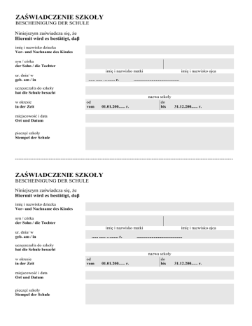 ZAŚWIADCZENIE SZKOŁY BESCHEINIGUNG DER SCHULE Niniejszym zaświadcza się, że Hiermit wird es bestätigt, daβ imię i nazwisko dziecka Vor- und Nachname des Kindes syn / córka der Sohn / die Tochter imię i nazwisko matki ur. dnia/ w geb. am / in ...... ...... …....... r. ........................................... uczęszczał/a do szkoły hat die Schule besucht w okresie in der Zeit od vom imię i nazwisko ojca nazwa szkoły do bis 31.12.200...... r. 01.01.200...... r. miejscowość i data Ort und Datum pieczęć szkoły Stempel der Schule --------------------------------------------------------------------------------------------------------------------------------- ZAŚWIADCZENIE SZKOŁY BESCHEINIGUNG DER SCHULE Niniejszym zaświadcza się, że Hiermit wird es bestätigt, daβ imię i nazwisko dziecka Vor- und Nachname des Kindes syn / córka der Sohn / die Tochter imię i nazwisko matki ur. dnia/ w geb. am / in ...... ...... …....... r. uczęszczał/a do szkoły hat die Schule besucht w okresie in der Zeit miejscowość i data Ort und Datum pieczęć szkoły Stempel der Schule od vom 01.01.200...... r. imię i nazwisko ojca ........................................... nazwa szkoły do bis 31.12.200...... r.