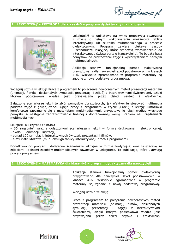 Katalog nagród – EDUKACJA 1. LEKCJOTEK@ - PRZYRODA dla klasy 4-6 – program dydaktyczny dla nauczycieli Lekcjotek@ to unikatowa na rynku propozycja stworzona z myślą o pełnym wykorzystaniu możliwości tablicy interaktywnej lub rzutnika multimedialnego w procesie dydaktycznym. Program zawiera ciekawe zasoby i scenariusze lekcyjne, które stanowią wprowadzenie do interaktywnego świata portalu Nauczyciel.pl. To bogata baza pomysłów na prowadzenie zajęć z wykorzystaniem narzędzi multimedialnych. Aplikacja stanowi funkcjonalną pomoc dydaktyczną przygotowaną dla nauczycieli szkół podstawowych w klasach 4–6. Wszystkie zgromadzone w programie materiały są zgodne z nową podstawą programową. Wciągnij ucznia w lekcję! Praca z programem to połączenie nowoczesnych metod prezentacji materiału (animacji, filmów, doskonałych symulacji, prezentacji i zdjęć) z interaktywnymi ćwiczeniami, dzięki którym podstawowa wiedza jest przyswajana przez dzieci szybko i efektywnie. Załączone scenariusze lekcji to zbiór pomysłów obrazujących, jak efektywnie stosować multimedia podczas zajęć z grupą dzieci. Opcja pracy z programem w trybie „Pracuj z lekcją" umożliwia komfortowe zapoznanie się z materiałami multimedialnymi, przygotowanie lekcji według własnego pomysłu, a następnie zaprezentowanie finalnej i dopracowanej wersji uczniom na urządzeniach multimedialnych. Lekcjotek@ Przyroda to m.in.: - 36 zagadnień wraz z dołączonymi scenariuszami lekcji w formie drukowanej i elektronicznej, - około 50 animacji i ilustracji, - ponad 100 symulacji, interaktywnych ćwiczeń, prezentacji i filmów, - filmy instruktażowe (m.in. obsługa tablicy interaktywnej, praca z programem). Dodatkowo do programu dołączono scenariusze lekcyjne w formie tradycyjnej oraz książeczkę ze zdjęciami i opisami zasobów multimedialnych zawartych w Lekcjotece. To publikacje, które ułatwiają pracę z programem. 2. LEKCJOTEK@ - MATEMATYKA dla klasy 4-6 – program dydaktyczny dla nauczycieli Aplikacja stanowi funkcjonalną pomoc dydaktyczną przygotowaną dla nauczycieli szkół podstawowych w klasach 4–6. Wszystkie zgromadzone w programie materiały są zgodne z nową podstawą programową. Wciągnij ucznia w lekcję! Praca z programem to połączenie nowoczesnych metod prezentacji materiału (animacji, filmów, doskonałych symulacji, prezentacji i zdjęć) z interaktywnymi ćwiczeniami, dzięki którym podstawowa wiedza jest przyswajana przez dzieci szybko i efektywnie. 1 Katalog nagród – EDUKACJA Załączone scenariusze lekcji to zbiór pomysłów obrazujących, jak efektywnie stosować multimedia podczas zajęć z grupą dzieci. Opcja pracy z programem w trybie „Pracuj z lekcją" umożliwia komfortowe zapoznanie się z materiałami multimedialnymi, przygotowanie lekcji według własnego pomysłu, a następnie zaprezentowanie finalnej i dopracowanej wersji uczniom na urządzeniach multimedialnych. Lekcjotek@ Matematyka to m.in.: - 36 zagadnień wraz z dołączonymi scenariuszami lekcji w formie drukowanej i elektronicznej, 115 animacji, symulacji i ilustracji, prawie 70 interaktywnych ćwiczeń, prezentacji, gier i filmów, filmy instruktażowe (m.in. obsługa tablicy interaktywnej, praca z programem). Dodatkowo do programu dołączono scenariusze lekcyjne w formie tradycyjnej oraz książeczkę ze zdjęciami i opisami zasobów multimedialnych zawartych w Lekcjotece. To publikacje, które ułatwiają pracę z programem. 3. LOGOPEDYCZNE ZABAWY. Część I - SZ, Ż, CZ, DŻ - edukacyjny program multimedialny Multimedialne Pakiety Logopedyczne powstały z myślą o dzieciach, które mają wady wymowy. Są one przeznaczone dla dzieci w wieku 4–9 lat. Ćwiczenia zawarte w pakiecie ćwiczą u dzieci wymowę trudnych głosek, wspomagając terapię logopedyczną. Spis gier: „Podpisz i powiedz” – ćwiczenia zawarte w programie są pomocne szczególnie przy utrwalaniu głoski w wyrazach (w różnych pozycjach). Program polecany jest dla dzieci posiadających umiejętność czytania. Zadanie dziecka polega na wybieraniu kolejnych liter i układaniu podpisu do pokazanego na ekranie obrazka. Litery układa się przy pomocy kursora myszy (metodą „przeciągnij i upuść”). „Zapamiętaj i powiedz” – jest to program obrazkowy, w który z pewnością chętnie będą grały młodsze jak i starsze dzieci. Polecany do wykorzystania j przy utrwalaniu wymowy głosek w wyrazach (w nagłosie, śródgłosie i wygłosie). „Uzupełnij wyraz” – program ma na celu utrwalanie różnicowania głosek opozycyjnych sz – s, cz – c, ż – z, dż – dz. Polecany jest dla dzieci, które potrafią czytać, jednakże po krótkim instruktażu ze strony osoby dorosłej, można wykorzystywać go do terapii wymowy dzieci młodszych. Zabawa polega na głośnym wypowiedzeniu przez dziecko nazwy obrazka a następnie wybranie brakującej litery do podpisu pod obrazkiem. „Spadające karty” – jest to program, który oprócz ćwiczenia poprawnej wymowy, wyrabia u dziecka świadomość fonologiczną, ćwiczy refleks, koncentrację uwagi, spostrzegawczość wzrokową. Skutecznie ćwiczy również motorykę małą, gdyż wymaga precyzyjnych i szybkich ruchów myszką, aby trafić na właściwy obrazek, który znajduje się cały czas w ruchu. „Nagraj i odtwórz” – to bardzo prosty rejestrator dźwięku. Umożliwia nagranie wymowy dziecka i porównanie jego wymowy np. na początku i końcu terapii. 2 Katalog nagród – EDUKACJA 4. LOGOPEDYCZNE ZABAWY. Część IV - J L R – edukacyjny program multimedialny Multimedialne Pakiety Logopedyczne powstały z myślą o dzieciach, które mają wady wymowy. Pakiety przeznaczone są dla dzieci w wieku 4-9 lat. Ćwiczenia zawarte w pakiecie wspomagają terapię logopedyczną i ćwiczą wymowę tych głosek u dzieci pod kierunkiem logopedy. Zestaw 6 multimedialnych programów komputerowych program ma na celu usprawnianie wymowy głosek j, l, 