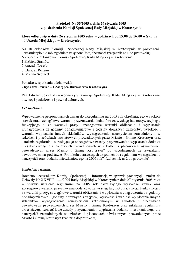 Protokół Nr 35/2005 z dnia 26 stycznia 2005 z posiedzenia Komisji S połecznej Rady Miejskiej w Krotoszynie które odbyło się w dniu 26 stycznia 2005 roku w godzinach od 15:00 do 16:00 w S ali nr 40 Urzędu Miejskiego w Krotoszynie. Na 10 członków Komisji Społecznej Rady M iejskiej w Krotoszynie w posiedzeniu uczestniczyło 6 osób, zgodnie z załączona listą obecności (załącznik nr 1 do protokołu) Nieobecni - członkowie Komisji Społecznej Rady M iejskiej w Krotoszynie: 1.Elzbieta Staniów 2.Antoni Korsak 3. Dariusz Rozum 4. M arian Skotarek Ponadto w spotkaniu udział wziął: - Ryszard Czusze – I Zastępca Burmistrza Krotoszyna Pan Edward Jokiel -Przewodniczący Komisji Społecznej Rady M iejskiej w Krotoszynie otworzył posiedzenie i powitał zebranych. Cel spotkania : Wprowadzenie proponowanych zmian do „Regulaminu na 2005 rok określającego wysokość stawek oraz szczegółowe warunki przyznawania dodatków: za wysługę lat, motywacyjnego, funkcyjnego i za warunki pracy, szczegółowe warunki obliczania i wypłacania wynagrodzenia za godziny ponadwymiarowe i godziny doraźnych zastępstw, wysokość i warunki wypłacania innych składników wynagrodzenia nauczycielom zatrudnionym w szkołach i placówkach oświatowych prowadzonych przez M iasto i Gminę Krotoszyn oraz ustalenia regulaminu określającego szczegółowe zasady przyznawania i wypłacania dodatku mieszkaniowego dla nauczycieli zatrudnionych w szkołach i placówkach oświatowych prowadzonych przez M iasto i Gminę Krotoszyn” po uzgodnieniach ze związkami zawodowymi na podstawie „Protokołu ostatecznych uzgodnień do regulaminu wynagradzania nauczycieli oraz dodatku mieszkaniowego na 2005 rok” -(załącznik nr 2 do protokołu) . Omówienie tematu: Rozdano uczestnikom Komisji Społecznej – Informację w sprawie propozycji zmian do Uchwały Nr XXVIII/........./2005 Rady M iejskiej w Krotoszynie z dnia 27 stycznia 2005 roku w sprawie ustalenia regulaminu na 2005 rok określającego wysokość stawek oraz szczegółowe warunki przyznawania dodatków: za wysługę lat, motywacyjnego, funkcyjnego i za warunki pracy, szczegółowe warunki obliczania i wypłacania wynagrodzenia za godziny ponadwymiarowe i godziny doraźnych zastępstw, wysokość i warunki wypłacania innych składników wynagrodzenia nauczycielom zatrudnionym w szkołach i placówkach oświatowych prowadzonych przez M iasto i Gminę Krotoszyn oraz ustalenia regulaminu określającego szczegółowe zasady przyznawania i wypłacania dodatku mieszkaniowego dla nauczycieli zatrudnionych w szkołach i placówkach oświatowych prowadzonych przez M iasto i Gminę Krotoszyn (zał. nr 3 do protokołu) Przystąpiono do dyskusji i omówienia tematu spotkania. Pani Barbara Nadstawka – związki zawodowe są zadowolone z propozycji zmian w regulaminie, które zostały zaproponowane 25 stycznia br. podczas spotkania w Wydziale Oświaty i Spraw Społecznych. Szczególnie zadowalające jest zróżnicowanie, w zależności od ilości uczniów w oddziale, dodatków za wychowawstwo klasy oraz dodatków za poprawę prac pisemnych z języka polskiego. Pani Regina Cierniewska - poparła proponowane zmiany, które zostały wprowadzone w ramach możliwości gminy, mimo że oczekiwania nauczycieli były większe. Pan Ryszard Czuszke – podsumował negocjacje nad regulaminem jako ostre i twarde. Pan Burmistrz przychylił się do stanowiska związków - zmiany były w regulaminie konieczne. Wspomniał o konieczności ustalania regulaminu corocznie przez jednostki samorządu terytorialnego, w związku z wprowadzonymi zmianami w ustawie – Karta Nauczyciela. Pan Burmistrz dokładnie omówił cel podniesienia dodatków motywacyjnych dla nauczycieli. Zaproponowane w regulaminie podniesienie dodatków motywacyjnych ma skutkować wzrostem zaangażowania nauczycieli we własnej pracy nauczycielskiej. Dodatek motywacyjny powinien mieć charakter pieniężnej nagrody za aktywność nauczyciela, powinien być przydzielany w wysokości proporcjonalnej do poziomu aktywności. Utrzymany został 40 godzinny czas pracy nauczyciela. Zaangażowanie nauczyciela na rzecz placówki w ramach 40 godzinnego czasu pracy stanowi podstawę do wysokości przydzielonego dodatku motywacyjnego. Burmistrz poruszył także kwestie braku określenia standardów ewidencji czasu pracy nauczyciela w placówkach oświatowych M iasta i Gminy Krotoszyn. Przy ustalaniu dodatków motywacyjnych dla dyrektorów placówek oświatowych brane będą pod uwagę m.in. – udział dyrektora w czynnościach szkoły powiązanych z gminą oraz – aktywność w zakresie pozyskiwania funduszy strukturalnych. M iasto i Gmina Krotoszyn zamierza ponadto stworzyć Gminny Ośrodek Doradztwa M etodycznego dla nauczycieli, z perspektywą rozszerzenia zasięgu działania ośrodka na gminy ościenne. W związku z tym ważne jest dokładne i sprawiedliwe ustalanie wysokości dodatków motywacyjnych w celu wyłonienia najbardziej aktywnych nauczycieli, którzy mogliby w przyszłości działać w Gminnym Ośrodku M etodycznym. Pan Ryszard Czuszke przedstawił możliwości pozyskania środków finansowych na wprowadzone zmiany regulaminu poprzez odwołanie się przez Stowarzyszenia Gmin i Powiatów Wielkopolski w sprawie zbyt niskiej części oświatowej subwencji ogólnej na 2005rok. Zmiany, jakie wprowadzono mogą skutkować zwiększeniem wydatków oświatowych o ok. 80 tys. zł. Jednakże budżet oświaty nie jest jeszcze do końca określony. Stowarzyszenie Gmin i Powiatów Wielkopolski kieruje protest do premiera w sprawie zbyt niskiego określenia subwencji oświatowej na 2005 rok. Pan Burmistrz stwierdził, iż zróżnicowanie dodatków za wychowawstwo i język polski w zależności od liczby dzieci w klasie jest słuszne. Pani Regina Cieniewska - stwierdzenie w sprawie braku standardów ewidencji czasu pracyPodkreśliła występujący brak sprawiedliwego rozdziału dodatków motywacyjnych – osoba mająca duż