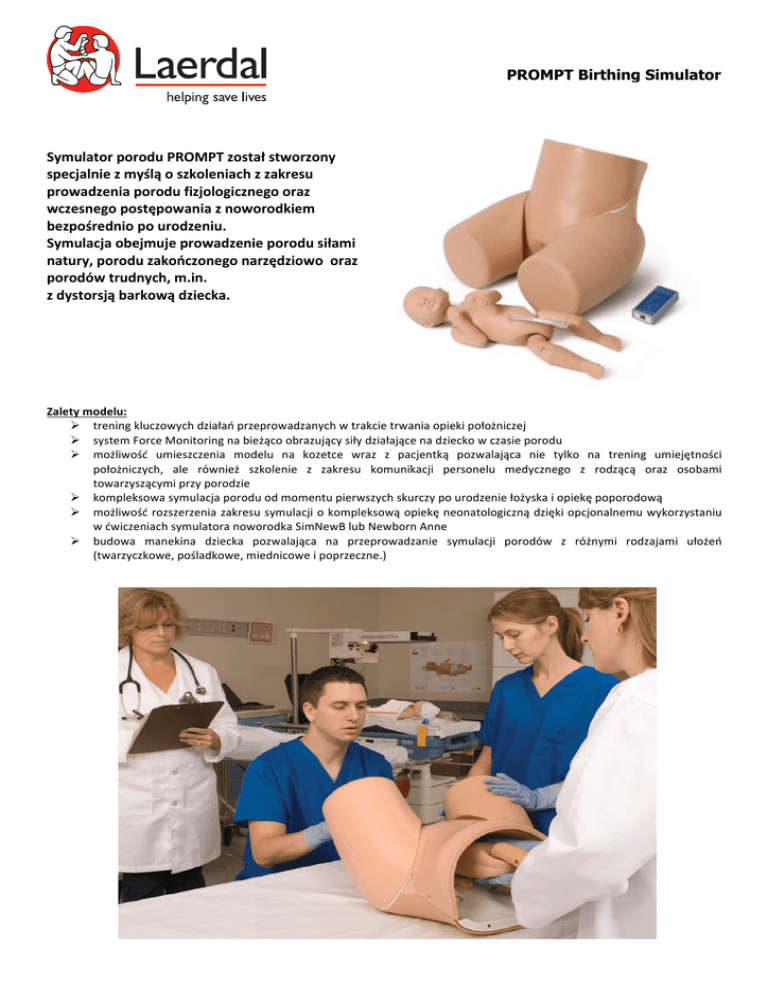 ! ! ! PROMPT Birthing Simulator ! ! ! ! ! Symulator!porodu!PROMPT!został!stworzony! specjalnie!z!myślą!o!szkoleniach!z!zakresu! prowadzenia!porodu!fizjologicznego!oraz! wczesnego!postępowania!z!noworodkiem! bezpośrednio!po!urodzeniu.!! Symulacja!obejmuje!prowadzenie!porodu!siłami! natury,!porodu!zakończonego!narzędziowo!!oraz! porodów!trudnych,!m.in.!! z!dystorsją!barkową!dziecka.!! ! ! ! ! ! ! ! Zalety!modelu:! ! trening!kluczowych!działań!przeprowadzanych!w!trakcie!trwania!opieki!położniczej! ! system!Force!Monitoring!na!bieżąco!obrazujący!siły!działające!na!dziecko!w!czasie!porodu! ! możliwość! umieszczenia! modelu! na! kozetce! wraz! z! pacjentką! pozwalająca! nie! tylko! na! trening! umiejętności! położniczych,! ale! również! szkolenie! z! zakresu! komunikacji! personelu! medycznego! z! rodzącą! oraz! osobami! towarzyszącymi!przy!porodzie! ! kompleksowa!symulacja!porodu!od!momentu!pierwszych!skurczy!po!urodzenie!łożyska!i!opiekę!poporodową! ! możliwość!rozszerzenia!zakresu!symulacji!o!kompleksową!opiekę!neonatologiczną!dzięki!opcjonalnemu!wykorzystaniu! w!ćwiczeniach!symulatora!noworodka!SimNewB!lub!Newborn!Anne! ! budowa! manekina! dziecka! pozwalająca! na! przeprowadzanie! symulacji! porodów! z! różnymi! rodzajami! ułożeń! (twarzyczkowe,!pośladkowe,!miednicowe!i!poprzeczne.)! ! ! ! ! ! ! ! ! ! Cechy!i!funkcje!symulatora:! ! pierwszy!symulator!z!systemem!monitorowania!siły!oddziałującej!na!dziecko!podczas!porodu! ! model!ciężarnej!w!pełni!oddający!anatomiczną!budowę!mięśni!krocza!oraz!dna!miednicy,!skonstruowany!dokładnie! według!parametrów!pochodzących!z!tomografii!komputerowej! ! możliwość!odsłonięcia!skóry!brzucha!pacjentki!w!celu!obserwacji!zachowania!płodu!i!jego!pozycji! ! model!donoszonego!noworodka!z!wyczuwalnym!ciemiączkiem,!linia!szwu,!obojczykami!i!łopatkami! ! wyjmowane!łożysko!wraz!z!pępowiną! ! różne! możliwości! symulacji:! poród! fizjologiczny! prawidłowy,! pośladkowy,! kleszczowy! lub! próżniowy,! poród! dziecka!! z!dystorsją!barkową,!rodzenie!łożyska! ! ! Wersja!symulatora!z!systemem!Force!Monitoring!daje! użytkownikowi!unikalną!możliwość!bieżącej!obserwacji!! siły!działającej!na!dziecko!podczas!porodu.!! Wbudowany!w!model!noworodka!czujnik!tensometryczny! oraz!wygodne!w!obsłudze!oprogramowanie!obrazują!! ją!w!sposób!graficzny!na!ekranie!komputera!PC!! (nie!dołączony!do!zestawu)!wyrażoną!w!Niutonach.! Oprogramowanie!można!konfigurować!dla!różnych!! odstępów!czasu!z!użyciem!różnych!znaczników!dla! poszczególnych!zadań!co!daje!instruktorom!możliwość! dopasowania!scenariuszy!do!konkretnych!celów! dydaktycznych.!Wyniki!ćwiczeń!mogą!być!zapisane!! dla!celów!późniejszej!analizy!i!podsumowania.! ! ! ! ! ! ! ! ! Dostępne!warianty!manekina:! ! 376O00050!PROMPT!Birthing!Simulator!Standard!! ! model!ciężarnej!(dolna!część!torsu!z!udami)!! ! podstawowy!model!noworodka! ! łożysko! ! środek!nawilżający! ! torba!transportowa!i!instrukcja!obsługi! ! ! ! Materiały!zużywalne:! 376U02950!Środek!nawilżający!250ml! ! 376O00550!PROMPT!Birthing!Simulator!Force!Monitoring! ! model!ciężarnej!(dolna!część!torsu!z!udami)! ! model!noworodka!z!systemem!Force!Monitoring! ! łożysko! ! środek!nawilżający! ! przewody! ! interfejs!Force!Monitoring! ! oprogramowanie!CD! ! torba!transportowa!i!instrukcja!obsług Laerdal Medical Poland Sp. z o.o. ul. Hutnicza 6 40-241 Katowice tel. 32 493 70 20 fax 32 493 70 22 [email protected] Oddział Białystok tel. 85 874 21 52 [email protected] Oddział Poznań tel. 61 899 82 01 [email protected] Region Gdańsk tel. 601 29 09 17 [email protected] www.laerdal.pl ! Region Warszawa tel. 721 32 78 80 [email protected] Region Wrocław tel. 601 21 83 01 [email protected]
