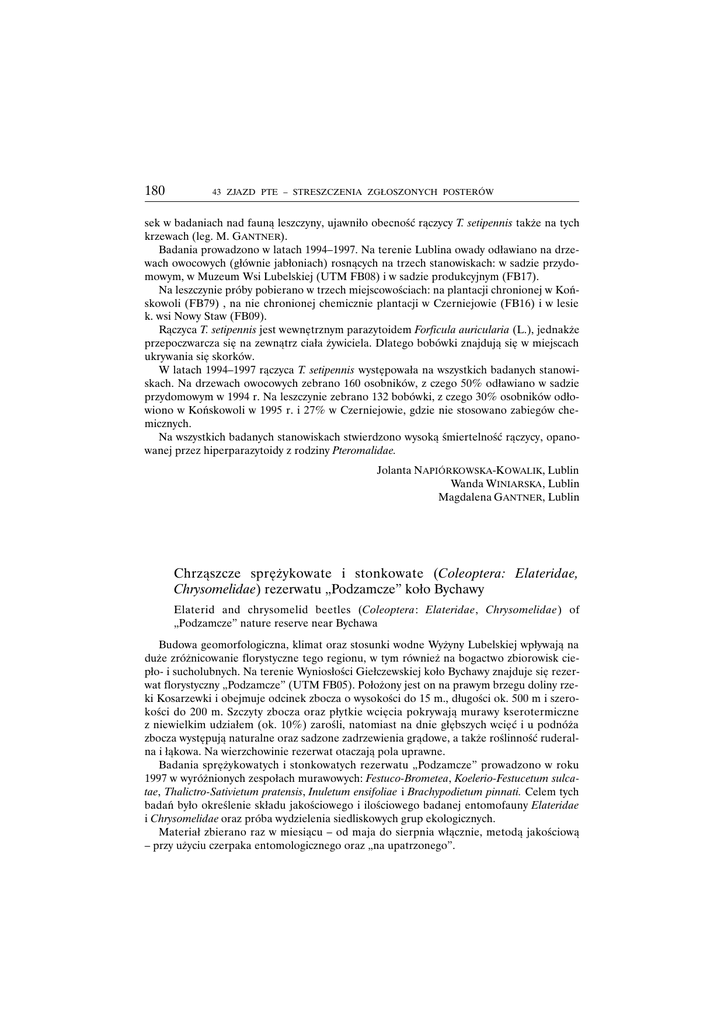 180 43 ZJAZD PTE – STRESZCZENIA ZGŁOSZONYCH POSTERÓW sek w badaniach nad fauną leszczyny, ujawniło obecność rączycy T. setipennis także na tych krzewach (leg. M. GANTNER). Badania prowadzono w latach 1994–1997. Na terenie Lublina owady odławiano na drzewach owocowych (głównie jabłoniach) rosnących na trzech stanowiskach: w sadzie przydomowym, w Muzeum Wsi Lubelskiej (UTM FB08) i w sadzie produkcyjnym (FB17). Na leszczynie próby pobierano w trzech miejscowościach: na plantacji chronionej w Końskowoli (FB79) , na nie chronionej chemicznie plantacji w Czerniejowie (FB16) i w lesie k. wsi Nowy Staw (FB09). Rączyca T. setipennis jest wewnętrznym parazytoidem Forficula auricularia (L.), jednakże przepoczwarcza się na zewnątrz ciała żywiciela. Dlatego bobówki znajdują się w miejscach ukrywania się skorków. W latach 1994–1997 rączyca T. setipennis występowała na wszystkich badanych stanowiskach. Na drzewach owocowych zebrano 160 osobników, z czego 50% odławiano w sadzie przydomowym w 1994 r. Na leszczynie zebrano 132 bobówki, z czego 30% osobników odłowiono w Końskowoli w 1995 r. i 27% w Czerniejowie, gdzie nie stosowano zabiegów chemicznych. Na wszystkich badanych stanowiskach stwierdzono wysoką śmiertelność rączycy, opanowanej przez hiperparazytoidy z rodziny Pteromalidae. Jolanta NAPIÓRKOWSKA-K OWALIK, Lublin Wanda WINIARSKA , Lublin Magdalena GANTNER, Lublin Chrząszcze sprężykowate i stonkowate (Coleoptera: Elateridae, Chrysomelidae) rezerwatu „Podzamcze” koło Bychawy Elaterid and chrysomelid beetles (Coleoptera: Elateridae, Chrysomelidae) of „Podzamcze” nature reserve near Bychawa Budowa geomorfologiczna, klimat oraz stosunki wodne Wyżyny Lubelskiej wpływają na duże zróżnicowanie florystyczne tego regionu, w tym również na bogactwo zbiorowisk ciepło- i sucholubnych. Na terenie Wyniosłości Giełczewskiej koło Bychawy znajduje się rezerwat florystyczny „Podzamcze” (UTM FB05). Położony jest on na prawym brzegu doliny rzeki Kosarzewki i obejmuje odcinek zbocza o wysokości do 15 m., długości ok. 500 m i szerokości do 200 m. Szczyty zbocza oraz płytkie wcięcia pokrywają murawy kserotermiczne z niewielkim udziałem (ok. 10%) zarośli, natomiast na dnie głębszych wcięć i u podnóża zbocza występują naturalne oraz sadzone zadrzewienia grądowe, a także roślinność ruderalna i łąkowa. Na wierzchowinie rezerwat otaczają pola uprawne. Badania sprężykowatych i stonkowatych rezerwatu „Podzamcze” prowadzono w roku 1997 w wyróżnionych zespołach murawowych: Festuco-Brometea, Koelerio-Festucetum sulcatae, Thalictro-Sativietum pratensis, Inuletum ensifoliae i Brachypodietum pinnati. Celem tych badań było określenie składu jakościowego i ilościowego badanej entomofauny Elateridae i Chrysomelidae oraz próba wydzielenia siedliskowych grup ekologicznych. Materiał zbierano raz w miesiącu – od maja do sierpnia włącznie, metodą jakościową – przy użyciu czerpaka entomologicznego oraz „na upatrzonego”. WIAD. ENTOMOL., 17 Supl.: POZNAŃ 1998 181 Wśród złowionych owadów wyróżniono 11 gatunków Elateridae. Najliczniej występowały: Selatosomus latus (F ABR.), Adrastus rachifer (FOURCR.) oraz Agriotes ustulatus (SCHALL.) związany z roślinami z rodziny baldaszkowatych, obficie rosnącymi na terenie rezerwatu. Pozostałe gatunki poławiano mniej licznie, a niektóre pojedynczo. W przypadku stonkowatych, poławiano zarówno gatunki eurytopowe, które przechodziły do zbiorowisk kserotermicznych z przyległych pól i łąk, jak też gatunki stenotopowe – kserotermofilne, znajdujące na nasłonecznionych zboczach rezerwatu optymalne warunki bytowe. Do form kserotermofilnych należały: Coptocephala rubicunda (LAICH.), Dibolia schillingi (LETZN.), D. cryptocephala (K OCH), Longitarsus obliteratus (ROSENH.) i Pachybrachis tessellatus (OLIV.). Krzysztof PAWLĘGA, Lublin Radosław ŚCIBIOR, Lublin Kalendarium pojubileuszowe 75-lecia „Polskiego Pisma Entomologicznego – Bulletin Entomologique de [la] Pologne” After 75th Anniversary of the „Polskie Pismo Entomologiczne – Bulletin Entomologique de [la] Pologne” – a chronological review Poster jest przeglądem dat i działań z lat 1922–1998, związanych z kształtowaniem się profilu merytorycznego i formy edytorskiej głównego obecnie i najstarszego periodyku Polskiego Związku/Towarzystwa Entomologicznego. Przedstawiono je na tle najważniejszych wydarzeń zachodzących w tym czasie w naszym stowarzyszeniu. „Polskie Pismo Entomologiczne” powstało w wyniku uchwały członków sekcji entomologicznej Polskiego Towarzystwa Przyrodników im. Kopernika we Lwowie, podjętej na zebraniu w dniu 6 marca 1922 r. Dwa miesiące później wyszedł z druku pierwszy zeszyt „PPE”. Tytuł periodyku został potwierdzony w pierwszym statucie powstałego 9 miesięcy później samodzielnego Polskiego Związku Entomologicznego. Ukształtowane w okresie międzywojennym profil merytoryczny i forma edytorska „PPE” zostały po wojnie potwierdzone uchwałą XVIII Walnego Zgromadzenia PZE powziętą we Wrocławiu w dniu 12 kwietnia 1947 r. [„... kontynuować wydawnictwo periodyku związkowego pod niezmienioną nazwą i w tej samej formie”]. Tak więc odnośnym wzorcem edytorskim „Pisma” stał się ostatni przedwojenny tom XVII, a praktycznym potwierdzeniem tej intencji był pierwszy zeszyt tomu XVIII, wydany w 1949 r. Wszelkie następne zmiany edytorskie dokonywane w latach 1953–1981 zostały wprowadzone w wyniku kolejnych uchwał Walnych Zgromadzeń. I tak, XXIII Walne Zgromadzenie (Cieplice, 17–18 VII 1953) powołalo do życia dwie serie „Pisma”: „A” (publikacje oryginalne) i „B” (prace popularno-naukowe, przeglądowe oraz informacyjne). Z kolei Walne Zgromadzenie obradujące w ramach XXX Zjazdu PZE (Rogów, 23–25 X 1965) upoważniło Zarząd Główny do przeprowadzenia zmian edytorskich, w wyniku których w miej