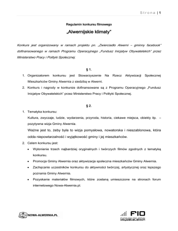 Strona |1 Regulamin konkursu filmowego „Alwernijskie klimaty” Konkurs jest organizowany w ramach projektu pn. „Zwierciadło Alwerni – gminny facebook” dofinansowanego w ramach Programu Operacyjnego „Fundusz Inicjatyw Obywatelskich” przez Ministerstwo Pracy i Polityki Społecznej. § 1. 1. Organizatorem konkursu jest Stowarzyszenie Na Rzecz Aktywizacji Społecznej Mieszkańców Gminy Alwernia z siedzibą w Alwerni. 2. Konkurs i nagrody w konkursie dofinansowane są z Programu Operacyjnego „Fundusz Inicjatyw Obywatelskich” przez Ministerstwo Pracy i Polityki Społecznej. § 2. 1. Tematyka konkursu: Kultura, zwyczaje, ludzie, wydarzenia, przyroda, historia, ciekawe miejsca, obiekty itp. – pozytywna wizja Gminy Alwernia. Ważne jest to, żeby była to wizja pomysłowa, nowatorska i nieszablonowa, która odda niepowtarzalność i wyjątkowość gminy i jej mieszkańców. 2. Celem konkursu jest: Wyłonienie trzech najbardziej oryginalnych i twórczych filmów zgodnych z tematyką konkursu. Promocja Gminy Alwernia oraz aktywizacja społeczna mieszkańców Gminy Alwernia. Zachęcanie uczestników konkursu do aktywności twórczej, artystycznej oraz lepszego poznania Gminy Alwernia. Pozyskanie materiałów filmowych, które zostaną umieszczone na stronach forum internetowego Nowa-Alwernia.pl. Strona |2 § 3. Zasady uczestnictwa 1. Konkurs skierowany jest do mieszkańców Gminy Alwernia. 2. Praca może być zgłoszona przez uczestnika indywidualnego lub przez grupę reżyserską, przy czym wszyscy uczestnicy konkursu muszą spełniać warunek określony w punkcie 1. 3. Zgłoszona grupa reżyserska nie może liczyć więcej niż trzy osoby. 4. Grupa reżyserska wskazuje Koordynatora Grupy, który w przypadku wygrania nagrody przez Grupę Reżyserską uprawniony będzie do jej odbioru. 5. Praca filmowa musi być zgodna z tematyką konkursu. 6. Twórcy filmu mogą wykorzystać różnego rodzaju gatunki filmowe (np. reportaż, wywiad, dokument, opowieść fabularyzowaną, prezentację itp.). 7. Maksymalny dopuszczalny czas trwania filmu konkursowego to 6 minut, każdy autor (grupa) może oddać maksymalnie 2 prace. 8. Warunkiem uczestnictwa jest dostarczenie zgłoszenia do Organizatora Konkursu nie później niż do 30 października 2011 na wzorze stanowiącym Załącznik nr 1 do niniejszego regulaminu oraz przesłanie go w wersji elektronicznej na adres [email protected]. 9. Organizator Konkursu może udzielić wsparcia uczestnikom przede wszystkim poprzez: udostępnienie nieodpłatnie cyfrowej kamery wideo na warunkach indywidualnie ustalonych z przedstawiciel Zarządu Stowarzyszenia, udostępnienie nieodpłatnie nośników elektronicznych, organizując warsztaty, których celem będzie przekazanie podstawowej wiedzy i umiejętności z zakresu tworzenia filmów amatorskich, świadcząc pomoc i doradztwo podczas tworzenia filmu. § 4. Prace konkursowe 1. Prace konkursowe należy dostarczyć do 10 listopada 2011 do siedziby Organizatora Konkursu (Rynek 7, Alwernia) na nośniku elektronicznym lub przesłać na adres [email protected]. 2. Warunkiem przyjęcia pracy jest jednoznaczny opis materiału pozwalający na identyfikację Strona |3 uczestnika lub grupy reżyserskiej. 3. Nośniki elektroniczne (płyty DVD) są dostępne również u organizatora konkursu nieodpłatnie na podstawie złożonego zgłoszenia. 4. Film zapisany powinien być w formacie divx, mov, avi, mpeg, mpg, mp4, wmv. 5. Praca konkursowa nie może naruszać praw autorskich oraz prawa do prywatności osób trzecich. Prezentowane w niej treści nie mogą przedstawiać ani propagować zachowań zabronionych przez prawo, nieobyczajnych lub godzących w zasady dobrego wychowania i kultury osobistej. § 4. Prawa autorskie 1. Zgłaszając film, twórcy oświadczają, że przysługuje im autorskie prawo majątkowe i osobiste do nadesłanego filmu. 2. Twórcy zgadzają się na publikowanie i odtwarzanie filmu przez Organizatorów Konkursu na wszelkich polach eksploatacji. 3. Twórcy oświadczają, że nie będą rościć praw do wynagrodzenia z tytułu wykorzystania zrealizowanych przez nich filmów na wszelkich polach eksploatacji. 4. Zgłoszenie prac na konkurs uważane będzie za uznanie warunków regulaminu, wyrażenie zgody na publikowanie danych osobowych zgodnie z ustawą z dnia 28.08.1997r. o ochronie danych osobowych (Dz. U. Nr.133 poz. 883) na potrzeby organizacji konkursu oraz przeniesienie praw autorskich w całości na rzecz Organizatora Konkursu. § 5. Kryteria oceny prac konkursowych 1. Przy ocenie prac będzie brane pod uwagę: pomysłowość, technika wykonania, stopień zgodności z tematyką konkursu, wrażenia artystyczne oraz wyniki głosowań użytkowników forum internetowego Nowa-Alwernia.pl 2. Ocena prac przeprowadzona będzie przez Komisję Oceniającą, w skład której wejdzie przedstawiciel Organizatora Konkursu, przedstawiciel samorządu i przedstawiciel oświaty. 3. Przyznane zostaną trzy równorzędne nagrody rzeczowe o wartości nie przekraczającej 1000 zł. 4. Ostateczna interpretacja „Regulaminu Konkursu” oraz sposób przydziału nagród należy do Komisji Oceniającej. Strona |4 § 6. Ogłoszenie wyników 1. O wynikach konkursu, terminie i miejscu wręczenia nagród laureaci zostaną poinformowani pisemnie oraz za pośrednictwem forum Nowa-Alwernia.pl. § 6. Uwagi końcowe 1. Wszystkie prace konkursowe zgłoszone na nośnikach CD-ROM i DVD, pozostają w archiwum Organizatora konkursu. 2. Zgłoszony do konkursu nośnik CD-ROM lub DVD na którym zmieszczona została praca konkursowa staje się własnością Organizatora i nie będą zwracane. 3. Organizator może odmówić przyjęcia pracy konkursowej lub wycofać ją z konkursu jeżeli nie spełnia ona warunków Regulaminu Konkursu. 4. Organizator zastrzega sobie prawo do przerwania lub unieważnienia konkursu bez podania przyczyn. 5. Wszystkie zgłoszone prace spełniające założenia Regulaminu Konkursu zostaną udostępnione na