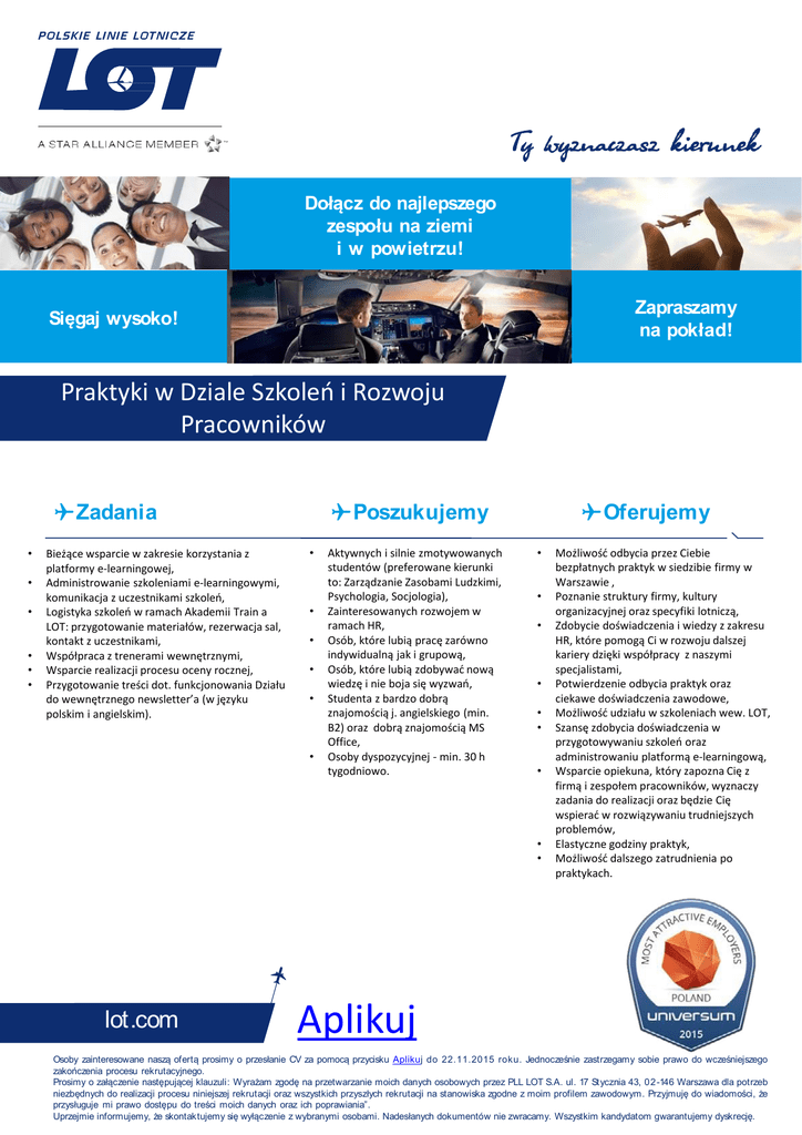 Dołącz do najlepszego zespołu na ziemi i w powietrzu! Zapraszamy na pokład! Sięgaj wysoko! Praktyki w Dziale Szkoleń i Rozwoju Pracowników w siedzibie PLL LOT SA (Warszawa) ✈ Zadania • • • • • • Bieżące wsparcie w zakresie korzystania z platformy e-learningowej, Administrowanie szkoleniami e-learningowymi, komunikacja z uczestnikami szkoleń, Logistyka szkoleń w ramach Akademii Train a LOT: przygotowanie materiałów, rezerwacja sal, kontakt z uczestnikami, Współpraca z trenerami wewnętrznymi, Wsparcie realizacji procesu oceny rocznej, Przygotowanie treści dot. funkcjonowania Działu do wewnętrznego newsletter’a (w języku polskim i angielskim). ✈ Poszukujemy • • • • • • Aktywnych i silnie zmotywowanych studentów (preferowane kierunki to: Zarządzanie Zasobami Ludzkimi, Psychologia, Socjologia), Zainteresowanych rozwojem w ramach HR, Osób, które lubią pracę zarówno indywidualną jak i grupową, Osób, które lubią zdobywać nową wiedzę i nie boja się wyzwań, Studenta z bardzo dobrą znajomością j. angielskiego (min. B2) oraz dobrą znajomością MS Office, Osoby dyspozycyjnej - min. 30 h tygodniowo. ✈ Oferujemy • • • • • • • • • lot.com Możliwość odbycia przez Ciebie bezpłatnych praktyk w siedzibie firmy w Warszawie , Poznanie struktury firmy, kultury organizacyjnej oraz specyfiki lotniczą, Zdobycie doświadczenia i wiedzy z zakresu HR, które pomogą Ci w rozwoju dalszej kariery dzięki współpracy z naszymi specjalistami, Potwierdzenie odbycia praktyk oraz ciekawe doświadczenia zawodowe, Możliwość udziału w szkoleniach wew. LOT, Szansę zdobycia doświadczenia w przygotowywaniu szkoleń oraz administrowaniu platformą e-learningową, Wsparcie opiekuna, który zapozna Cię z firmą i zespołem pracowników, wyznaczy zadania do realizacji oraz będzie Cię wspierać w rozwiązywaniu trudniejszych problemów, Elastyczne godziny praktyk, Możliwość dalszego zatrudnienia po praktykach. Aplikuj Osoby zainteresowane naszą ofertą prosimy o przesłanie CV za pomocą przycisku Aplikuj do 22.11.2015 roku. Jednocześnie zastrzegamy sobie prawo do wcześniejszego zakończenia procesu rekrutacyjnego. Prosimy o załączenie następującej klauzuli: Wyrażam zgodę na przetwarzanie moich danych osobowych przez PLL LOT S.A. ul. 17 St ycznia 43, 0 2-146 Warszawa dla potrzeb niezbędnych do realizacji procesu niniejszej rekrutacji oraz wszystkich przyszłych rekrutacji na stanowiska zgodne z moim profilem zawodowym. Przyjmuję do wiadomości, że przysługuje mi prawo dostępu do treści moich danych oraz ich poprawiania”. Uprzejmie informujemy, że skontaktujemy się wyłączenie z wybranymi osobami. Nadesłanych dokumentów nie zwracamy. Wszystkim kandydatom gwarantujemy dyskrecję.