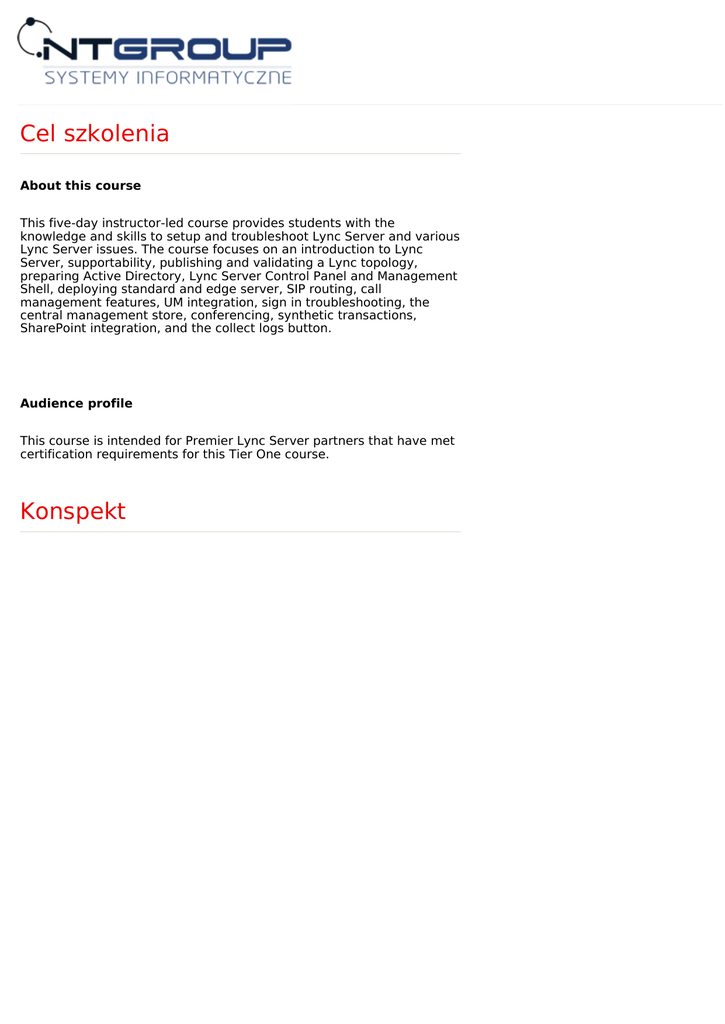 Cel szkolenia About this course This five-day instructor-led course provides students with the knowledge and skills to setup and troubleshoot Lync Server and various Lync Server issues. The course focuses on an introduction to Lync Server, supportability, publishing and validating a Lync topology, preparing Active Directory, Lync Server Control Panel and Management Shell, deploying standard and edge server, SIP routing, call management features, UM integration, sign in troubleshooting, the central management store, conferencing, synthetic transactions, SharePoint integration, and the collect logs button. Audience profile This course is intended for Premier Lync Server partners that have met certification requirements for this Tier One course. Konspekt At course completion After completing this course, students will be able to: · Identify Lync 2010 server and client features · Understand the supported topologies, hardware, infrastructure, and coexistence models · Understand and identify all the steps that go into planning a Lync environment · Define a topology using Topology Builder · Go through the necessary steps to prepare Active Directory for Lync · Be able to use the Lync Server Control Panel to manage users and computers in the topology · Use PowerShell to complete basic tasks · Deploy Lync Standard and Edge server · Understand basic SIP Routing · Understand the requirements and features of call management · Grasp the concept and features of integrated Unified Messaging and Lync · Troubleshoot Lync sign in · Identify what is stored in the CMS and how to trouble shoot it · Go over Lync Server conferencing capabilities and how to plan for it · Deploy Synthetic Transactions · Integrate SharePoint with Lync environments · Know how to use the collect logs buton Dodatkowe informacje W cenę szkolenia wliczony jest: Certyfikat Microsoft Materiały szkoleniowe, notatnik, długopis Kontakt z trenerem po szkoleniu Kawa, herbata, słodki poczęstunek Obiad Firma posiada wpis w Urzędzie Miasta Łodzi jako placówka kształcenia ustawicznego. Nazwa: Szkolenie MS 50572 Premier Support for Lync Partners Tier 1 Czas trwania: 5 dni Ilość godzin: 40 Język: Prowadzący: Certyfikowany Trener Microsoft Lokalizacja: NT Group Łódź, siedziba klienta, lub dowolne miasto w Polsce Cena szkolenia: 3900 PLN Dostępne terminy NT GROUP Sp. z o.o. 90-418 Łódź, Al. T. Kościuszki 39 III piętro infolina 801 011 684 Tel.: +48 42 655-33-77; Fax: +48 42 630-15-63 e-mail: [email protected] NT Group Systemy Informatyczne Sp. z o.o. Krajowy Rejestr Sądowy Konto Bankowe 90-418 Łódź, Al. T. Kościuszki 39 III piętro KRS 0000214993 Kredyt Bank S.A. tel.: +42 6553377 Sąd Rejonowy dla Łodzi-Śródmieścia Rozliczenie Krajowe: tel. / fax. +42 6301563 w Łodzi, XX Wydział KRS 71 1500 1246 1215 4005 5991 0000 e-mail: [email protected] www.ntgroup.pl Rozliczenie Zagraniczne: Regon: 470557218 PL 71 1500 1246 1215 4005 5991 0000 NIP: 7251888624 KRDBPLPW