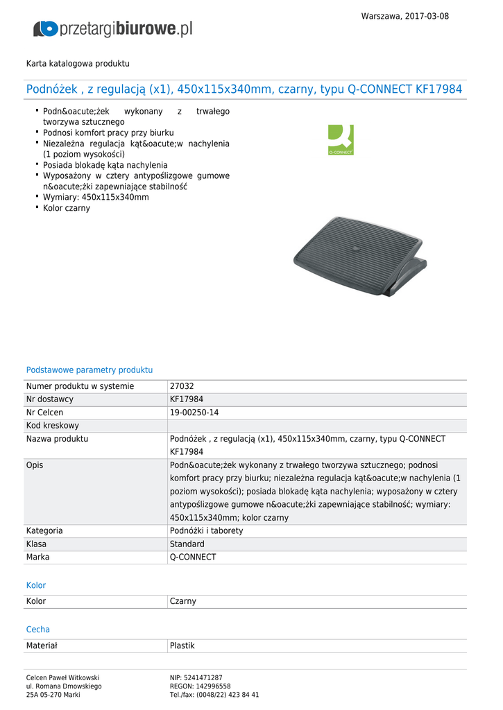Warszawa, 2017-03-08 Karta katalogowa produktu Podnóżek , z regulacją (x1), 450x115x340mm, czarny, typu Q-CONNECT KF17984 Podnóżek wykonany z trwałego tworzywa sztucznego Podnosi komfort pracy przy biurku Niezależna regulacja kątów nachylenia (1 poziom wysokości) Posiada blokadę kąta nachylenia Wyposażony w cztery antypoślizgowe gumowe nóżki zapewniające stabilność Wymiary: 450x115x340mm Kolor czarny Podstawowe parametry produktu Numer produktu w systemie 27032 Nr dostawcy KF17984 Nr Celcen 19-00250-14 Kod kreskowy Nazwa produktu Podnóżek , z regulacją (x1), 450x115x340mm, czarny, typu Q-CONNECT KF17984 Opis Podnóżek wykonany z trwałego tworzywa sztucznego; podnosi komfort pracy przy biurku; niezależna regulacja kątów nachylenia (1 poziom wysokości); posiada blokadę kąta nachylenia; wyposażony w cztery antypoślizgowe gumowe nóżki zapewniające stabilność; wymiary: 450x115x340mm; kolor czarny Kategoria Podnóżki i taborety Klasa Standard Marka Q-CONNECT Kolor Kolor Czarny Cecha Materiał Plastik Celcen Paweł Witkowski ul. Romana Dmowskiego 25A 05-270 Marki NIP: 5241471287 REGON: 142996558 Tel./fax: (0048/22) 423 84 41 Warszawa, 2017-03-08 Karta katalogowa produktu cd. Podnóżek , z regulacją (x1), 450x115x340mm, czarny, typu Q-CONNECT KF17984 Produkt Podnóżek Typ 1 poziom wysokości W ofercie od 2016-02 Wymiary Wymiary (mm) 450x115x340 Wysokość (mm) 115 Certyfikaty Hit Standard Nowy produkt w ofercie Standard Wspólny słownik zamówień CPV 39113700-4 Podnóżki Zamiennik Zamiennik KF20073 Jesteśmy przekonani, że z pomocą przetargibiurowe.pl usprawnicie Państwo własne procesy biznesowe związane ze żmudnym poszukiwaniem odpowiadających Państwu produktów oraz opracowaniem specyfikacjii zapytań ofertowych. Serdecznie zapraszamy do wspópracy Zespół, PrzetargiBiurowe.pl Celcen Paweł Witkowski ul. Romana Dmowskiego 25A 05-270 Marki NIP: 5241471287 REGON: 142996558 Tel./fax: (0048/22) 423 84 41