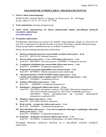 śagań, 2009-07-21 OGŁOSZENIE O PRZETARGU NIEOGRANICZONYM 1. Nazwa i adres zamawiającego: POWIATOWY URZĄD PRACY w śaganiu, ul. Dworcowa 9, 68 – 100 śagań tel./fax (068) 377 32 75, 477 78 39, 477 78 40 2. Tryb zamówienia: przetarg nieograniczony 3. Adres strony internetowej, na której zamieszczona będzie specyfikacja istotnych warunków zamówienia: www.pup.zagan.pl 4. Przedmiot zamówienia: Przedmiotem zamówienia jest dostawa do siedziby Zamawiającego (śagań, ul. Dworcowa 9) oraz Filii w Szprotawie (ul. Bronka Kozaka 5) na koszt Wykonawcy sprzętu informatycznego. Zakup sprzętu będzie współfinansowany ze środków Funduszu Pracy. Wykaz sprzętu będącego przedmiotem zamówienia: 1) Sieciowa drukarka laserowa czarno-biała A4 (fabrycznie nowa) – 8 szt. Kod CPV: 30232110-8 Drukarki laserowe 2) Serwer (fabrycznie nowy) – 1 szt + UPS (fabrycznie nowy) – 1 szt Kod CPV: 48821000-9 Serwery sieciowe, 32420000-3 Urządzenia sieciowe 3) Urządzenie wielofunkcyjne czarno-białe (fabrycznie nowe) – 2 szt Kod CPV: 30200000-1 Urządzenia komputerowe 4) Program do tworzenia kopii plików oraz obrazu dysku – 3 szt Kod CPV: 48700000-5 Pakiety oprogramowania uŜytkowego 5) Akcesoria sieciowe 3COM 3CSFP91 (fabrycznie nowe) – 2 szt + patch cord światłowodowy duplex typu LC.LC (fabrycznie nowy) – 2 szt Kod CPV: 32420000-3 Urządzenia sieciowe 6) Zasilacz UPS (fabrycznie nowy) – 5 szt Kod CPV: 30200000-1 Urządzenia komputerowe 7) Komputery stacjonarne (fabrycznie nowe) – 24 szt Kod CPV: 30213000-5 Komputery osobiste, 30237460-1 Klawiatury komputerowe, 30237410-6 Myszka komputerowa, 30237220-7 Podkładki pod myszy, 48624000-8 Pakiety oprogramowania dla systemów operacyjnych komputerów osobistych (PC) 8) Monitory (fabrycznie nowe) – 6 szt Kod CPV: 30231300-0 Monitory ekranowe 9) Dysk twardy - zewnętrzny (fabrycznie nowy) – 1 szt Kod CPV: 30200000-1 Urządzenia komputerowe 10) Firewall (fabrycznie nowy) – 2 szt. oraz urządzenie zbierające i analizujące zdarzenia (fabrycznie nowe) – 2 szt. Kod CPV: 30200000-1 Urządzenia komputerowe 11) Kopiarko – drukarka A3 sieciowa (fabrycznie nowa) – 1 szt Kod CPV: 30120000-6 Urządzenia fotokopiujące i do druku offsetowego Wymagane parametry techniczne określone są w specyfikacji istotnych warunków zamówienia. 1 5. Oferty częściowe: Zamawiający dopuszcza moŜliwość składania ofert częściowych. Wykonawca moŜe złoŜyć oferty częściowe na jedną lub więcej części zamówienia: – I część – Sieciowa drukarka laserowa – II część – Serwer + UPS – III część – Urządzenie wielofunkcyjne – IV część – Program do tworzenia kopii plików – V część – Akcesoria sieciowe – VI część – Zasilacz UPS – VII część – Komputery – VIII część – Monitory – IX część – Dysk twardy zewnętrzny – X część – Firewall + urządzenie zbierające i analizujące zdarzenia – XI część – Kopiarko – drukarka 6. Informacja o ofercie wariantowej: Zamawiający nie dopuszcza moŜliwości składania ofert wariantowych. 7. Termin wykonania zamówienia: w terminie 30 dni po podpisaniu umowy 8. Opis warunków udziału w postępowaniu oraz opis sposobu dokonywania oceny spełniania tych warunków: O zamówienie mogą ubiegać się wykonawcy, którzy: a) posiadają uprawnienia do wykonywania określonej działalności lub czynności, b) posiadają niezbędną wiedzę i doświadczenie oraz dysponują potencjałem technicznym i osobami zdolnymi do wykonania zamówienia lub przedstawią pisemne zobowiązanie innych podmiotów do udostępnienia potencjału technicznego i osób zdolnych do wykonania zamówienia, c) znajdują się w sytuacji ekonomicznej i finansowej zapewniającej wykonanie zamówienia, d) nie podlegają wykluczeniu z postępowania o udzielenie zamówienia na podstawie art. 24 ustawy Prawo zamówień publicznych (Dz.U. z 2007r., Nr 223, poz. 1655 z późn.zm.). Zamawiający dokona oceny spełnienia w/w warunków na podstawie dokumentów wymaganych w specyfikacji istotnych warunków zamówienia. 9. Informacja na temat wadium: Zamawiający nie Ŝąda od wykonawcy wniesienia wadium. 10. Kryteria oceny ofert i ich znaczenie: Przy wyborze najkorzystniejszej oferty Zamawiający będzie kierował się następującymi kryteriami: • przy wyborze oferty w zakresie: I część – Sieciowa drukarka laserowa, II część – Serwer + UPS, III część – Urządzenie wielofunkcyjne, VI część – Zasilacz UPS, VII część – Komputery, VIII część – Monitory, X część – Firewall + urządzenie zbierające i analizujące zdarzenia, XI część – Kopiarko – drukarka: a) cena – 85 % b) czas podjęcia działań serwisowych (podany w godz.) – 15 % Ad.a) Oferta otrzyma zaokrągloną do dwóch miejsc po przecinku ilość punktów wynikającą z działania: Wartość = (Cn/Cb) x 85 % x 100 gdzie: Cn – najniŜsza cena brutto wśród złoŜonych ofert Cb – cena brutto badanej oferty 2 Ad.b) Oferta otrzyma zaokrągloną do dwóch miejsc po przecinku ilość punktów wynikającą z działania: Wartość = (Smin/Sb) x 15 % x 100 gdzie: Smin – najkrótszy czas podjęcia działań serwisowych wśród złoŜonych ofert Sb – czas podjęcia działań serwisowych badanej oferty Ostateczna ocena punktowa oferty będzie zaokrągloną do dwóch miejsc po przecinku liczbą wynikającą ze zsumowania ilości punktów, jakie otrzyma ta oferta za poszczególne kryteria. Zamówienie zostanie udzielone Wykonawcy, którego oferta uzyska najwyŜszą liczbę punktów w ostatecznej ocenie punktowej. • przy wyborze oferty w zakresie: IV część – Program do tworzenia kopii plików, V część – Akcesoria sieciowe, IX część – Dysk twardy zewnętrzny: cena – 100 % Zamawiający udzieli zamówienia Wykonawcy, którego oferta będzie najkorzystniejsza pod względem ceny. Punkty dla pozostałych ofert zostaną obliczone wg wzoru: Wartość = (Cn/Cb) x 100 % x 100 gd