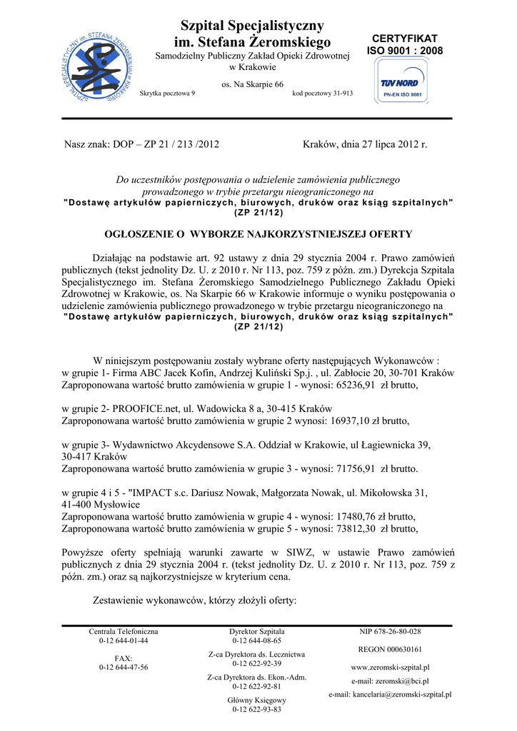 Szpital Specjalistyczny im. Stefana Żeromskiego CERTYFIKAT ISO 9001 : 2008 Samodzielny Publiczny Zakład Opieki Zdrowotnej w Krakowie os. Na Skarpie 66 Skrytka pocztowa 9 kod pocztowy 31-913 Nasz znak: DOP – ZP 21 / 213 /2012 Kraków, dnia 27 lipca 2012 r. Do uczestników postępowania o udzielenie zamówienia publicznego prowadzonego w trybie przetargu nieograniczonego na "Dos taw ę a rtyk uł ów pa pi e rni c zyc h, bi urow yc h, druk ów ora z ks ią g s zpi ta l n yc h" (ZP 21 /1 2 ) OGŁOSZENIE O WYBORZE NAJKORZYSTNIEJSZEJ OFERTY Działając na podstawie art. 92 ustawy z dnia 29 stycznia 2004 r. Prawo zamówień publicznych (tekst jednolity Dz. U. z 2010 r. Nr 113, poz. 759 z późn. zm.) Dyrekcja Szpitala Specjalistycznego im. Stefana Żeromskiego Samodzielnego Publicznego Zakładu Opieki Zdrowotnej w Krakowie, os. Na Skarpie 66 w Krakowie informuje o wyniku postępowania o udzielenie zamówienia publicznego prowadzonego w trybie przetargu nieograniczonego na "Dos taw ę a rtyk uł ów pa pi e rni c zyc h, bi urow yc h, druk ów ora z ks ią g s zpi ta l n yc h" (ZP 21 /1 2 ) W niniejszym postępowaniu zostały wybrane oferty następujących Wykonawców : w grupie 1- Firma ABC Jacek Kofin, Andrzej Kuliński Sp.j. , ul. Zabłocie 20, 30-701 Kraków Zaproponowana wartość brutto zamówienia w grupie 1 - wynosi: 65236,91 zł brutto, w grupie 2- PROOFICE.net, ul. Wadowicka 8 a, 30-415 Kraków Zaproponowana wartość brutto zamówienia w grupie 2 wynosi: 16937,10 zł brutto, w grupie 3- Wydawnictwo Akcydensowe S.A. Oddział w Krakowie, ul Łagiewnicka 39, 30-417 Kraków Zaproponowana wartość brutto zamówienia w grupie 3 - wynosi: 71756,91 zł brutto. w grupie 4 i 5 - "IMPACT s.c. Dariusz Nowak, Małgorzata Nowak, ul. Mikołowska 31, 41-400 Mysłowice Zaproponowana wartość brutto zamówienia w grupie 4 - wynosi: 17480,76 zł brutto, Zaproponowana wartość brutto zamówienia w grupie 5 - wynosi: 73812,30 zł brutto, Powyższe oferty spełniają warunki zawarte w SIWZ, w ustawie Prawo zamówień publicznych z dnia 29 stycznia 2004 r. (tekst jednolity Dz. U. z 2010 r. Nr 113, poz. 759 z późn. zm.) oraz są najkorzystniejsze w kryterium cena. Zestawienie wykonawców, którzy złożyli oferty: Centrala Telefoniczna 0-12 644-01-44 FAX: 0-12 644-47-56 Dyrektor Szpitala 0-12 644-08-65 Z-ca Dyrektora ds. Lecznictwa 0-12 622-92-39 Z-ca Dyrektora ds. Ekon.-Adm. 0-12 622-92-81 Główny Księgowy 0-12 622-93-83 NIP 678-26-80-028 REGON 000630161 www.zeromski-szpital.pl e-mail: [email protected] e-mail: [email protected] Szpital Specjalistyczny im. Stefana Żeromskiego CERTYFIKAT ISO 9001 : 2008 Samodzielny Publiczny Zakład Opieki Zdrowotnej w Krakowie os. Na Skarpie 66 Skrytka pocztowa 9 L.P. Nr oferty kod pocztowy 31-913 Nazwa i siedziba wykonawców, którzy złożyli oferty Grupa 1 1 6 Firma ABC Jacek Kofin, Andrzej Kuliński Sp.j. , ul. Zabłocie 20, 30-701 Kraków 2 7 PROOFICE.net, ul. Wadowicka 8 a, 30-415 Kraków 3 8 ARAMUS , Al. Pokoju 3, 31-548 Kraków. Grupa 2 1 3 REMI-B Sp. j., Krzysztof Boiński i Adam Krokowski, Drukarnia Artykuły Biurowe ul. Strażacka 35, 43-382 Bielsko-Biała 2 4 Wydawnictwo Akcydensowe S.A. Oddział w Krakowie, ul Łagiewnicka 39, 30-417 Kraków 3 6 Firma ABC Jacek Kofin, Andrzej Kuliński Sp.j. , ul. Zabłocie 20, 30-701 Kraków 4 7 PROOFICE.net, ul. Wadowicka 8 a, 30-415 Kraków 5 8 ARAMUS , Al. Pokoju 3, 31-548 Kraków. Grupa 3 1 4 Wydawnictwo Akcydensowe S.A. Oddział w Krakowie, ul Łagiewnicka 39, 30-417 Kraków 2 6 Firma ABC Jacek Kofin, Andrzej Kuliński Sp.j. , ul. Zabłocie 20, 30-701 Kraków 3 7 PROOFICE.net, ul. Wadowicka 8 a, 30-415 Kraków 4 8 ARAMUS , Al. Pokoju 3, 31-548 Kraków. Grupa 4 1 1 Centrum Druków Grażyna Maciuk, ul. Warszawska 49, 12-200 Pisz 2 2 "Drukarnia- Expres" Edward Błaszczyk, ul. Konstytucji nr 123, 41-906 Bytom 3 3 REMI-B Sp. j., Krzysztof Boiński i Adam Krokowski, Drukarnia Artykuły Biurowe, ul. Strażacka 35, 43-382 Bielsko-Biała 4 4 Wydawnictwo Akcydensowe S.A. Oddział w Krakowie, ul Łagiewnicka 39, 30-417 Kraków 5 5 "IMPACT s.c. Dariusz Nowak, Małgorzata Nowak, ul. Mikołowska 31, 41-400 Mysłowice Grupa 5 1 1 Centrum Druków Grażyna Maciuk, ul. Warszawska 49, 12-200 Pisz 2 2 "Drukarnia- Expres" Edward Błaszczyk, ul. Konstytucji nr 123, 41-906 Bytom 3 3 REMI-B Sp. j., Krzysztof Boiński i Adam Krokowski, Drukarnia Artykuły Biurowe, ul. Strażacka 35, 43-382 Bielsko-Biała Centrala Telefoniczna 0-12 644-01-44 FAX: 0-12 644-47-56 Dyrektor Szpitala 0-12 644-08-65 Z-ca Dyrektora ds. Lecznictwa 0-12 622-92-39 Z-ca Dyrektora ds. Ekon.-Adm. 0-12 622-92-81 Główny Księgowy 0-12 622-93-83 NIP 678-26-80-028 REGON 000630161 www.zeromski-szpital.pl e-mail: [email protected] e-mail: [email protected] Szpital Specjalistyczny im. Stefana Żeromskiego CERTYFIKAT ISO 9001 : 2008 Samodzielny Publiczny Zakład Opieki Zdrowotnej w Krakowie os. Na Skarpie 66 Skrytka pocztowa 9 kod pocztowy 31-913 4 4 Wydawnictwo Akcydensowe S.A. Oddział w Krakowie, ul Łagiewnicka 39, 30-417 Kraków 5 5 "IMPACT s.c. Dariusz Nowak, Małgorzata Nowak, ul. Mikołowska 31, 41-400 Mysłowice Zestawienie wykonawców wraz ze streszczeniem oceny i porównaniem złożonych ofert: L. Nr P. ofer ty Nazwa i siedziba wykonawców, którzy złożyli oferty Punktacja w Łączna punktacja kryterium cena Grupa 1 1 6 Firma ABC Jacek Kofin, Andrzej Kuliński Sp.j. , ul. Zabłocie 20, 30-701 Kraków 100,00 pkt 100,00 pkt 2 7 PROOFICE.net, ul. Wadowicka 8 a, 30-415 Kraków 98,90 pkt 98,90 pkt 3 8 ARAMUS , Al. Pokoju 3, 31-548 Kraków. 91,81 pkt 91,81 pkt Grupa 2 1 3 REMI-B Sp. j., Krzysztof Boiński i Adam Krokowski, Drukarnia Artykuły Biurowe ul. Strażacka 35, 43-382 Bielsko-Biała 81,41 pkt 81,41 pkt 2 4 Wydawnictwo Akcydensowe S.A. Oddział w Krakowie, ul Łagiewnicka 39, 30-417 Kraków 85,71 pkt 85,71 pkt 3 6 Firma ABC Jacek Kofin, Andrzej Kuliński Sp.j. , ul. Zabłocie 20, 30-701 Kraków 92,60 pkt 92,60 pkt 4 7 PROOFICE.net, ul. Wadowicka 8 a, 30-415