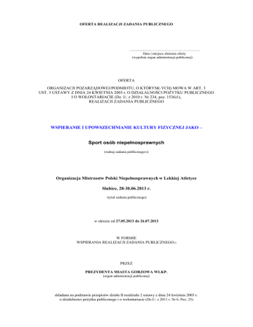 OFERTA REALIZACJI ZADANIA PUBLICZNEGO …..................……………………………… Data i miejsce złożenia oferty (wypełnia organ administracji publicznej) OFERTA ORGANIZACJI POZARZĄDOWEJ/PODMIOTU, O KTÓRYM(-YCH) MOWA W ART. 3 UST. 3 USTAWY Z DNIA 24 KWIETNIA 2003 r. O DZIAŁALNOŚCI POŻYTKU PUBLICZNEGO I O WOLONTARIACIE (Dz. U. z 2010 r. Nr 234, poz. 1536)1), REALIZACJI ZADANIA PUBLICZNEGO WSPIERANIE I UPOWSZECHNIANIE KULTURY FIZYCZNEJ JAKO – Sport osób niepełnosprawnych (rodzaj zadania publicznego2)) Organizacja Mistrzostw Polski Niepełnosprawnych w Lekkiej Atletyce Słubice, 28-30.06.2013 r. (tytuł zadania publicznego) w okresie od 27.05.2013 do 26.07.2013 W FORMIE WSPIERANIA REALIZACJI ZADANIA PUBLICZNEGO1) PRZEZ PREZYDENTA MIASTA GORZOWA WLKP. (organ administracji publicznej) składana na podstawie przepisów działu II rozdziału 2 ustawy z dnia 24 kwietnia 2003 r. o działalności pożytku publicznego i o wolontariacie (Dz.U. z 2011 r. Nr 6. Poz. 25) I. Dane oferenta/oferentów1), 3) 1) nazwa: Gorzowski Związek Sportu Niepełnosprawnych „START” zaznaczyć x 2) forma prawna:4) (x) stowarzyszenie ( ) fundacja ( ) inna…………………………………........................................................ 3) numer w Krajowym Rejestrze Sądowym, w innym rejestrze lub ewidencji:5) Sąd Gospodarczy Krajowego Rejestru Sądowego w Zielonej Górze, nr 0000120913 4) data wpisu, rejestracji lub utworzenia:6 02.07.2002r. 5) nr NIP: 599-112-74-76 nr REGON: 000744806 6) adres: miejscowość: Gorzów Wlkp. ul.: Drzymały 10 gmina: Gorzów Wlkp., powiat:8) gorzowski województwo: lubuskie kod pocztowy: 66-400 poczta: Gorzów Wlkp. 7) tel.: (95) 720 06 79 e-mail: [email protected] faks: (95) 720 06 79 http:// www.start.gorzow.pl 8) numer rachunku bankowego: 39 8372 0008 0002 5449 2000 0002 nazwa banku: Bank Spółdzielczy w Santoku, oddział w Wawrowie 9) nazwiska i imiona osób upoważnionych do reprezentowania oferenta/oferentow1): a) Jerzy Jankowski- Przewodniczący Gorzowskiego Związku Spotu Niepełnosprawnych „START” w Gorzowie Wlkp., DO nr AUA 394176 b) Zbigniew Lewkowicz- Z-ca Przewodniczącego Gorzowskiego Związku Sportu Niepełnosprawnych „START” w Gorzowie Wlkp., DO nr AGF 043435 10) nazwa, adres i telefon kontaktowy jednostki organizacyjnej bezpośrednio wykonującej zadanie, o którym mowa w ofercie:9) Gorzowski Związek Sportu Niepełnosprawnych „START”, ul. Drzymały 10, 66-400 Gorzów Wlkp., tel.: (95) 720 06 79 11) osoba upoważniona do składania wyjaśnień dotyczących oferty (imię i nazwisko oraz nr telefonu kontaktowego) Anna Rajska-Pura, Tel. (95) 720 06 79 12) przedmiot działalności pożytku publicznego: a) działalność nieodpłatna pożytku publicznego– STATUT rozdział 2 § 6 pkt. 1 i 2. 1. Celem Związku jest organizowanie i rozwijanie powszechnej kultury fizycznej, sportu, rehabilitacji, turystyki i czynnego wypoczynku wśród osób niepełnosprawnych oraz reprezentowanie interesów zrzeszonych organizacji sportowych, stanowiących działalność pożytku publicznego w myśl przepisów ustawy z dnia 24 kwietnia 2003r. o pożytku publicznym i wolontariacie (t.j. Dz.U. z 2010r. Nr 234 Poz. 1536 zm.) 2. Związek może prowadzić swoją działalność programową również na rzecz innych organizacji zgodnie z zawartymi porozumieniami. b) działalność odpłatna pożytku publicznego nie dotyczy 13) jeżeli oferent/oferenci1) prowadzi/prowadzą1) działalność gospodarczą: a) numer wpisu do rejestru przedsiębiorców nr KRS 0000120913 b) przedmiot działalności gospodarczej Przedmiot działalności gospodarczej GZSN „START”: 93.19.Z – Udzielanie swym członkom niezbędnej pomocy w ich działalności w zakresie kultury fizycznej, sportu, rehabilitacji, turystyki i czynnego wypoczynku. Organizowanie imprez i szkolenie w zakresie powszechnej kultury fizycznej, sportu, rehabilitacji, turystyki i czynnego wypoczynku. 82.30.Z – Organizowanie imprez i szkolenie w zakresie powszechnej kultury fizycznej, sportu, rehabilitacji, turystyki i czynnego wypoczynku. Nawiązywanie i utrzymywanie międzynarodowych kontaktów sportowych. Współdziałanie z organami i instytucjami państwowymi, spółdzielczymi, związkowymi oraz innymi organizacjami społecznymi w zakresie realizacji zadań statutowych. 73.1 – Współdziałanie z organami i instytucjami państwowymi, spółdzielczymi, związkowymi oraz innymi organizacjami społecznymi w zakresie realizacji zadań statutowych. Prowadzenie działalności gospodarczej zapewniającej realizację celów statutowych. Podejmowanie innych czynności zmierzających do realizacji celów statutowych. 93.29.Z – Organizowanie imprez i szkolenie w zakresie powszechnej kultury fizycznej, sportu, rehabilitacji, turystyki i czynnego wypoczynku. Udzielanie swym członkom niezbędnej pomocy w ich działalności w zakresie kultury fizycznej, sportu, rehabilitacji, turystyki i czynnego wypoczynku. 93.11.Z – Organizowanie imprez i szkolenie w zakresie powszechnej kultury fizycznej, sportu, rehabilitacji, turystyki i czynnego wypoczynku. Prowadzenie posiadanych i tworzenie nowych samodzielnych i samobilansujących się ośrodków sportowych. II. Informacja o sposobie reprezentacji oferentów wobec organu administracji publicznej wraz z przytoczeniem podstawy prawnej10) nie dotyczy III. Szczegółowy zakres rzeczowy zadania publicznego proponowanego do realizacji 1. Krótka charakterystyka zadania publicznego W ramach realizacji zadania publicznego planujemy organizację Mistrzostw Polski Niepełnosprawnych w Lekkiej Atletyce, które odbędą się w Słubicach w dniach 28-30.06.2013 r. Po raz drugi będziemy gospodarzem tej imprezy, która cieszy się bardzo dużym zainteresowaniem i renomą. Dlatego też zdajemy sobie sprawę, że spoczywa na naszym Związku duża odpowiedzialność za potrzymanie poziomu nie tylko sportowego ale i organizacyjnego. 2. Opis potrzeb wskazujących na konieczno