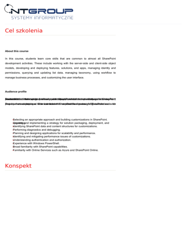Cel szkolenia About this course In this course, students learn core skills that are common to almost all SharePoint development activities. These include working with the server-side and client-side object models, developing and deploying features, solutions, and apps, managing identity and permissions, querying and updating list data, managing taxonomy, using workflow to manage business processes, and customizing the user interface. Audience profile The course products environment. candidates Server 2013. and are is While intended not technologies expected some for familiarity professional toinhave a team-based, prior with developers experience SharePoint medium-sized who with solution develop the new development solutions tofeatures large for indevelopment isSharePoint required, The ideal development projects that candidate are experience. deployed is a technical to The or interact candidate leadwith with isSharePoint responsible at least four environments. for years designing of SharePoint This custom includes: and codeweb for Selecting an appropriate approach and building customizations in SharePoint. Creating and implementing a strategy for solution packaging, deployment, and upgrading. Identifying SharePoint data and content structures for customizations. Performing diagnostics and debugging. Planning and designing applications for scalability and performance. Identifying and mitigating performance issues of customizations. Understanding authentication and authorization. Experience with Windows PowerShell. Broad familiarity with SharePoint capabilities. Familiarity with Online Services such as Azure and SharePoint Online. Konspekt Zapytaj o najlepszą ofertę:) At course completion After completing this course, students will be able to: Design and manage features and solutions. Develop code for custom server-side components. Manage and customize authentication and authorization. Create custom sites and lists and manage the site lifecycle. Explain the capabilities and design choices for SharePoint apps. Use the client-side object model and the REST API. Develop provider-hosted and auto-hosted SharePoint apps. Distribute and deploy SharePoint apps. Create custom workflows to automate business processes. Use fields and content types to manage taxonomy. Customize the appearance and behavior of user interface elements. Customize navigation and site branding. Nazwa: Czas trwania: 5 dni Ilość godzin: 40 Język: Prowadzący: Autoryzowany trener Lokalizacja: NT Group Łódź, siedziba klienta, lub dowolne miasto w Polsce Cena szkolenia: Cena do uzgodnienia. Prosimy o kontakt: 801 011 684 Dodatkowe informacje W cenę szkolenia wliczony jest: Certyfikat Microsoft Materiały szkoleniowe, notatnik, długopis Kontakt z trenerem po szkoleniu Kawa, herbata, słodki poczęstunek Obiad Szkolenie MS 20488: Developing Microsoft SharePoint® Server 2013 Core Solutions Dostępne terminy Firma posiada wpis w Urzędzie Miasta Łodzi jako placówka kształcenia ustawicznego. 19 czerwca 2017 18 września 2017 18 września 2017 NT Group Systemy Informatyczne Sp. z o.o. Krajowy Rejestr Sądowy Konto Bankowe 90-418 Łódź, Al. T. Kościuszki 39 III piętro KRS 0000214993 Kredyt Bank S.A. tel.: +42 6553377 Sąd Rejonowy dla Łodzi-Śródmieścia Rozliczenie Krajowe: tel. / fax. +42 6301563 w Łodzi, XX Wydział KRS 71 1500 1246 1215 4005 5991 0000 e-mail: [email protected] www.ntgroup.pl Rozliczenie Zagraniczne: Regon: 470557218 PL 71 1500 1246 1215 4005 5991 0000 NIP: 7251888624 KRDBPLPW