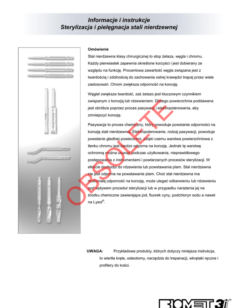Informacje i instrukcje Sterylizacja i pielęgnacja stali nierdzewnej Omówienie Stal nierdzewna klasy chirurgicznej to stop żelaza, węgla i chromu. Każdy pierwiastek zapewnia określone korzyści i jest dobierany ze względu na funkcję. Procentowa zawartość węgla związana jest z twardością i zdolnością do zachowania ostrej krawędzi tnącej przez wiele zastosowań. Chrom zwiększa odporność na korozję. Węgiel zwiększa twardość, zaś żelazo jest kluczowym czynnikiem związanym z korozją lub rdzewieniem. Dlatego powierzchnia poddawana zmniejszyć korozję. TE jest obróbce poprzez proces pasywacji i elektropolerowania, aby Pasywacja to proces chemiczny, który powoduje powstanie odporności na LE korozję stali nierdzewnej. Elektropolerowanie, rodzaj pasywacji, powoduje powstanie gładkiej powierzchni, dzięki czemu warstwa powierzchniowa z tlenku chromu jest bardzo odporna na korozję. Jednak tę warstwę O ochronną można usunąć podczas użytkowania, nieprawidłowego postępowania z instrumentami i powtarzanych procesów sterylizacji. W BS efekcie dochodzi do rdzewienia lub powstawania plam. Stal nierdzewna nie jest odporna na powstawanie plam. Choć stal nierdzewna ma doskonałą odporność na korozję, może ulegać odbarwieniu lub rdzewieniu O pod wpływem procedur sterylizacji lub w przypadku narażenia jej na środku chemiczne zawierające jod, fluorek cyny, podchloryn sodu a nawet ® na Lysol . UWAGA: Przykładowe produkty, których dotyczy niniejsza instrukcja, to wiertła kręte, osteotomy, narzędzia do trepanacji, wkrętaki ręczne i profilery do kości. Zalecane procedury czyszczenia i sterylizacji instrumentarium chirurgicznego Instrukcja użytkowania Aby zachować jakość instrumentarium firmy BIOMET 3i, należy przestrzegać poniższych procedur. 1. Po użyciu włożyć wiertła i instrumenty do zlewki z wodą i łagodnym roztworem mydła lub specjalnym roztworem czyszczącym. 2. Płukać wodą użytkową przez co najmniej dwie (2) minuty, czyszcząc jednocześnie szczotką z miękkim włosiem, aby usunąć widoczne zanieczyszczenia. Wyczyścić wewnętrzne światło cienkim drutem, aby usunąć wszelkie pozostałe zanieczyszczenia. Czyszczenie 3. Umieścić instrumenty w łaźni ultradźwiękowej zawierającej detergent enzymatyczny, na pięć (5) minut*. Ponownie wyszorować instrumenty szczotką z miękkim włosiem i wyczyścić wewnętrzne światło, aby usunąć wszelkie pozostałe zanieczyszczenia. 4. Płukać instrumenty wodą użytkową przez jedną (1) minutę. 5. Sprawdzić wizualnie pod kątem pozostałości fragmentów tkanki kostnej lub TE zanieczyszczeń i wyszorować, jeśli to konieczne. 6. Wyjąć stojak do wierteł z tacy chirurgicznej. Wyszorować tacę chirurgiczną i stojak szczotką z miękkim włosiem, używając łagodnego mydła. Dokładnie wypłukać. LE 7. Umieścić komponenty w tacy chirurgicznej i nalać alkoholu etylowego (nie używać alkoholu izopropylowego) na wiertła i tacę, aby usunąć pozostałości mydła i minerałów z wody. Ten etap jest istotny, aby pomóc zapobiegać korozji i powstawaniu plam. Sterylizacja BS O 8. Owinąć dwukrotnie tacę chirurgiczną w papier lub torby dopuszczone do stosowania w autoklawie, aby zapobiec rozerwaniu się zewnętrznego opakowania w celu ochrony z zanieczyszczonymi instrumentami. 9. Grawitacyjna sterylizacja parowa Zestawy NPSDK0, NCATD0, NCATD0C, SGKIT, SGTIKIT: Tace PSDT1, SGTRAY, SGTTRAY: Co najmniej czterdzieści (40) minut w temperaturze 132–135ºC (270–275ºF) Wszystkie pozostałe zestawy i tace: Co najmniej dwadzieścia (20) minut w temperaturze 132–135ºC (270–275ºF) O lub Metoda sterylizacji z próżnią wstępną (wszystkie zestawy) Co najmniej cztery (4) minuty (cztery impulsy) w temperaturze 132–135ºC (270–275ºF) UWAGA: Ponieważ firma BIOMET 3i nie zna indywidualnych procedur dotyczących postępowania klinicznego, metod czyszczenia, poziomów obciążenia biologicznego ani żadnych innych warunków, firma BIOMET 3i nie przyjmuje odpowiedzialności za sterylizację produktu nawet w przypadku postępowania zgodnie z powyższymi wytycznymi. 10. Po sterylizacji urządzenia należy dokładnie wysuszyć, aby zmniejszyć ryzyko korozji stali nierdzewnej (typowo jest to 30 minut). Informacje dotyczące pozostałych czynności pielęgnacyjnych i dotyczących czyszczenia podano w Instrukcji dotyczącej chirurgii i przywracania stanu urządzeń firmy BIOMET 3i. UWAGA: Czas suszenia może być różny w zależności od wielkości wkładu. UWAGA: Wielokrotna sterylizacja może wpływać na przepływ płynu w wiertłach z wewnętrzną irygacją. Po każdym użyciu i przed cyklem sterylizacyjnym należy każde wiertło wyczyścić drutem, aby usunąć wszelki fragmenty kości lub zanieczyszczenia, które uniemożliwiałyby przepływ wody. Bardzo ważne jest, aby nie wyjmować wierteł, instrumentarium ani tacy chirurgicznej z autoklawu do czasu zakończenia „cyklu suszenia”. Te wytyczne NIE DOTYCZĄ czyszczenia i sterylizacji instrumentarium z zasilaniem. Proszę przestrzegać instrukcji podanych przez producenta instrumentarium z zasilaniem. Te zalecenia zostały zwalidowane przez firmę BIOMET 3i i uzyskano następujące wyniki: Czyszczenie: Średnie zmniejszenie liczby oznaczanych zarodników w skali LOG10 do 4,58. Sterylizacja: 10-6 SAL. *Detergent enzymatyczny ENZOL był stosowany do walidacji tego procesu zgodnie z zaleceniami producenta dotyczącymi rozcieńczania. Zalecane procedury czyszczenia i sterylizacji instrumentarium chirurgicznego (ciąg dalszy) Obserwacje ogólne: Czyszczenie Zapobiegać zasychaniu krwi na instrumentach, czyszcząc je możliwie jak najszybciej po użyciu. Jeśli wyczyszczenie w krótkim czasie nie jest możliwe, należy namoczyć instrument. Enzymatyczne środki czyszczące trawią białka krwi i tkankę szybciej niż zwykłe środki czyszczące. Przed sterylizacją należy wyczyścić instrumenty nieżrącym, nisko