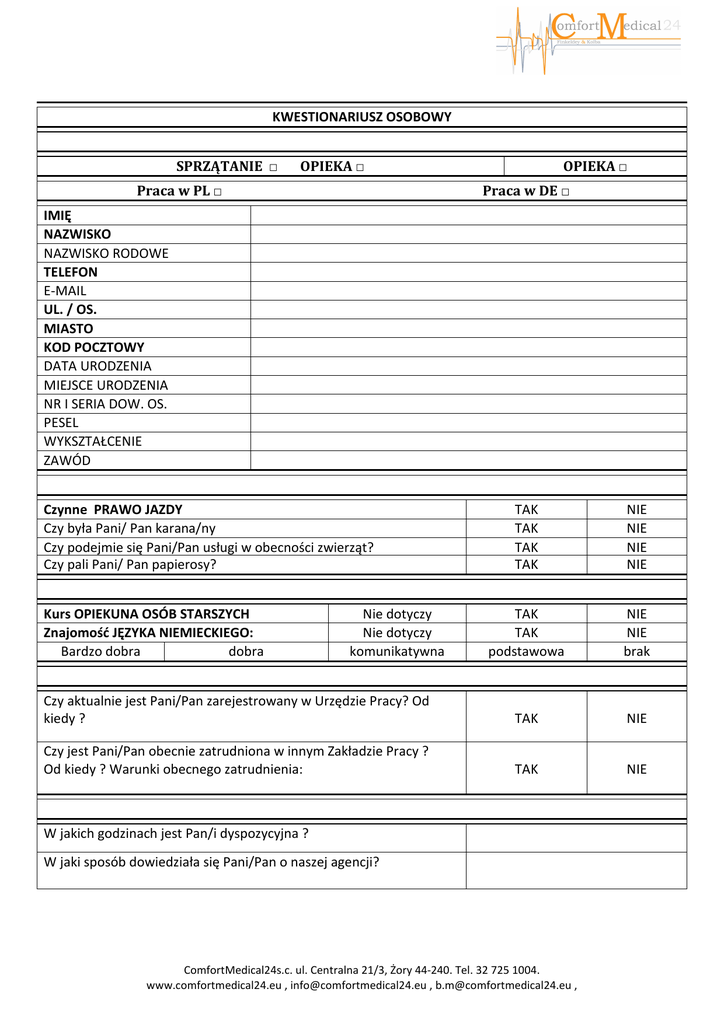 KWESTIONARIUSZ OSOBOWY SPRZĄTANIE OPIEKA OPIEKA