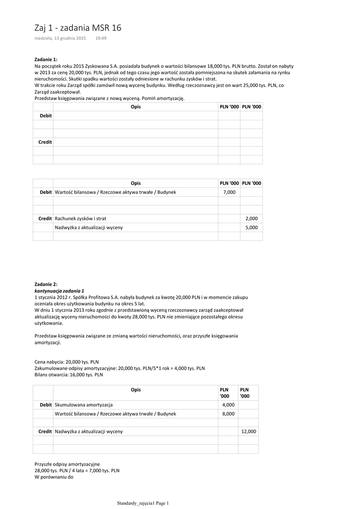 Zaj 1 - zadania MSR 16 niedziela, 13 grudnia 2015 19:49 Zadanie 1: Na początek roku 2015 Zyskowana S.A. posiadała budynek o wartości bilansowe 18,000 tys. PLN brutto. Został on nabyty w 2013 za cenę 20,000 tys. PLN, jednak od tego czasu jego wartość została pomniejszona na skutek załamania na rynku nieruchomości. Skutki spadku wartości zostały odniesione w rachunku zysków i strat. W trakcie roku Zarząd spółki zamówił nową wycenę budynku. Według rzeczoznawcy jest on wart 25,000 tys. PLN, co Zarząd zaakceptował. Przedstaw księgowania związane z nową wyceną. Pomiń amortyzację. Opis PLN '000 PLN '000 Opis PLN '000 PLN '000 Debit Credit Debit Wartość bilansowa / Rzeczowe aktywa trwałe / Budynek 7,000 Credit Rachunek zysków i strat 2,000 Nadwyżka z aktualizacji wyceny 5,000 Zadanie 2: kontynuacja zadania 1 1 stycznia 2012 r. Spółka Profitowa S.A. nabyła budynek za kwotę 20,000 PLN i w momencie zakupu oceniała okres użytkowania budynku na okres 5 lat. W dniu 1 stycznia 2013 roku zgodnie z przedstawioną wyceną rzeczoznawcy zarząd zaakceptował aktualizację wyceny nieruchomości do kwoty 28,000 tys. PLN nie zmieniające pozostałego okresu użytkowania. Przedstaw księgowania związane ze zmianą wartości nieruchomości, oraz przyszłe księgowania amortyzacji. Cena nabycia: 20,000 tys. PLN Zakumulowane odpisy amortyzacyjne: 20,000 tys. PLN/5*1 rok = 4,000 tys. PLN Bilans otwarcia: 16,000 tys. PLN Opis Debit Skumulowana amortyzacja PLN '000 PLN '000 4,000 Wartość bilansowa / Rzeczowe aktywa trwałe / Budynek Credit Nadwyżka z aktualizacji wyceny Przyszłe odpisy amortyzacyjne 28,000 tys. PLN / 4 lata = 7,000 tys. PLN W porównaniu do 20,000 tys. PLN/5*1 rok = 4,000 tys. PLN -> P&L Standardy_zajęcia1 Page 1 8,000 12,000 20,000 tys. PLN/5*1 rok = 4,000 tys. PLN -> P&L Nadwyżka 3,000 tys. Opis PLN '000 Debit Nadwyżka z aktualizacji wyceny PLN '000 3,000 Credit Zyski zatrzymane 3,000 Zadanie 3 Spółka Produkujemy S.A. posada maszynę produkcyjną zakupioną w dniu 1 stycznia 2010 roku za cenę 28,000 tys. PLN. W momencie zakupu Zarząd ocenił okres użytkowania maszyny na 7 lat. W dniu 1 stycznia 2012 Zarząd podjął decyzję, że maszyna będzie używana przez z następne dwa lata i później może zostać sprzedana z 10,000 tys. PLN. Przedstaw wartość odpisów amortyzacyjnych w latach 2010-2014. PLN '000 Cena nabycia: 28,000 Odpis amortyzacyjny 2010 28,000/7 lata (4,000) Odpis amortyzacyjny 2011 28,000/7 lata (4,000) Wartość bilansowa 31/12/2011 20,000 Odpis amortyzacyjne 2012 (20,000-10,000)/2 (5,000) Odpis amortyzacyjne 2013 (20,000-10,000)/2 (5,000) Zadanie 4 Spółka Niezdecydowani Sp. z o.o. kupiła 1 stycznia 2014 roku maszynę za cenę 22,000 tys. PLN. Zarząd planuje następujące wielkości produkcji w poszczególnych latach. Rok Wielkość produkcji w szt. 1 100 2 100 3 200 4 50 5 50 Zarząd przewiduje, że po 5 latach maszyna zostanie sprzedana za 2,000 tys. PLN. Przygotuj plan odpisów amortyzacyjnych dla maszyny korzystając z metod: a) Liniowej b) Degresywnej (przy stawce 30%) c) Opartej o planowaną wielkość produkcji Liniowa: (22,000-2,000)/5=4,000 tys. PLN Degresywna: Rok Amortyzacja PLN '000 1 22,000*30% 6,600 2 (22,000-6,600)*30%=15,400*30% 4,620 3 (15,400-4,620)*30%=10,780*30% 3,234 4 (10,780-3,234)*30%=5,282*30% 1,585 5 Do wartości 2,000: 5,282-1,585-2,000 1,698 Planowana produkcja: Wartość amortyzacji na jednostkę produktu: (22,000-2,000)/(100+100+200+50+50)=40 Rok Wielkość produkcji w szt. PLN '000 1 100 4,000 2 100 4,000 Standardy_zajęcia1 Page 2 2 100 4,000 3 200 8,000 4 50 2,000 5 50 2,000 Standardy_zajęcia1 Page 3