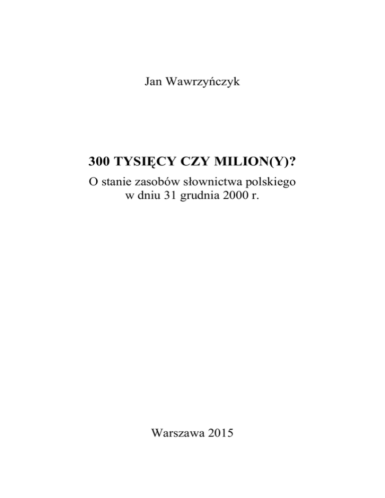 Jan Wawrzyńczyk 300 TYSIĘCY CZY MILION(Y)? O stanie zasobów słownictwa polskiego w dniu 31 grudnia 2000 r. Warszawa 2015 Copyright by Jan Wawrzyńczyk, Warszawa 2015 Recenzent: Stanisław Dubisz Wydawca: Mila Hoshi Warszawa 2015 Wyd. I. Obj. 0,6 a.w. Nakł. 20 egz. papierowych + egzemplarz elektroniczny (dostępny w Internecie) 2 Seules les affirmations vérifiées (et pas les assertions non vérifiées ou non vérifiables) contribuent au progrès de la science. Witold Mańczak 3 4 Spis treści Wstęp ........................................................................................................................................ 7 Bogactwo polskiej leksyki w świetle rejestrów słownikowych ................................................ 8 „Grube miliony”, czyli bogactwo polskiej leksyki w świetle zasobów tekstowych ................. 9 Bibliografia ............................................................................................................................. 13 5 6 Wstęp Sprawom i sprawkom, konkretom materii leksykograficznej, omawianym w niniejszej broszurze, poświęciłem już nieco uwagi w kilku swoich wcześniejszych publikacjach. Tu wracam do nich celowo, powtarzając się po trosze autoplagiatowo, ponieważ pewne istotne sądy występujące w literaturze naukowej (i popularnonaukowej), z którymi się od dawna nie zgadzam, są nadzwyczaj trwałe, rozpowszechnione, trudne do wykorzenienia ze świadomości badaczy i niebadaczy, badaczek i niebadaczek, interesujących się (i pseudointeresujących się) zasobami polskiego słownictwa od końca XVIII w. do współczesności. W szczególności chodzi mi tutaj o dzień zamykający wiek XX. W „Poradniku Językowym” − jednym z najważniejszych, najbardziej zasłużonych czasopism polskiej i światowej polonistyki językoznawczej − opublikowana została w roczniku 2014, w zeszycie 6., na jego końcu, dwustronicowa1 notatka pt.: „Życie” wyrazów2. Brak w niej aparatu bibliograficznego i przypisów, co nie jest przecież jej skazą, ponieważ została umieszczona w kąciku felietonowym pisma. Ma charakter ogólnoinformacyjny, to luźna, niemniej − zapewne nie tylko moim zdaniem − nadzwyczaj interesująca wypowiedź, która ze względu na wskazaną wyżej rangę miesięcznika będzie niewątpliwie kształtowała świadomość naukową obecnych (a także, niewykluczone, paru przyszłych) pokoleń polonistek i polonistów. Informacja kwantytatywno-chronologiczna zawarta w notatce S. D. może stać się na długie lata istotnym elementem ich wiedzy o dziejach zasobów leksykalnych polszczyzny. Leksyka to jeden z fundamentalnych składników dziedzictwa kulturalnego i materialnego każdego narodu − jak dzieła sztuki, krajobrazy, wraz z naniesionymi na nie budynkami, budowlami i innymi obiektami (o różnym stopniu trwałości). Leksyka to artefakty. Przyroda nie daje człowiekowi słów, on je wytwarza, wszystkie pokolenia ludzkie są ich producentami, zachowują je w swym dorobku kultury duchowej i materialnej. Zasadne jest zainteresowanie ilością, głębsza refleksja, czy dany język ma bogate słownictwo3. Można zapytać, czy 300 000 S. D. jako pewien próg, hasłownikowy limes, w rozwoju ilościowym polskiej leksyki, na ostatni dzień 2000 r., to liczba wiarygodna. Najwybitniejszy współczesny polski językoznawca, Andrzej Bogusławski, już przed wielu laty wskazywał, że jest ich − jednostek języka („wyrazów i frazeologizmów” S. D.) − 1 Formalnie są to strony 132-134 (pełna jest tylko strona 133). Podpisana inicjałami (S. D.). 3 Poznawanie słownictwa, jego cech ilościowo-jakościowych to ciężka praca, praca na polu kultury. Potrzebni są zapaleni szperacze, ludzie obdarzeni bzikiem lingwistyczno-filologicznym (wyrażenie Juliana Tuwima) do jej wykonywania. Ten szperacki trud zasługuje w pełni na uwznioślenie. Posłużę się w tym celu następującym cytatem z tegoż pisarza − jednego z największych w naszych dziejach miłośników polszczyzny: „Wrócę wkrótce (za kilka miesięcy) do kraju i jak opętany zabiorę się do takiej właśnie pracy, jaką robił Kraszewski: wydobywanie z ukrycia nieznanych skarbów naszej kultury, odkopywanie rzeczy nieznanych lub zapomnianych a pięknych i istotnych.” (Tuwim J. 1979: 87 [fragment listu z 1945 r.]) 2 7 znacznie więcej, mówiąc przy różnych okazjach o grubych milionach. Stykamy się zatem tutaj z bardzo poważną kontrowersją kwantytatywną. Bogactwo polskiej leksyki w świetle rejestrów słownikowych 280 000 wyrazów – taką liczbę podaje Witold Doroszewski w swojej prezentacji Słownika warszawskiego4. Nie ma potrzeby pisać tu, jakie to kategorie jednostek złożyły się na hasłownik ośmiotomowego dzieła Jana Karłowicza, Adama Kryńskiego i Władysława Niedźwiedzkiego, ponieważ w niniejszym bardzo krótkim z założenia przeglądzie idzie jedynie o ilościowe osiągnięcia polskiej leksykografii jednojęzycznej. Drugie miejsce – z liczbą ok. 240 000 wyrazów – zajmuje nie słownik ogólny języka polskiego, lecz specjalne opracowanie leksykograficzne: dwutomowy Indeks alfabetyczny wyrazów z kartoteki „Słownika gwar polskich” pod red. Jerzego Reichana (1999). Na s. VI tomu 1. tej pożytecznej edycji sformułowane zostało (zaskakujące) zdanie-samoocena, że ów indeks jest prawdopodobnie największym zbiorem wyrazów polskich. Dość znaczna różnica między liczbą pierwszą a drugą (40 000) nie ma jednak większego znaczenia, ponieważ dotychczasową statystykę wyrazów hasłowych polszczyzny komplikuje znana kwestia oboczności form fonetycznych, akurat w tych dwu publikacjach znajdująca szczególne odzwierciedlenie. Na miejscu trzecim listy najgęstszych siatek haseł polskiego słownictwa ogłoszonych drukiem lokuje się inne cenne dzieło pt.: Wielki słownik ortograficzno-fleksyjny (zob. JanikPłocińska B., Sas M., Turczyn R. 2001). Na s. IV jego okładki umieszczona