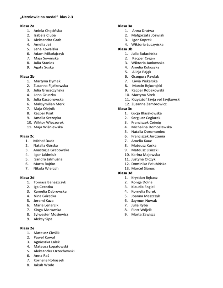 „Uczniowie na medal” klas 2-3 Klasa 2a 1. Aniela Chęcioska 2. Izabela Ciuba 3. Aleksandra Grab 4. Amelia Jeż 5. Lena Kowalska 6. Adam Mikołajczyk 7. Maja Sowioska 8. Julia Stanios 9. Agata Suska Klasa 2b 1. Martyna Dymek 2. Zuzanna Fijałkowska 3. Julia Gruszczyoska 4. Lena Gruszka 5. Julia Kaczorowska 6. Maksymilian Merk 7. Maja Olejnik 8. Kacper Psut 9. Amelia Szczepka 10. Wiktor Wieczorek 11. Maja Wiśniewska Klasa 2c 1. Michał Duda 2. Natalia Górska 3. Anastazja Grabowska 4. Igor Jakimiuk 5. Sandra Jałmużna 6. Marta Rajtko 7. Nikola Wierzch Klasa 2d 1. Tomasz Banaszczyk 2. Iga Cecotka 3. Kamelia Dąbrowska 4. Nina Górecka 5. Jeremi Kuza 6. Maria Lenarcik 7. Kinga Morawska 8. Sylwester Mosiewicz 9. Aleksy Sipa Klasa 2e 1. Mateusz Cieślik 2. Paweł Kowal 3. Agnieszka Lalek 4. Mateusz Łopatowski 5. Aleksander Orzechowski 6. Anna Raś 7. Kornelia Robaszek 8. Jakub Wodo Klasa 3a 1. Anna Dratwa 2. Małgorzata Józwiak 3. Igor Koprek 4. Wiktoria Łuczyoska Klasa 3b 1. Julia Bułacioska 2. Kacper Cygan 3. Wiktoria Jankowska 4. Amelia Kokoszka 5. Alicja Pająk 6. Grzegorz Pawlak 7. Liwia Piekarska 8. Marcin Rękorajski 9. Kacper Robakowski 10. Martyna Sitek 11. Krzysztof Szyja vel Szyjkowski 12. Zuzanna Zambrowicz Klasa 3c 1. Łucja Błaszkowska 2. Sergiusz Ceglarek 3. Franciszek Cejnóg 4. Michalina Domosławska 5. Natalia Doromoniec 6. Franciszek Jurczenia 7. Amelia Kauc 8. Mateusz Kuska 9. Mateusz Lisiecki 10. Karina Majewska 11. Justyna Olczyk 12. Dominika Połubioska 13. Marcel Sianos Klasa 3d 1. Krystian Bębacz 2. Konga Dolna 3. Klaudia Fogiel 4. Kornelia Kurek 5. Joanna Meszczyk 6. Szymon Nowak 7. Julia Ryba 8. Piotr Wójcik 9. Marta Zawisza