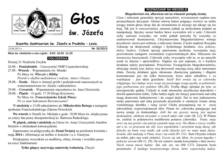 Głos św. Józefa Gazetka Sanktuarium św. Józefa w Prudniku – Lesie. Nr 32/2013 25.08.2013 r. Msze św. niedzielne u nas o godz.: 8.00 10.00 11.30 OGŁOSZENIA Dzisiaj 21 Niedziela Zwykła 26.08. - Poniedziałek – Uroczystość NMP Częstochowskiej 27.08 - Wtorek – Wspomnienie św. Moniki Po Mszy św. Wieczór z Biblią: Prorok w służbie małżeństwa i rodziny: Amos i Ozeasz. 28.08. - Środa – Msza w intencji próśb i podziękowań zanoszonych za wstawiennictwem św. Józefa i nabożeństwo. 29.08. - Czwartek – Wspomnienie męczeństwa św. Jana Chrzciciela 30.08. - Piątek – O godz. 17.30 Droga Krzyżowa. Po Mszy św. Franciszkańska Szkoły Wiary: Po co nam Sakrament Bierzmowania? W niedzielę o 15.00 nabożeństwo do Miłosierdzia Bożego a następnie spotkanie Franciszkańskiego Zakonu Świeckich. We wtorek w Parafii św. Michała o godz. 18.00 Msza św. dziękczynna za cztery lata pracy duszpasterskiej ks. Bartosza Radeckiego. W piątek, sobotę i niedzielę na Górze św. Anny Uroczystość Aniołów Stróżów z obchodami kalwaryjskimi. Zapraszamy na pielgrzymkę do Ziemi Świętej na przełomie kwietnia i maja 2014 r. Informacje na stoliku w kościele i u o. Faustyna. Dziękujemy wszystkim za modlitwę, ofiary, kwiaty i wszelkie prace na rzecz Sanktuarium. Tylko głupcy nazywają samowolę wolnością. (Tacyt) ROZWAŻANIE NA NIEDZIELĘ Błogosławieni cisi, albowiem oni na własność posiądą ziemię. Cisza i milczenie generalnie sprzyja namysłowi, wywarzonym osądom oraz przemyślanym decyzjom. Głośno mówią ludzie pragnący zwrócić na siebie uwagę; tonem głosu chcąc dać do zrozumienia że niczego ani nikogo się nie boją. Tak jest w rzeczywistości, zarazem jednak są niesłychanie podatni na manipulację. Sprytny oszust bardzo łatwo wywiedzie ich w pole. Człowiek cichy zauważa wszystko, nie widzi jednak potrzeby by wszystko co zaobserwował skomentować. Chrystusowemu błogosławieństwu wtóruje przysłowie: mowa jest srebrem, a milczenie złotem. Z kolei mądrość Rosyjska wskazuje na skuteczność cichego i dyskretnego działania: tisze jedziesz, dalsze budiesz. Cichość sprzyja sprawnemu myśleniu, wyważaniu racji, przewidzeniu następstw ewentualnie wypowiedzianych słów. Milczeniu nie towarzyszy bezczynność. Człowiek cichy zwyczajnie robi to, co po namyśle uznał za słuszne i sprawiedliwe. Nigdzie nie jest napisane, że o każdym działaniu należy powiadomić. Przeciwnie: Ewangeliczne błogosławieństwo, obiecując ziemię tym, którzy swą aktywność otaczają ciszą, takie mniemanie obala. Zresztą działanie gęsto okraszane chaotyczną gadaniną i długimi komentarzami jest nie tylko bezowocne; bywa także szkodliwe i, co ważniejsze – jest także grzechem: Jeżeli ktoś uważa się za człowieka religijnego, lecz łudząc serce swoje nie powściąga swego języka, to pobożność jego pozbawiona jest podstaw (Jk1,26). Trzeba długo sprzątać po tym, co nawyprawiały gaduły. Cichość to znak nieomylny psychicznej dojrzałości i dowód opanowania siebie. Tylko ludzie nigdy nie tracący panowania nad sobą mogą skutecznie funkcjonować i do czegoś dojść. Ileż to razy jednorazowa utrata panowania nad sobą przyniosła przyniosła w smutnym wianie utratę wieloletniego dorobku i ruinę życia! Chyba przynajmniej raz w życiu żałowaliśmy wypowiedzianych słów. Pismo św. człowieka panującego nad mową uznaje za doskonałego: Jeśli kto nie grzeszy mową, jest mężem doskonałym, zdolnym utrzymać w ryzach także całe ciało (Jk 3,2). W Piśmie św. cichość to podstawowa modlitewna postawa człowieka: Panie, moje serce się nie pyszni i nie patrzą wyniośle moje oczy. Nie dbam o rzeczy wielkie ani o to, co przerasta me siły. Lecz uspokoiłem i uciszyłem moją duszę; jak dziecko na łonie swej matki, jak ciche dziecko jest we mnie moja dusza. Izraelu, złóż nadzieję w Panu, teraz i na wieki (Ps 131). Sam Chrystus wskaże na siebie, jako ona wzór cichości: Uczcie się ode Mnie, bo jestem łagodny i pokorny sercem (Mt 11, 29). On też zostawi zasadę korzystania z daru mowy: Niech wasza mowa będzie: Tak, tak; nie, nie (Mt 5,37). Zarazem Jezus przestrzeże: Z każdego bezużytecznego słowa, które wypowiedzą ludzie, zdadzą sprawę w dzień sądu. (Mt 12,36). Do rozsądnego korzystania z daru mowy wzywa także Apostoł Narodów: Mowa wasza, zawsze miła, niech będzie zaprawiona solą, tak byście wiedzieli, jak należy każdemu odpowiadać. (Kol 4,6). Trwanie w ciszy to progowy warunek modlitwy, będącej ponad wszystko słuchaniem Boga: Mów Panie, bo sługa Twój słucha (1Sm 3,10). Cichość bazuje na prawidłowym przekonaniu, że nie zawsze i nie w każdej sytuacji należy coś powiedzieć. Jezus pozostaje w milczeniu wystawiony na pośmiewisko, nie rozmawia z Herodem. W czasie Męki mówi wtedy, kiedy jest to słuszne lub niesie pociechę człowiekowi. By móc długo radować się jakimkolwiek duchowym czy materialnym dobrem, trzeba najpierw pokonać przeszkodę myślenia magicznego. To ono jest pożywką wielomówstwa. Myślenie magiczne próbuje zaklinać rzeczywistość: albo słowotokiem albo podniesionym tonem głosu, albo jednym i drugim jednocześnie. Ktoś ulegający myśleniu magicznemu może coś zdobyć tylko przypadkiem, nigdy jednak zdobyczy ani nie powiększy ani nie pomnoży. Ludzie cisi nie trwonią sił na narzekanie, na krytykę, na potępianie w czambuł wszystkiego dookoła nich. Wolą przeznaczyć energię na tworzenie dobra. Chrystusowa obietnica dla ludzi cichych, nieskorych do szemrania nawiązuje bezpośrednio do kary wymierzonej przez Boga szemrzącym na pustyni Izraelitom: Datan i Abiram byli to właśnie ci, którzy jako przedstawiciele zgromadzenia powstali przeciw Mojżeszowi i Aaronowi ze zgrają Koracha podczas jej buntu przeciw Panu. Wtedy ziemia rozwarła swoją paszczę i pochłonęła ich i Koracha, podczas gdy zgraja ginęła strawiona przez ogień - dwustu