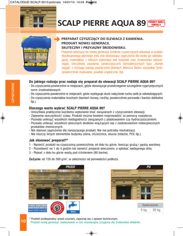 CATALOGUE-SCALP-2013:polonais 14/01/14 14:04 Page10 SCALP PIERRE AQUA 89 CZYSZCZĄCY DO ELEWACJI Z KAMIENIA. 2 PREPARAT PRODUKT NOWEJ GENERACJI. SKUTECZNY I PRZYJAZNY ŚRODOWISKU. Preparat należący do nowej generacji środków czyszczących elewacje w postaci tiksotropowego płynnego żelu (nie stanowiący zagrożenia dla osoby go nakładającej, materiałów, z których wykonany jest budynek oraz środowiska naturalnego). Umożliwia usuwanie zanieczyszczeń atmosferycznych typu „tlenek węgla” z różnego rodzaju powierzchni (Kamień, Marmur, Beton, wszystkie Tynki, powierzchnie malowane, powłoki organiczne, itp). CZYSZCZENIE Do jakiego rodzaju prac nadaje się preparat do elewacji SCALP PIERRE AQUA 89? - Do czyszczenia powierzchni w miejscach, gdzie obowiązuje przestrzeganie szczególnie rygorystycznych norm środowiskowych. - Do czyszczenia powierzchni w miejscach, gdzie występuje duże natężenie ruchu osób je odwiedzających. - Do czyszczenia materiałów kruchych (kamień licowy, rzeźby, powierzchnie porowate i bardzo delikatne itp.). Dlaczego warto wybrać SCALP PIERRE AQUA 89? - Umożliwia praktycznie każdemu wykonanie brać związanych z czyszczeniem elewacji. - Zapewnia oszczędność czasu. Produkt można bowiem rozprowadzić za pomocą rozpylacza. - Pozwala uniknąć wszelkich niedogodności związanych z piaskowaniem czy hydroczyszczeniem. - Pozwala uniknąć wszelkich ubocznych skutków wiążących się z zastosowaniem niebezpiecznych produktów chemicznych. - Nie stanowi zagrożenia dla nanoszącego produkt. Nie ma potrzeby neutralizacji. - Nie niszczy innych elementów budynku (okna, ościeżnica, okucia żelazne, PCV, itp.). Jak stosować preparat?* 1 - Nanieść produkt na czyszczoną powierzchnię od dołu ku górze, tworząc grubą i gęstą warstwę. 2 - Pozostawić na 1 do 4 godzin lub nanieść preparat wieczorem, a spłukać następnego dnia. 3 - Płukać z dołu ku górze wodą pod ciśnieniem (90 barów). Zużycie: od 150 do 300 g/m2, w zależności od porowatości podłoża. SCA RO Y 10 ŚĆ W SO LP P PRZED KA JAK O WODA * Produkt profesjonalny: przed użyciem, zapoznaj się z opisem technicznym. Produkt nowej generacji: zastosowano w nim innowacyjne, przyjazne dla środowiska składniki. PO Opakowanie 5 kg 20 kg