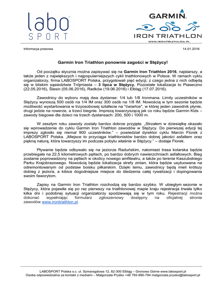 Informacja prasowa 14.01.2016 Garmin Iron Triathlon ponownie zagości w Stężycy! Od początku stycznia można zapisywać się na Garmin Iron Triathlon 2016, najstarszy, a także jeden z największych i najpopularniejszych cykli triathlonowych w Polsce. W ramach cyklu organizatorzy, firma LABOSPORT Polska, przygotowali pięć edycji, z czego jedna z nich odbędą się w bliskim sąsiedztwie Trójmiasta – 3 lipca w Stężycy. Pozostałe lokalizacje to Piaseczno (22.05.2016), Ślesin (05.06.2016), Radków (19.06.2016) i Elbląg (17.07.2016). Zawodnicy do wyboru mają dwa dystanse: 1/4 lub 1/8 Ironmana. Limity uczestników w Stężycy wynoszą 500 osób na 1/4 IM oraz 300 osób na 1/8 IM. Nowością w tym sezonie będzie możliwość wystartowania w trzyosobowej sztafecie na "ćwiartce", w której jeden zawodnik płynie, drugi jedzie na rowerze, a trzeci biegnie. Imprezą towarzyszącą jak co roku będzie Garmin Kids – zawody biegowe dla dzieci na trzech dystansach: 200, 500 i 1000 m. W zeszłym roku zawody zostały bardzo dobrze przyjęte. „Strzałem w dziesiątkę okazało się wprowadzenie do cyklu Garmin Iron Triathlon zawodów w Stężycy. Do pierwszej edycji tej imprezy zgłosiło się niemal 900 uczestników.” – powiedział dyrektor cyklu Marcin Florek z LABOSPORT Polska. „Miejsce to przyciąga triathlonistów bardzo dobrej jakości asfaltem oraz piękną naturą, która towarzyszy im podczas pobytu właśnie w Stężycy.” – dodaje Florek. Pływanie będzie odbywało się na jeziorze Raduńskim, natomiast trasa kolarska będzie przebiegała na 22,5 kilometrowych pętlach, po bardzo dobrych nawierzchniach asfaltowych. Bieg zostanie poprowadzony na pętlach w okolicy nowego amfiteatru, a także po terenie Kaszubskiego Parku Krajobrazowego. Nowością będzie lokalizacja strefy zmian, która będzie usytuowana na odremontowanym od podstaw boisku piłkarskim. Dzięki temu, zawodnicy będą mieli krótszy dobieg z jeziora, a kibice dogodniejsze miejsce do śledzenia całej rywalizacji i dopingowania swoim faworytom. Zapisy na Garmin Iron Triathlon rozchodzą się bardzo szybko. W ubiegłym sezonie w Stężycy, która pojawiła się po raz pierwszy na triathlonowej mapie kraju rejestracja trwała tylko kilka dni i podobnej sytuacji organizatorzy spodziewają się w tym roku. Rejestracji można dokonać wypełniając formularz zgłoszeniowy dostępny na oficjalnej stronie zawodów www.irontriathlon.pl. LABOSPORT Polska s.c. ul. Szmaragdowa 12, 82-300 Elbląg – Gronowo Górne www.labosport.pl Osoba odpowiedzialna za kontakt z mediami – Małgorzata Pryśko +48 793-990-794 [email protected]