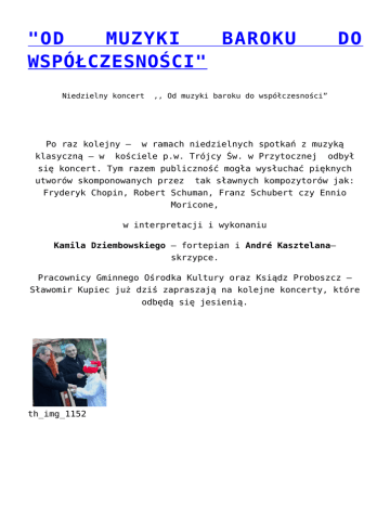 "OD MUZYKI BAROKU WSPÓŁCZESNOŚCI" Niedzielny koncert DO ,, Od muzyki baroku do współczesności” Po raz kolejny – w ramach niedzielnych spotkań z muzyką klasyczną – w kościele p.w. Trójcy Św. w Przytocznej odbył się koncert. Tym razem publiczność mogła wysłuchać pięknych utworów skomponowanych przez tak sławnych kompozytorów jak: Fryderyk Chopin, Robert Schuman, Franz Schubert czy Ennio Moricone, w interpretacji i wykonaniu Kamila Dziembowskiego – fortepian i André Kasztelana– skrzypce. Pracownicy Gminnego Ośrodka Kultury oraz Ksiądz Proboszcz – Sławomir Kupiec już dziś zapraszają na kolejne koncerty, które odbędą się jesienią. th_img_1152 th_img_1155 th_img_1163 th_img_1164 th_img_1165 th_img_1169 th_img_1172 th_img_1175 th_img_1183 th_img_1184 th_img_1185 th_img_1193 th_img_1198 th_img_1207 th_img_1210 th_img_1215 th_img_1218