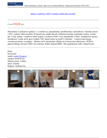 Dane pochodzą ze strony: http://www.stancje-lublin.pl/. Wygenerowano dnia: 08-03-2017. pokój 1 osobowy 450z? Unicka Lublin plus liczniki Cena:450,00 pln Mieszkanie 2 pokojowe (pokój 1 i 2 osobowy), samodzielne, umeblowane, rozk?adowe, ?azienka razem z WC, osobna ?adna kuchnia. Wyposa?one: pralka Bosch, lodówka Gorenje, kuchenka Amica, wanna itp. Cena: pokój 1 osobowy 450z? pokój 2 osobowy 650z? ca?e mieszkanie 1100z? Dodatkowo op?aty licznikowe: woda, pr?d, gaz (?rednio 70z? miesi?cznie na osob?) i internet. 1-miesi?czna kaucja zwrotna na koniec wynajmu. Bardzo mi?e mieszkanie. Blisko na Uniwersytet Medyczny, WSPiA, galeria Olmip, dworzec PKS i do centrum. Dobry dojazd MPK. Dla spokojnych osób i niepal?cych. Dane: Krzysztof email: [email protected] telefon: 661991324 Miejscowość: Lublin ulica: Unicka Region: ?ródmie?cie