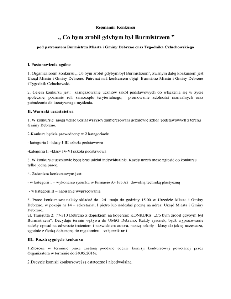 Regulamin Konkursu „ Co bym zrobił gdybym był Burmistrzem ” pod patronatem Burmistrza Miasta i Gminy Debrzno oraz Tygodnika Człuchowskiego I. Postanowienia ogólne 1. Organizatorem konkursu „ Co bym zrobił gdybym był Burmistrzem”, zwanym dalej konkursem jest Urząd Miasta i Gminy Debrzno. Patronat nad konkursem objął Burmistrz Miasta i Gminy Debrzno i Tygodnik Człuchowski. 2. Celem konkursu jest: zaangażowanie uczniów szkół podstawowych do włączenia się w życie społeczne, poznanie roli samorządu terytorialnego, promowanie zdolności manualnych oraz pobudzanie do kreatywnego myślenia. II. Warunki uczestnictwa 1. W konkursie mogą wziąć udział wszyscy zainteresowani uczniowie szkół podstawowych z terenu Gminy Debrzno. 2.Konkurs będzie prowadzony w 2 kategoriach: - kategoria I –klasy I-III szkoła podstawowa -kategoria II –klasy IV-VI szkoła podstawowa 3. W konkursie uczniowie będą brać udział indywidualnie. Każdy uczeń może zgłosić do konkursu tylko jedną pracę. 4. Zadaniem konkursowym jest: - w kategorii I – wykonanie rysunku w formacie A4 lub A3 dowolną techniką plastyczną - w kategorii II – napisanie wypracowania 5. Prace konkursowe należy składać do 24 maja do godziny 15.00 w Urzędzie Miasta i Gminy Debrzno, w pokoju nr 14 – sekretariat, I piętro lub nadesłać pocztą na adres: Urząd Miasta i Gminy Debrzno, ul. Traugutta 2; 77-310 Debrzno z dopiskiem na kopercie: KONKURS „Co bym zrobił gdybym był Burmistrzem”. Decyduje termin wpływu do UMiG Debrzno. Każdy rysunek, bądź wypracowanie należy opisać na odwrocie imieniem i nazwiskiem autora, nazwą szkoły i klasy do jakiej uczęszcza, zgodnie z fiszką dołączoną do regulaminu – załącznik nr 1 III. Rozstrzygnięcie konkursu 1.Złożone w terminie prace zostaną poddane ocenie komisji konkursowej powołanej przez Organizatora w terminie do 30.05.2016r. 2.Decyzje komisji konkursowej są ostateczne i nieodwołalne. 3.Wszelkie kwestie sporne i nieuregulowane niniejszym Regulaminem, dotyczące konkursu, rozstrzygane są przez Organizatora. 4. Wręczenie klucza do bram Miasta odbędzie się 04.06.2016r. podczas festynu z okazji Dnia Dziecka, który odbędzie, się na Rynku Miejskim w Debrznie. 5.Laureat konkursu każdej z kategorii otrzymuje tytuł „ Młodego Burmistrza Miasta i Gminy Debrzno” oraz możliwość wykonywania obowiązków Burmistrza dnia 01.06.2016r. przez jeden dzień pod opieką Burmistrza Miasta i Gminy Debrzno. IV. Postanowienia końcowe 1.Każdy Uczestnik konkursu oświadcza, że posiada autorskie prawa majątkowe do prac plastycznych i wypracowań i przenosi je na organizatora w zakresie niezbędnym do jego publikacji lub innego rozpowszechniania oraz jego opracowania w stopniu jaki organizator konkursu uzna za stosowny i wskazany dla prawidłowej realizacji założeń konkursu. 2.Autorskie prawa majątkowe zostają przez uczestnika konkursu przeniesione nieodpłatnie na rzecz organizatora bez ograniczeń terytorialnych , na polach eksploatacji wskazanych w art. 50 ustawy o prawie autorskim i prawach pokrewnych. 3.Osoby nadsyłające prace do konkursu wyrażają tym samym zgodę na przetwarzanie przez Organizatora swoich danych osobowych .