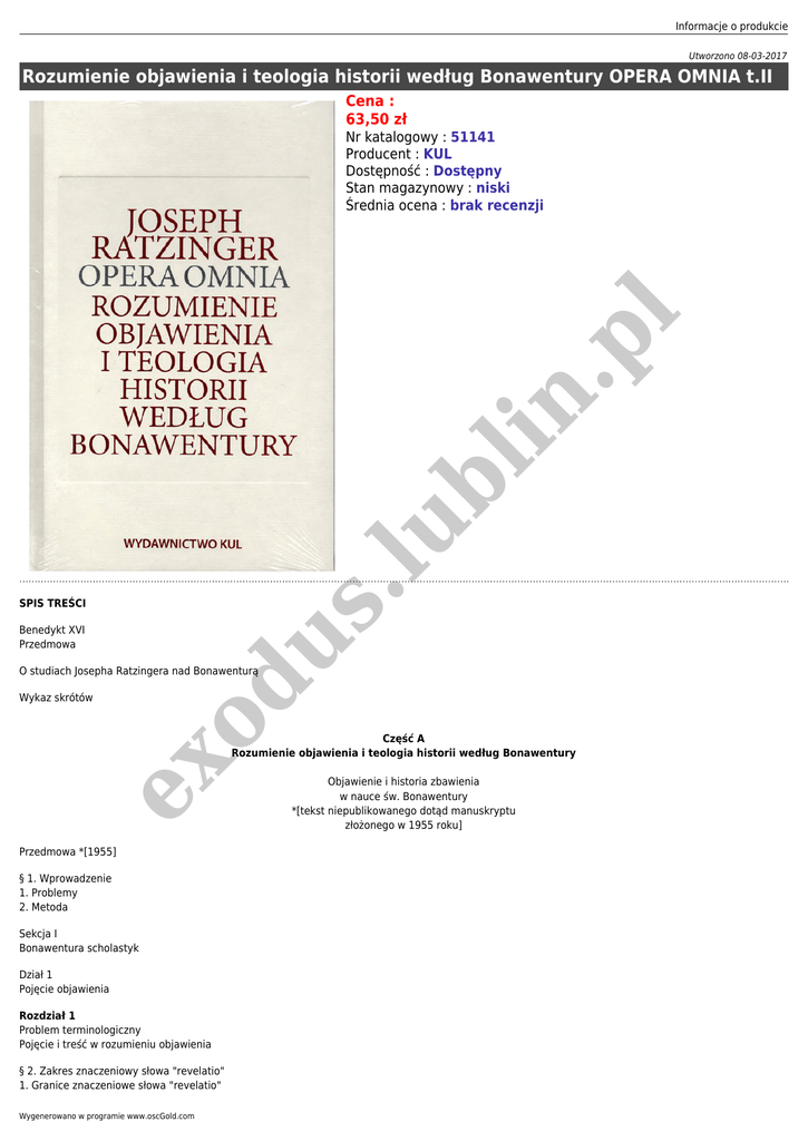 Informacje o produkcie Utworzono 08-03-2017 Rozumienie objawienia i teologia historii według Bonawentury OPERA OMNIA t.II Cena : 63,50 zł Benedykt XVI Przedmowa od us SPIS TREŚCI .lu bl in .p l Nr katalogowy : 51141 Producent : KUL Dostępność : Dostępny Stan magazynowy : niski Średnia ocena : brak recenzji O studiach Josepha Ratzingera nad Bonawenturą ex Wykaz skrótów Przedmowa *[1955] § 1. Wprowadzenie 1. Problemy 2. Metoda Sekcja I Bonawentura scholastyk Dział 1 Pojęcie objawienia Rozdział 1 Problem terminologiczny Pojęcie i treść w rozumieniu objawienia § 2. Zakres znaczeniowy słowa "revelatio" 1. Granice znaczeniowe słowa "revelatio" Wygenerowano w programie www.oscGold.com Część A Rozumienie objawienia i teologia historii według Bonawentury Objawienie i historia zbawienia w nauce św. Bonawentury *[tekst niepublikowanego dotąd manuskryptu złożonego w 1955 roku] 2. Wewnętrzna treść wyobrażenia "revelatio" a) Tradent objawienia b) Proces objawienia 3. Objawienie w historii a) "Revelatio" jako samoodsłonięcie się Boga w swoim Synu b) Formy urzeczywistnienia objawienia w historii § 3. Manifestatio 1. Własne noetyczne znaczenie "manifestatio" 2. Metafizyczne tło twierdzeń noetycznych a) "Manifestatio" w przyporządkowaniu do "światła" i "słowa" b) "Manifestatio" w kontekście problemu "theologia naturalis" 3. Podsumowanie § 5. Wiara a historia Początki teologii historii u Bonawentury 1. Jedność i zmienność wiary: Relacja Starego i Nowego Testamentu 2. Przeniesienie problemu na obszar Nowego Testamentu i jego historii 3. Schematy teologicznohistoryczne w Komentarzu do Sentencji a) Duchowe oznaki w triadzie "natura - lex - gratia" b) Duchowe oznaki określenia relacji Testamentów od us .lu § 6. Wiara i Kościół Relacja objawienia i Tradycji A. Dwie formy rozwoju wiary zgodnie z dwoma źródłami "objawienia" I. Rozwój wiary przez "revelatio" 1. Historiozbawcza wykładnia sporu o Filioque a pojęcie objawienia a) Wersja Bonawentury b) Porównanie z Aleksandrem z Hales i z Tomaszem z Akwinu c) Uzupełniająca uwaga terminologiczna o "revelatio" d) Kontekst historyczny Bonawenturowej teorii "revelatio" 2. Problem sporu o obrazy a pojęcie objawienia II. Rozwój wiary przez zewnętrzne słowo nauczania 1. Teologia jako "wyraz" wiary 2. Logika językowa u Bonawentury i jej znaczenie dla pojęcia objawienia 3. "Rozwój wiary" przez teologię B. Pojęcie "traditio" 1. Znaczenie słów "tradere", "traditio" i "traditiones" 2. Relacja Pisma i Tradycji bl § 4. Mowa Boga 1. Wewnątrztrynitarne uzasadnienie wydarzenia objawienia 2. Proces objawiającej mowy Boga a) Jedność czy dwoistość objawień? b) Słowo i światło Dodatek: Uwagi o problemie analogii in .p l Rozdział 2 Istota objawienia według nauki św. Bonawentury ex § 7. Wiara i doktryna: charakter czynu w objawieniu 1. Przyporządkowanie "doktryny" całemu procesowi objawienia a) Teksty św. Bonawentury b) Pojęcia pokrewne u innych scholastyków 2. Charakter czynu w prawdzie w pojęciu objawienia u Bonawentury a) "Veritas" i "virtus": charakter czynu w prawdzie b) "Fides" i "virtus": rzeczywisty charakter wiary Dodatek: Pojęcie "doctrina" w teologii historii Bonawentury Interpretacja Coll. in Hex. I 25-30 (Opera omnia V, 333n.) 1. Chrystus jako centrum historii 2. Rzeczywisty charakter historii: logika i historia 3. Logika i teologia 4. Jednorazowość i trwanie w historii. Problem "doctrina" Dział 2 Ujęcie historii zbawienia Rozdział 3 Relacja między historiozbawczym i metafizycznym sposobem postrzegania w teologii św. Bonawentury § 8. "Natura" i "supernaturalis": analiza historyczno-terminologiczna A. Natura 1. Porządek teoretycznonaukowy a) "Nauka o naturze" w przeciwieństwie do "nauki o duchu" b) "Naturalna" nauka w przeciwieństwie do teologii Informacje o produkcie in .p l 2. Natura - duch i pokrewne pary przeciwstawne a) Różne pary przeciwstawne tej grupy b) "Natura" - "voluntas" 3. Natura i łaska a) Prawo naturalne i prawo łaski b) Schematy pojęciowe 4. Podsumowanie Dodatek: Nauka Bonawentury o "desiderium naturale" 1. Źródła i treść Bonawenturiańskiej nauki o "desiderium" a) Komponenty teologiczne: Nauka o "acceptatio" i o "imago Dei" b) Komponenty filozoficzne 2. Metafizyka i historia zbawienia w nauce Bonawentury o "desiderium" B. "Supernaturalis" i pojęcia pokrewne 1. Teologiczne zastosowanie słów "super", "supra" itd. a) Uszeregowanie według Dionizego b) Uszeregowanie według Augustyna 2. "Supernaturalis" 3. Schematy pojęciowe C. Podsumowanie .lu bl § 9. Antropologia Bonawentury w konflikcie pomiędzy metafizycznym i historiozbawczym sposobem postrzegania 1. Pojęcie "imago Dei" a) "Umbra - vestigium - imago"; "vestigium - imago - similitudo" b) Miejsce "imago" w duszy człowieka c) Porównanie z Tomaszem z Akwinu d) Bonawentura i Tomasz w całości rozwoju nauki o "imago" 2. Podobieństwo do Boga przez łaskę a) Pojęciowość b) Podobieństwo do Boga jako dzieło Boga w człowieku c) Miejsce podobieństwa do Boga w człowieku Dodatek: Relacja historii zbawienia i metafizyki w nauce o poznaniu Bonawentury 1. Idea obrazu Bożego jako klucz do Bonawenturiańskiej nauki o oświeceniu 2. "Naturalne" i "nadprzyrodzone" oświecenie u Bonawentury Rozdział 4 Metodologiczna podstawa obydwu form myślenia w pojęciu teologii u Bonawentury od us § 10. Historyczne założenia Bonawenturiańskiego pojęcia teologii 1. Zmiana znaczenia pojęcia "theologia" w podziale nauk wczesnej scholastyki 1. Chrześcijaństwo jako prawdziwa filozofia 2. Rozwój pojęcia teologii chrześcijańskiej a) Teologia jako nauka praktyczna b) Teologia jako filozofia nadprzyrodzona 3. Stanowisko Hugona od św. Wiktora II. Wpływy teoretycznonaukowe spoza naukowej literatury podziału 1. Naukowy program Anzelma z Canterbury 2. "Τεολογία" Pseudo-Dionizego 3. Znaczenie Piotra Lombarda 4. Napływ motywów arystotelesowskich w Summie Aleksandra ex § 11. Myślenie historioz