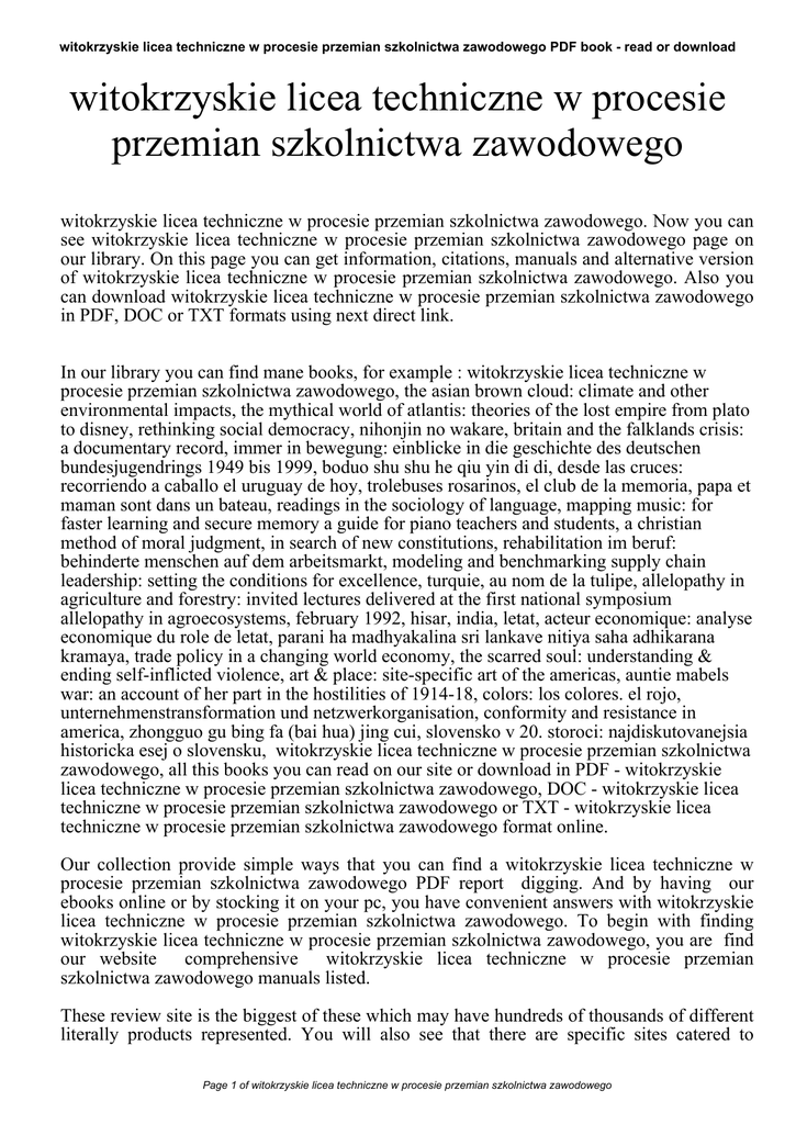 witokrzyskie licea techniczne w procesie przemian szkolnictwa zawodowego PDF book - read or download witokrzyskie licea techniczne w procesie przemian szkolnictwa zawodowego witokrzyskie licea techniczne w procesie przemian szkolnictwa zawodowego. Now you can see witokrzyskie licea techniczne w procesie przemian szkolnictwa zawodowego page on our library. On this page you can get information, citations, manuals and alternative version of witokrzyskie licea techniczne w procesie przemian szkolnictwa zawodowego. Also you can download witokrzyskie licea techniczne w procesie przemian szkolnictwa zawodowego in PDF, DOC or TXT formats using next direct link. In our library you can find mane books, for example : witokrzyskie licea techniczne w procesie przemian szkolnictwa zawodowego, the asian brown cloud: climate and other environmental impacts, the mythical world of atlantis: theories of the lost empire from plato to disney, rethinking social democracy, nihonjin no wakare, britain and the falklands crisis: a documentary record, immer in bewegung: einblicke in die geschichte des deutschen bundesjugendrings 1949 bis 1999, boduo shu shu he qiu yin di di, desde las cruces: recorriendo a caballo el uruguay de hoy, trolebuses rosarinos, el club de la memoria, papa et maman sont dans un bateau, readings in the sociology of language, mapping music: for faster learning and secure memory a guide for piano teachers and students, a christian method of moral judgment, in search of new constitutions, rehabilitation im beruf: behinderte menschen auf dem arbeitsmarkt, modeling and benchmarking supply chain leadership: setting the conditions for excellence, turquie, au nom de la tulipe, allelopathy in agriculture and forestry: invited lectures delivered at the first national symposium allelopathy in agroecosystems, february 1992, hisar, india, letat, acteur economique: analyse economique du role de letat, parani ha madhyakalina sri lankave nitiya saha adhikarana kramaya, trade policy in a changing world economy, the scarred soul: understanding & ending self-inflicted violence, art & place: site-specific art of the americas, auntie mabels war: an account of her part in the hostilities of 1914-18, colors: los colores. el rojo, unternehmenstransformation und netzwerkorganisation, conformity and resistance in america, zhongguo gu bing fa (bai hua) jing cui, slovensko v 20. storoci: najdiskutovanejsia historicka esej o slovensku, witokrzyskie licea techniczne w procesie przemian szkolnictwa zawodowego, all this books you can read on our site or download in PDF - witokrzyskie licea techniczne w procesie przemian szkolnictwa zawodowego, DOC - witokrzyskie licea techniczne w procesie przemian szkolnictwa zawodowego or TXT - witokrzyskie licea techniczne w procesie przemian szkolnictwa zawodowego format online. Our collection provide simple ways that you can find a witokrzyskie licea techniczne w procesie przemian szkolnictwa zawodowego PDF report digging. And by having our ebooks online or by stocking it on your pc, you have convenient answers with witokrzyskie licea techniczne w procesie przemian szkolnictwa zawodowego. To begin with finding witokrzyskie licea techniczne w procesie przemian szkolnictwa zawodowego, you are find our website comprehensive witokrzyskie licea techniczne w procesie przemian szkolnictwa zawodowego manuals listed. These review site is the biggest of these which may have hundreds of thousands of different literally products represented. You will also see that there are specific sites catered to Page 1 of witokrzyskie licea techniczne w procesie przemian szkolnictwa zawodowego witokrzyskie licea techniczne w procesie przemian szkolnictwa zawodowego PDF book - read or download different product categories or types, brands or niche categories related with witokrzyskie licea techniczne w procesie przemian szkolnictwa zawodowego. So depending on what exactly you are searching, you will be in a position to choose ebooks witokrzyskie licea techniczne w procesie przemian szkolnictwa zawodowego to fit your own needs, witokrzyskie licea techniczne w procesie przemian szkolnictwa zawodowego. Page 2 of witokrzyskie licea techniczne w procesie przemian szkolnictwa zawodowego